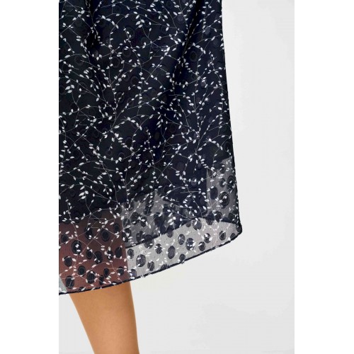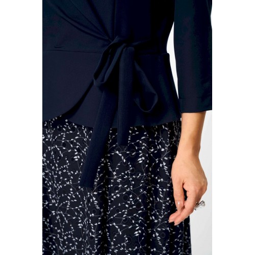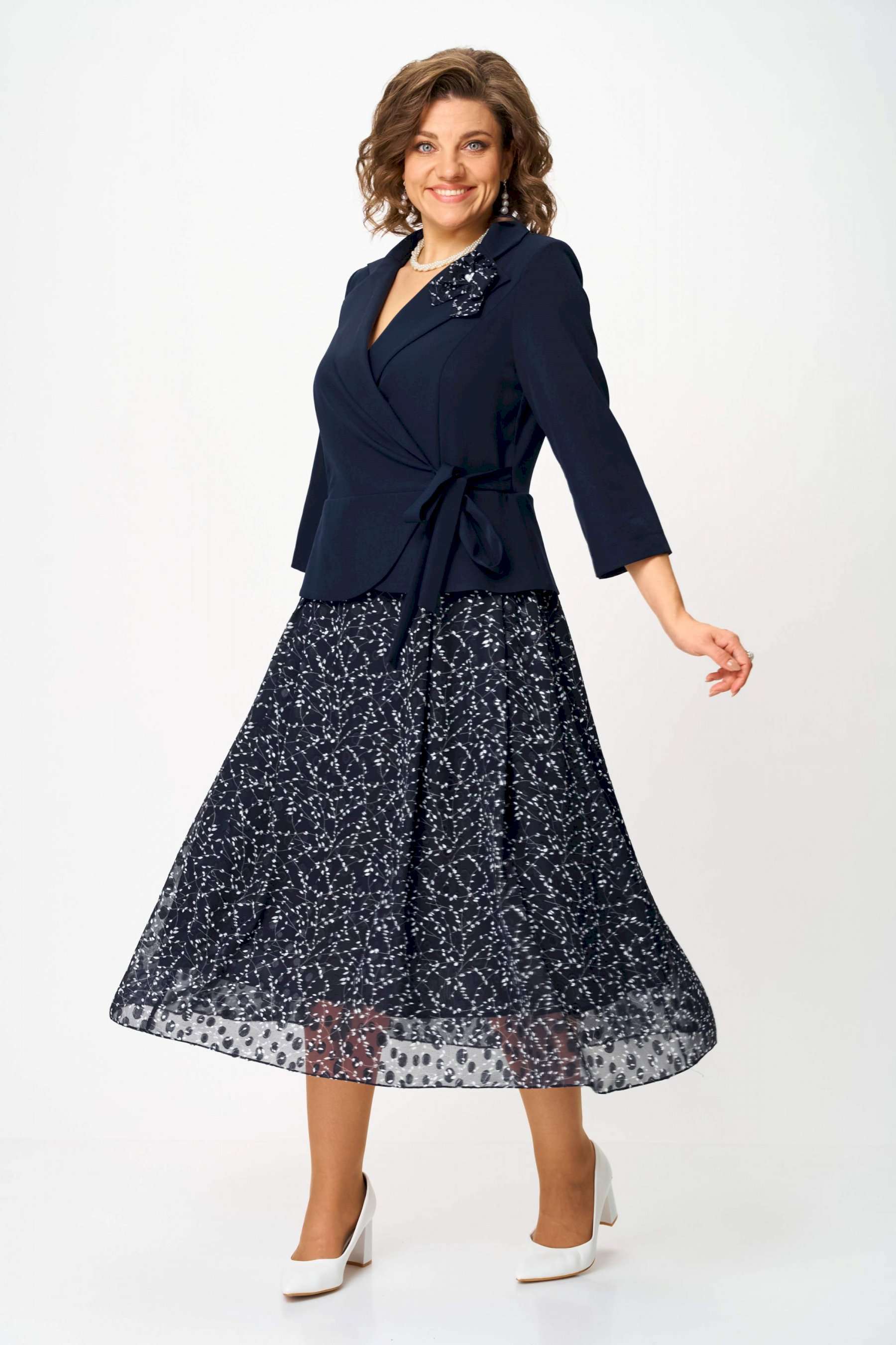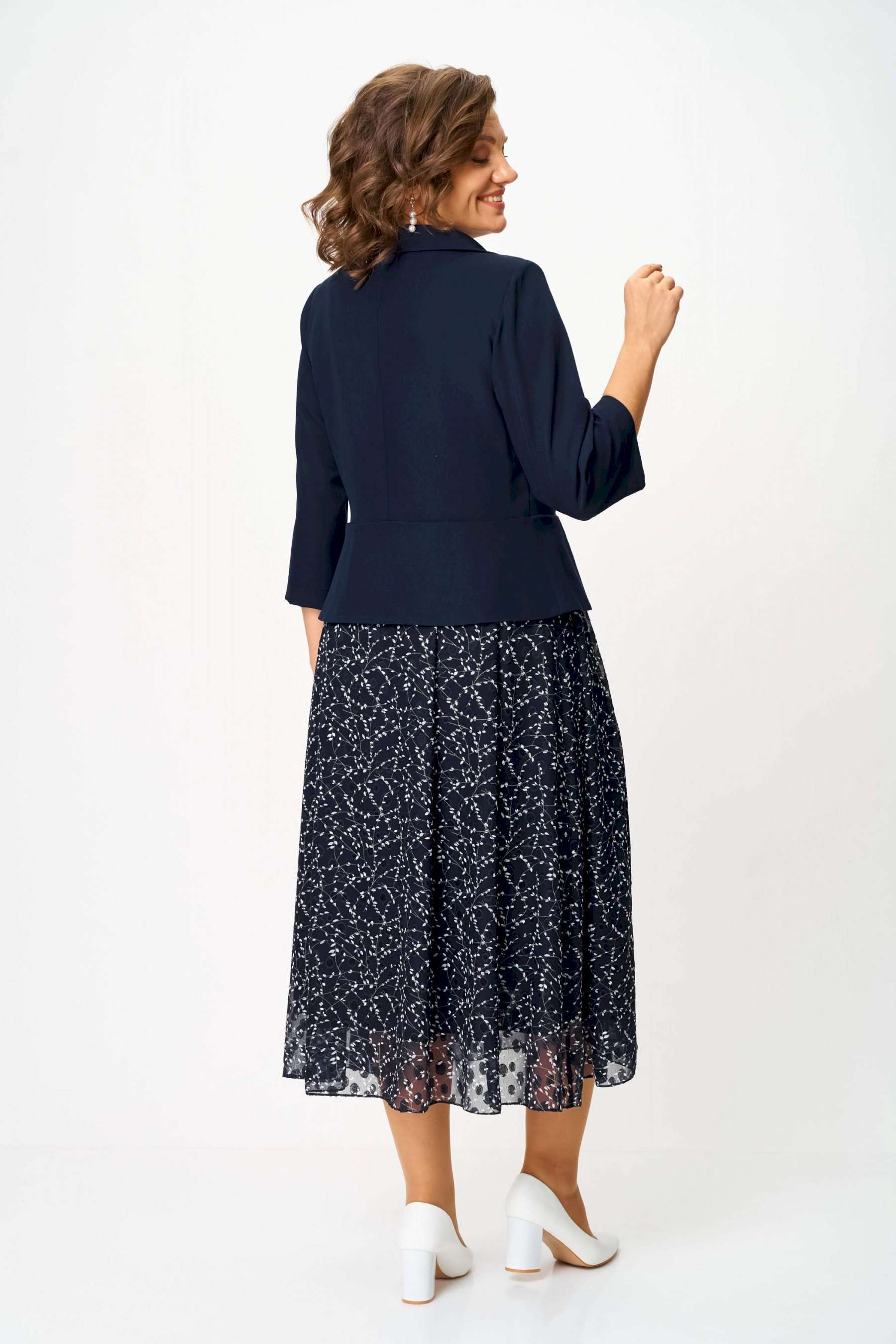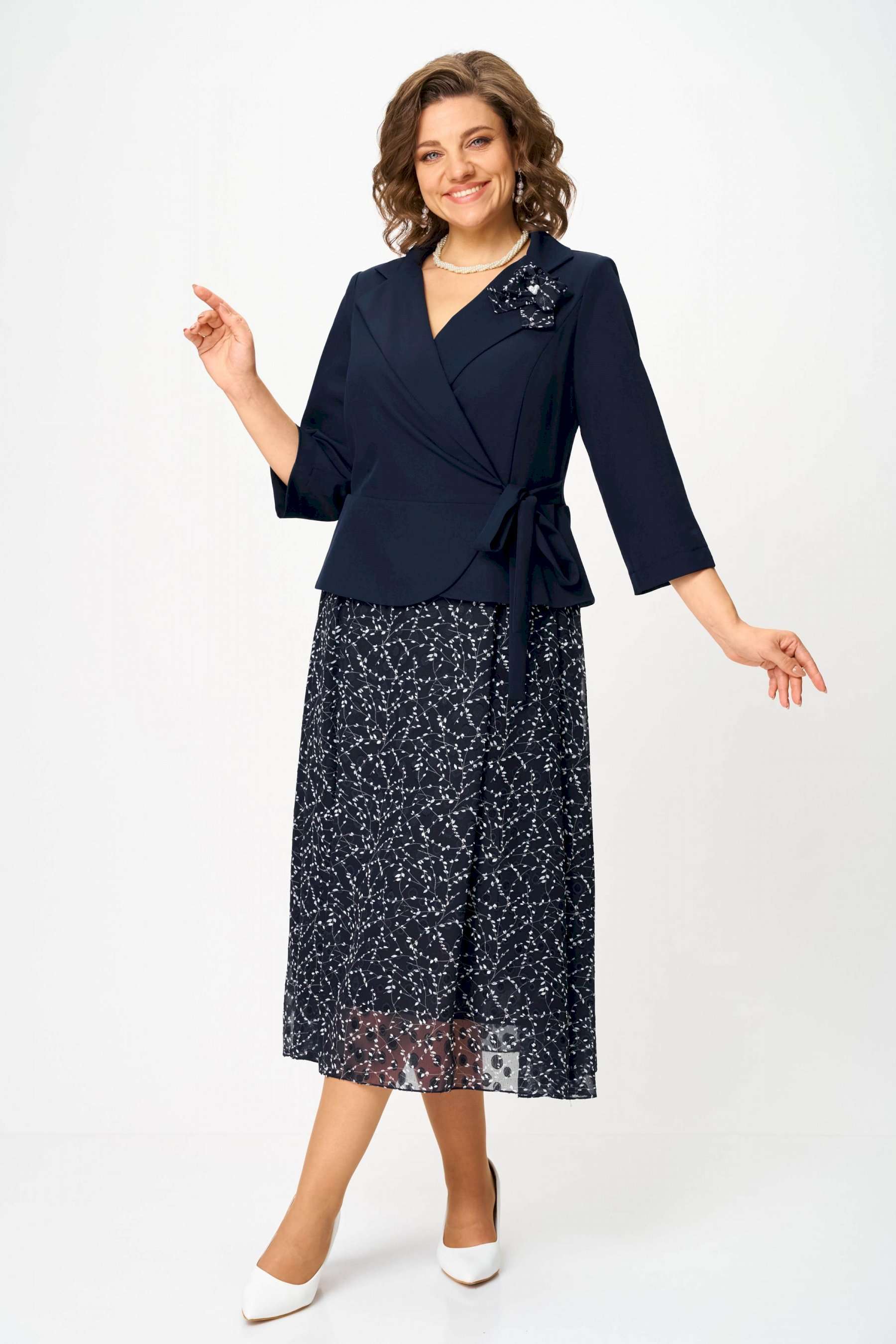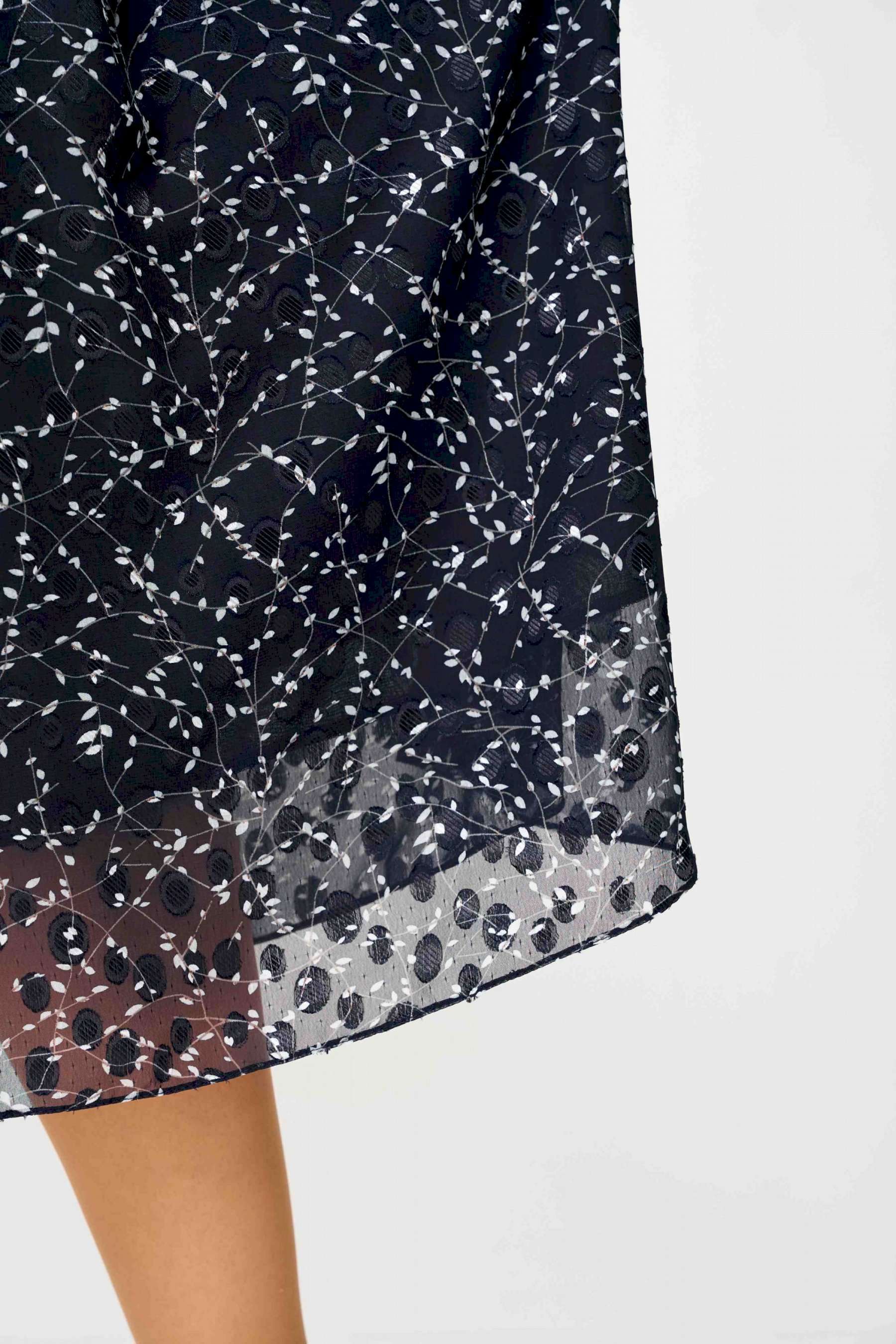 Элегантное женское платье, выполнено в виде имитации костюма из двух видов ткани. Лиф из плательной ткани, юбка из шифона. Платье с запахом, горловина с воротником пиджачного типа с отложными лацканами. Рукава втачные, длина 3/4. Юбка со складками по линии талии, расширенная к низу, на подкладке. По линии талии вставлен завязывающийся пояс. Длина платья – 124 см. Длина рукава от горловины – 47.5 см.