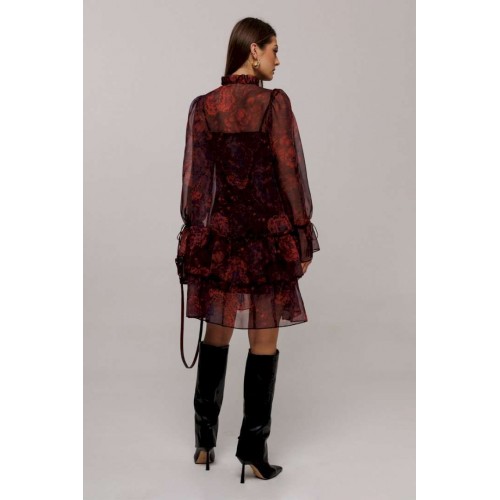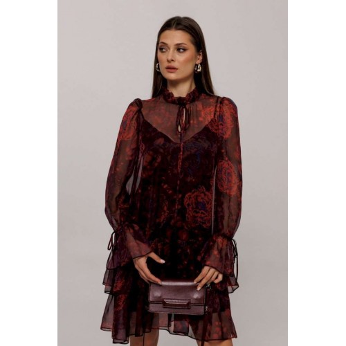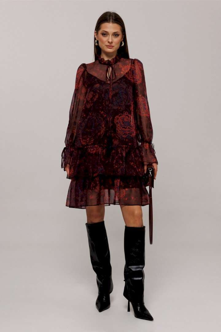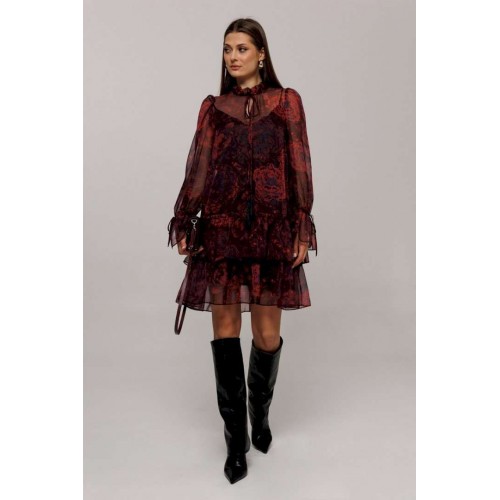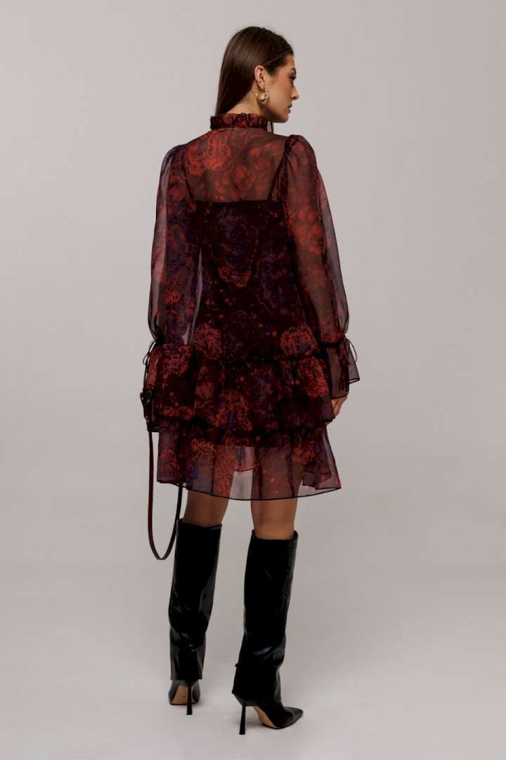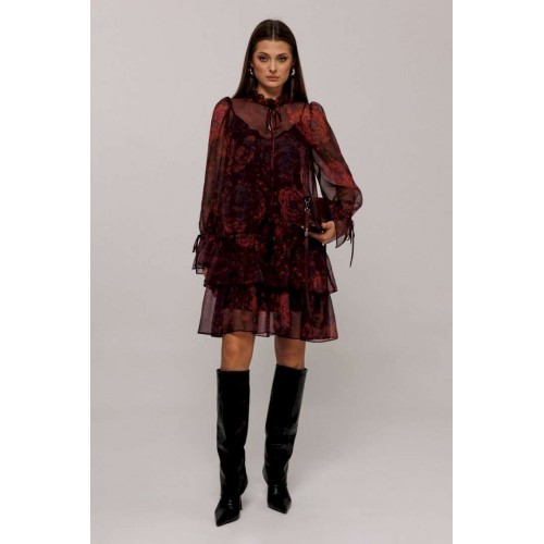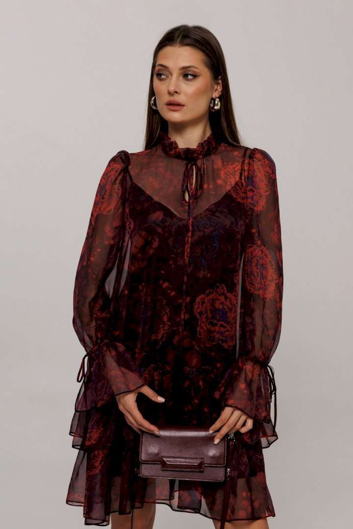 Платье шифоновое А-силуэта. Втачной длинный рукав со сборкой по окату и внизу на завязке. Полочка и спинка с притачными слегка присборенным воланом с рюшей. Воротник стойка-рюша и вырезом каплей по переду на завязке. Платье на подкладке.