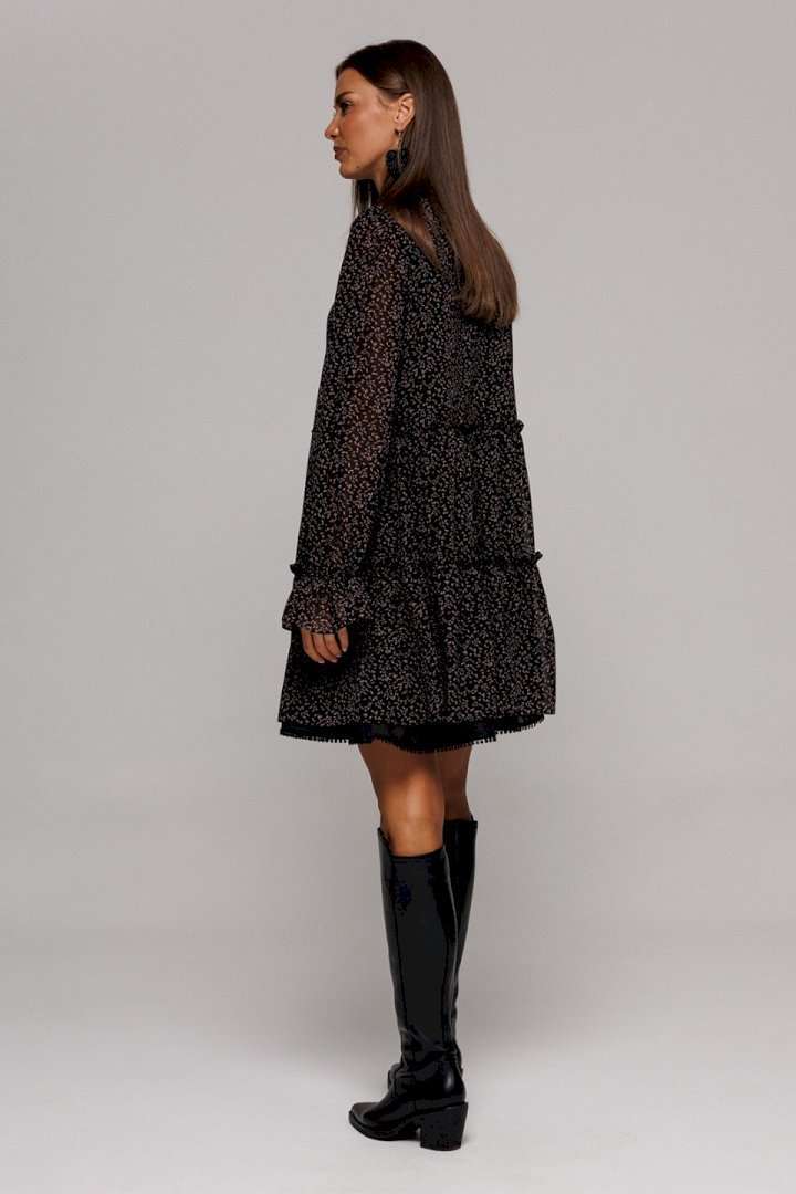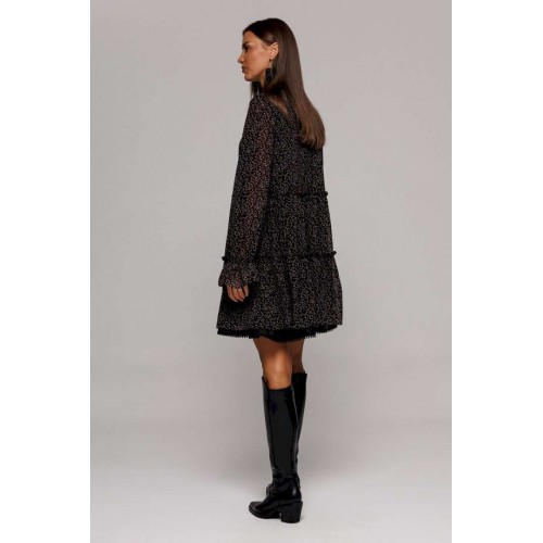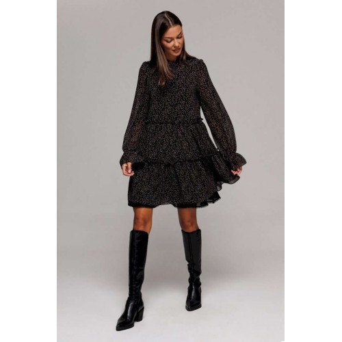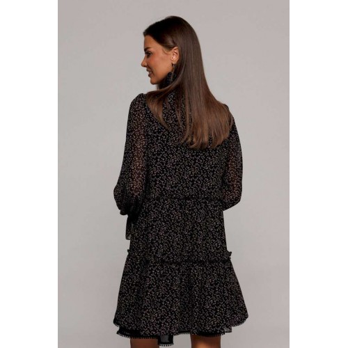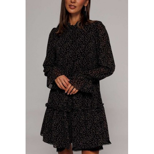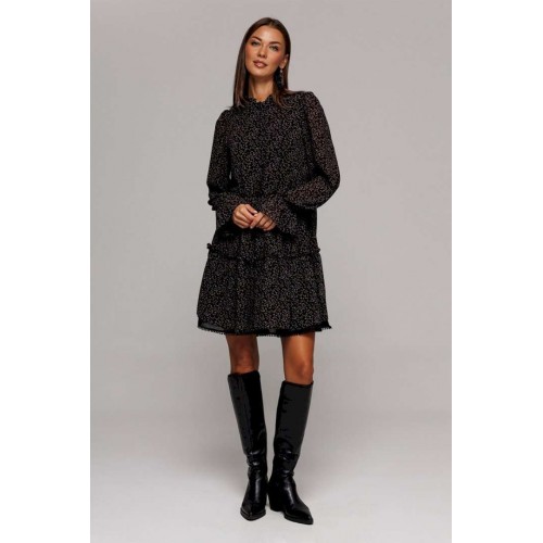 Платье шифоновое А-силуэта, отрезное по линии талии с рюшей. Втачной длинный рукав со сборкой по окату и внизу на резинке. По переду лиф с центральной застежкой на петли-пуговицы. Полочка и спинка с притачными, слегка присборенным воланом с рюшей из основной ткани и воланом из отделочной ткани по низу платья. Воротник-стойка с рюшей. Платье на подкладке.