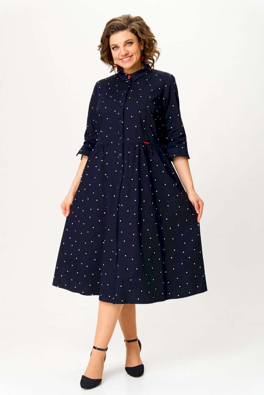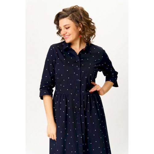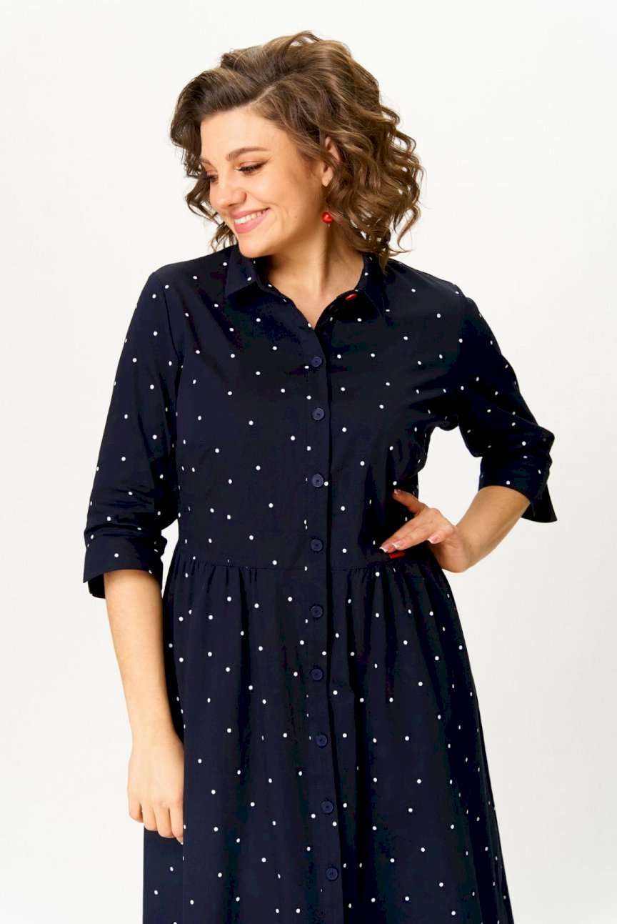 Платье женское, повседневное, полуприлегающего силуэта, отрезное по линии талии, длиной ниже линии колен, из хлопковой ткани. Перед с застежкой на пуговицы.  Вырез горловины обработан воротником на стойке. Рукав втачной, по низу обработан цельнокроенной манжетой. Длина по спинке 117 см, длина рукава 16,5 см.