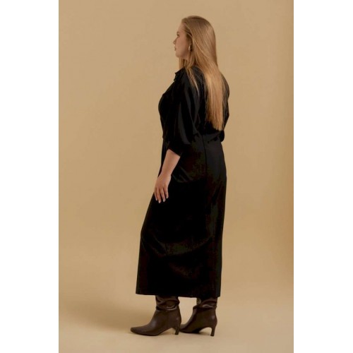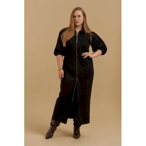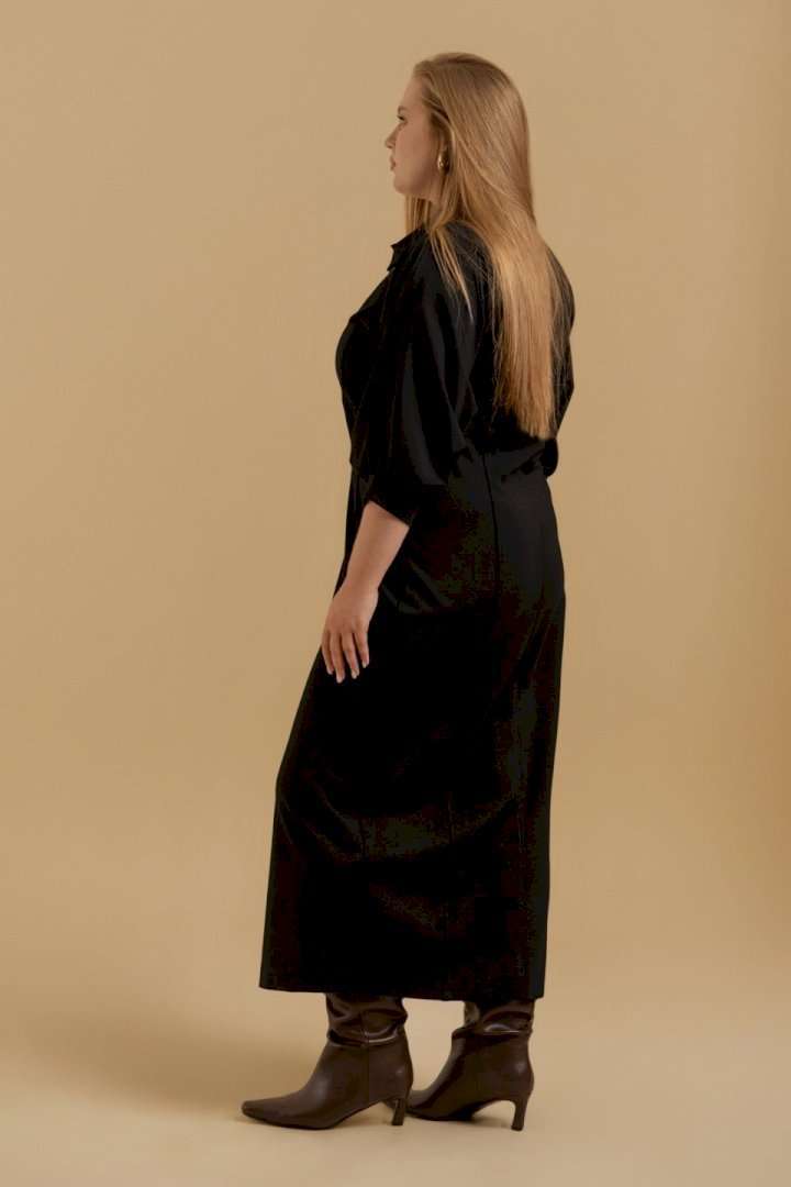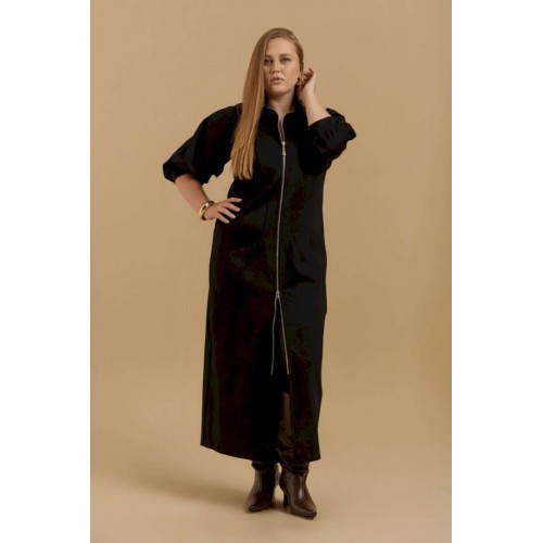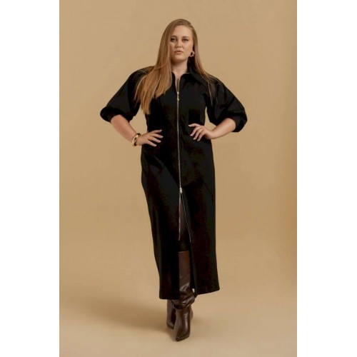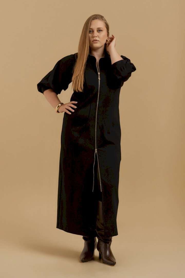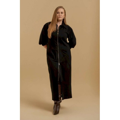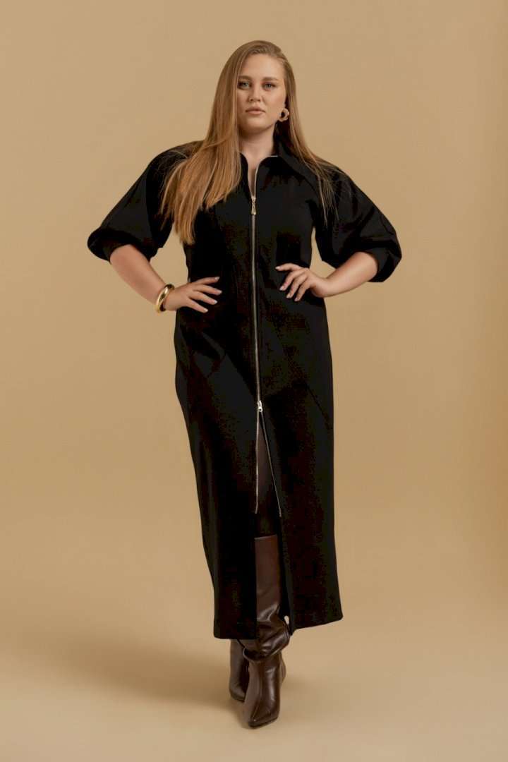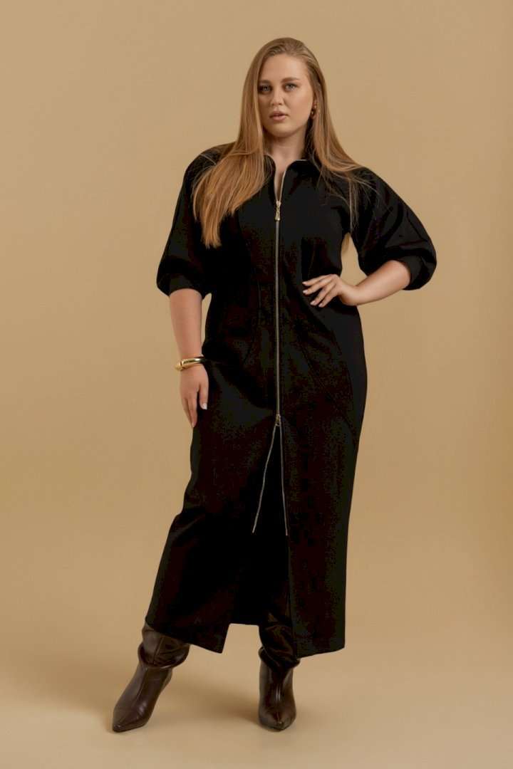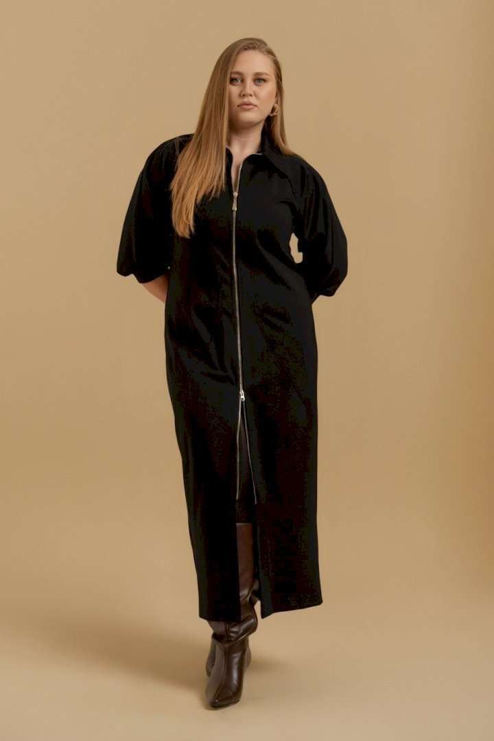 Это стильное женское платье миди черного цвета выполнено из мягкого трикотажного полотна, обеспечивающего комфорт и прекрасную посадку. Дизайн включает в себя оригинальные реглан рукава с архитектурными формами, добавляющими изысканности образу. Приталивание подчеркнуто фигурными рельефами по талии. Платье оформлено воротником рубашечного типа и функциональной молнией спереди на всю длину, что добавляет практичности и уникальности. Элегантный и современный выбор для различных мероприятий.