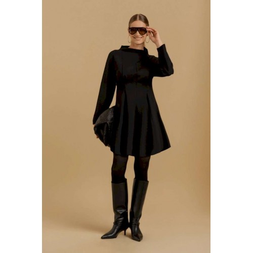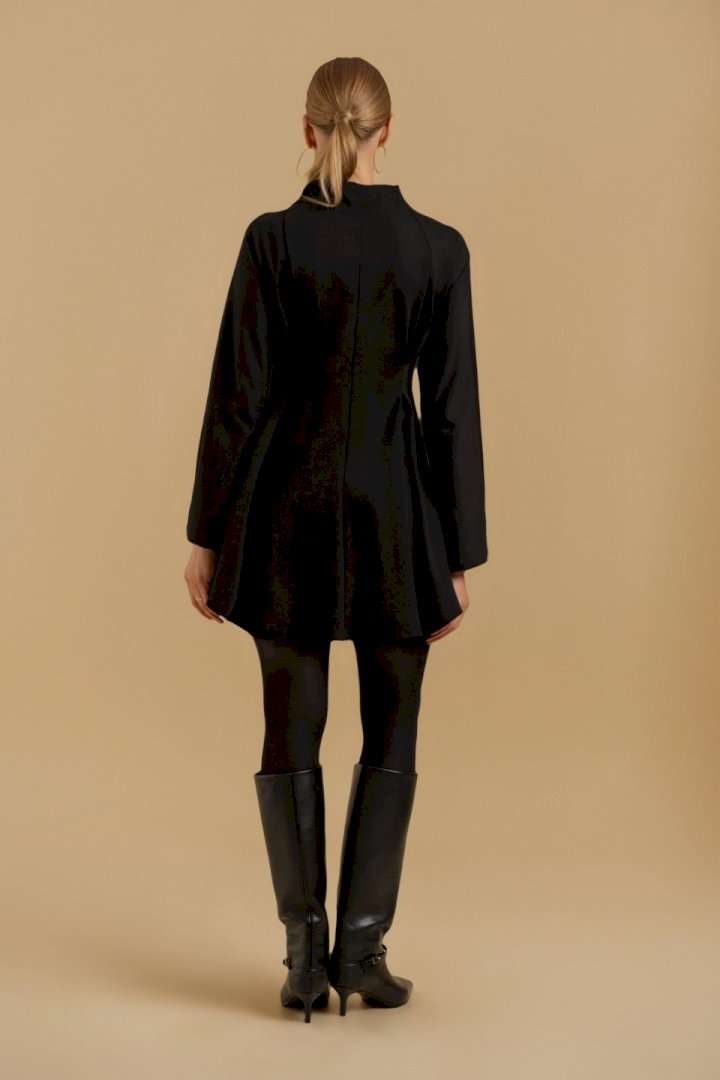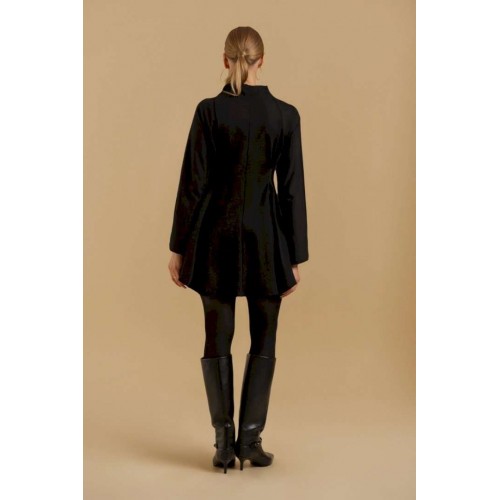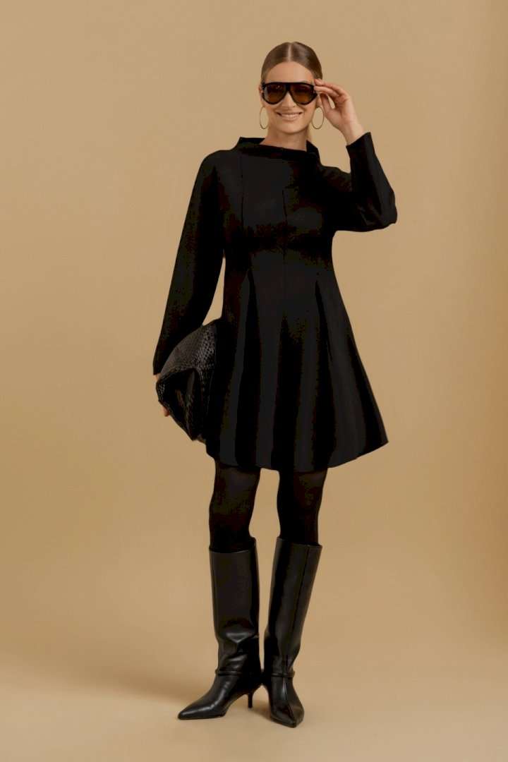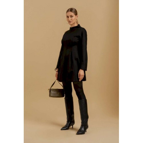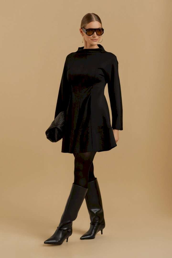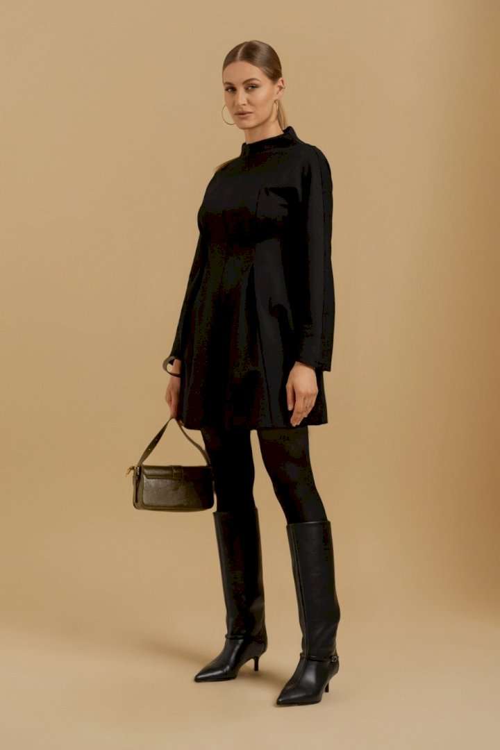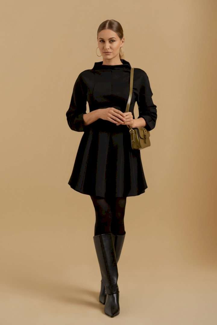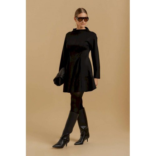Платье женское свободного покроя из трикотажного полотна. Вырез горловины оформлен цельнокроеным воротником-стойкой. Рукава - цельнокроеные с ластовицами для свободы движения. В области линии талии выполнены складки для придания изделию приталенного силуэта.