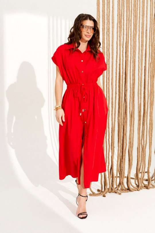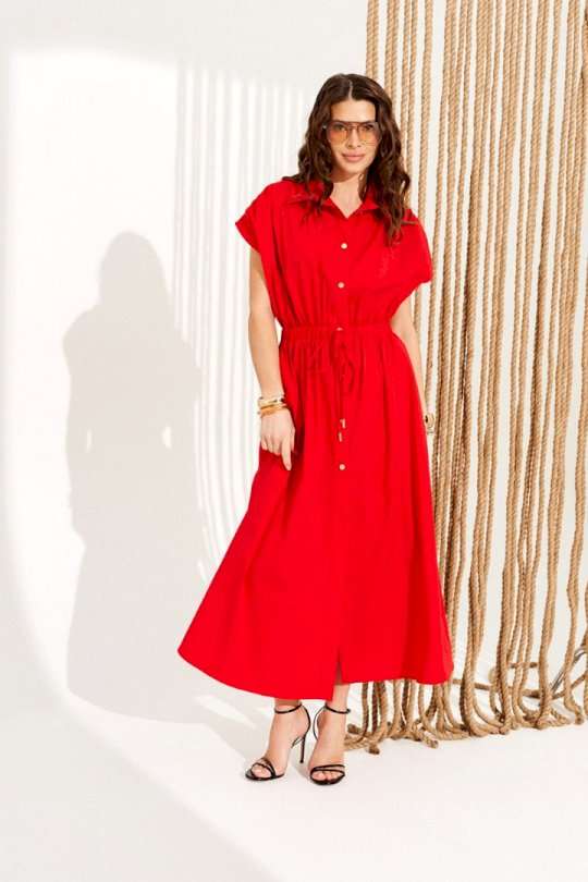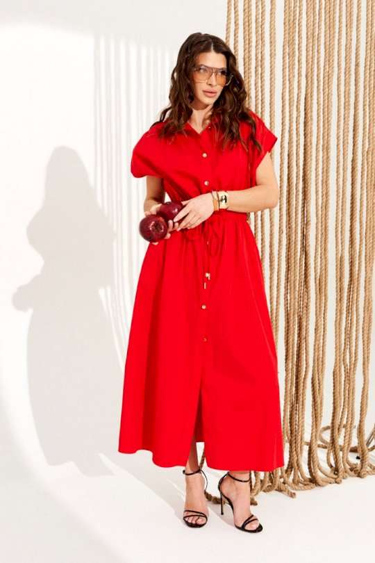 Платье умеренного объема, приталенного силуэта, с центральной застежкой на петли и пуговицы и спущенной линией плеча. Воротник стояче-отложной с отрезной стойкой. Пояс отрезной, на резинке, со шнуром-завязкой и наконечниками. Верхние детали переда со сборкой по плечевому шву. Нижние детали переда с боковыми прорезными карманами с застежкой на тесьму-молнию. Длина изделия на модели вдоль середины спинки — 129,5 см (допустимое отклонение +/- 1 см)