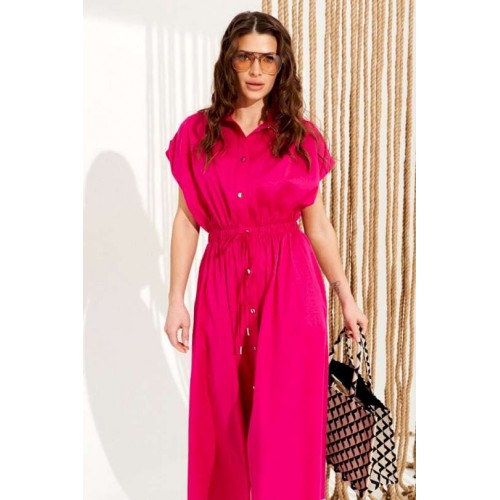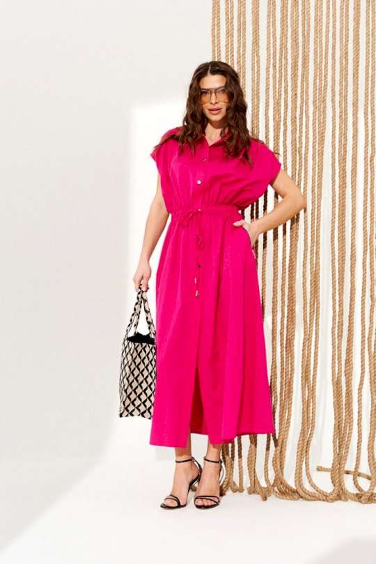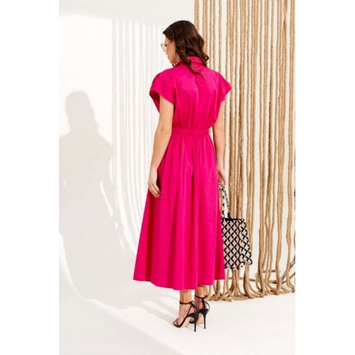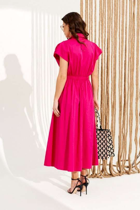 Платье умеренного объема, приталенного силуэта, с центральной застежкой на петли и пуговицы и спущенной линией плеча. Воротник стояче-отложной с отрезной стойкой. Пояс отрезной, на резинке, со шнуром-завязкой и наконечниками. Верхние детали переда со сборкой по плечевому шву. Нижние детали переда с боковыми прорезными карманами с застежкой на тесьму-молнию. Длина изделия на модели вдоль середины спинки — 129,5 см (допустимое отклонение +/- 1 см)