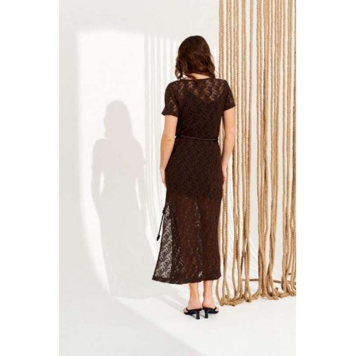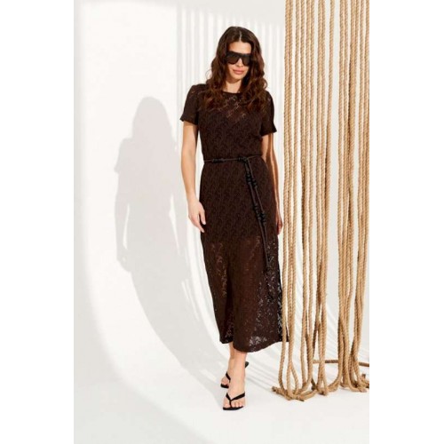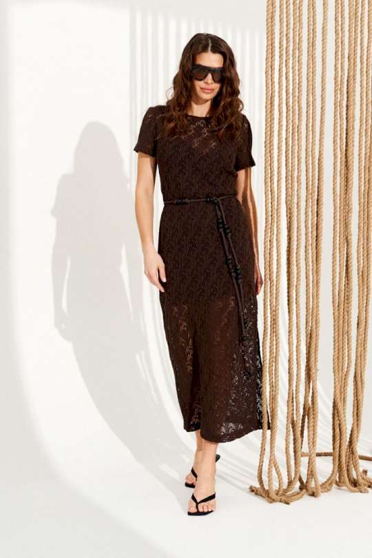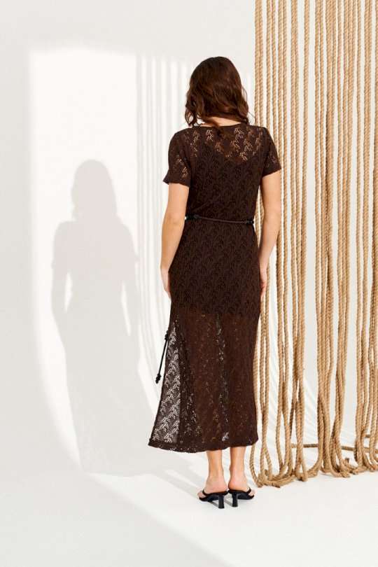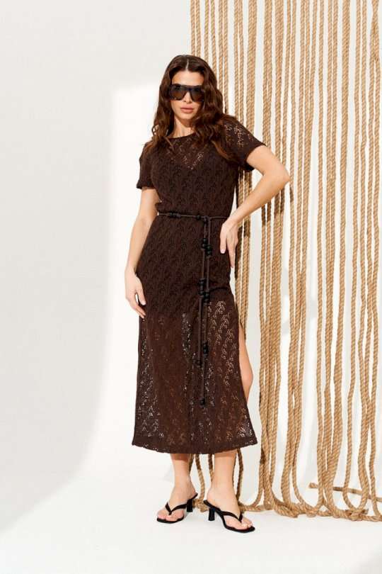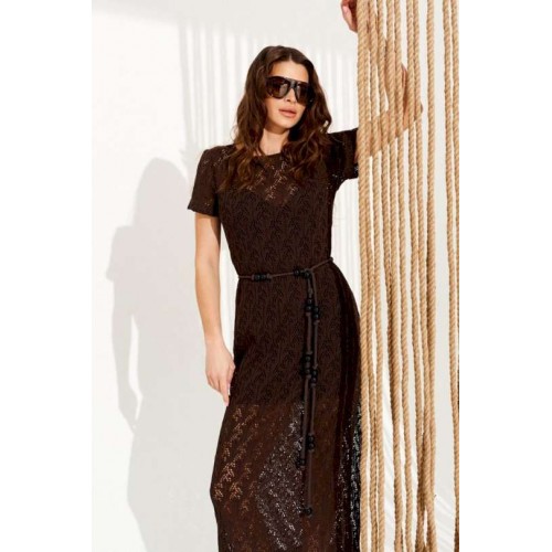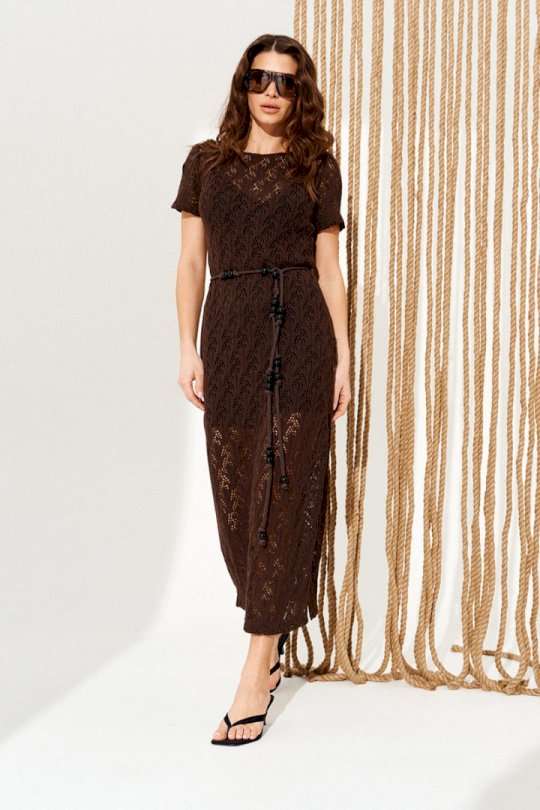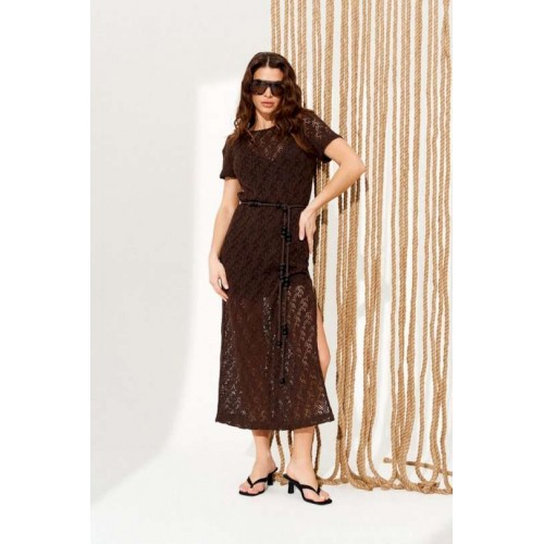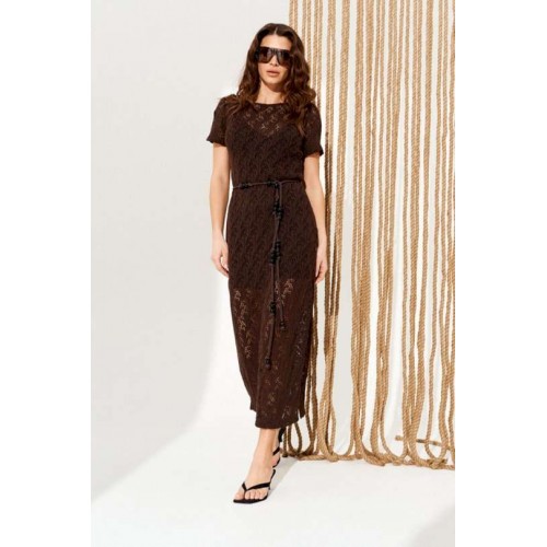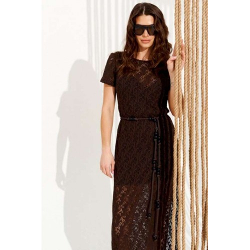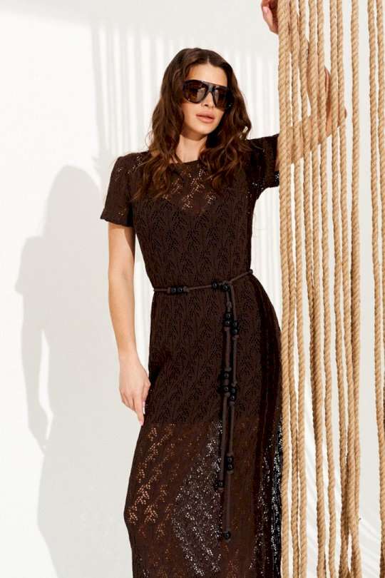 Платье из трикотажного полотна, умеренного объема, полуприлегающего силуэта, с круглым вырезом горловины. Вырез горловины обработан притачной обтачкой. Перед и спинка цельные. Левый боковой шов заканчивается разрезом. Рукав втачной, короткий. В комплекте декоративный пояс с бусинами. Нижнее платье умеренного объема, полуприлегающего силуэта, на регулируемых бретелях, с V-образным вырезом горловины. Перед с нагрудными вытачками. Длина изделия на модели вдоль середины спинки — 132 см (допустимое отклонение +/- 1 см)