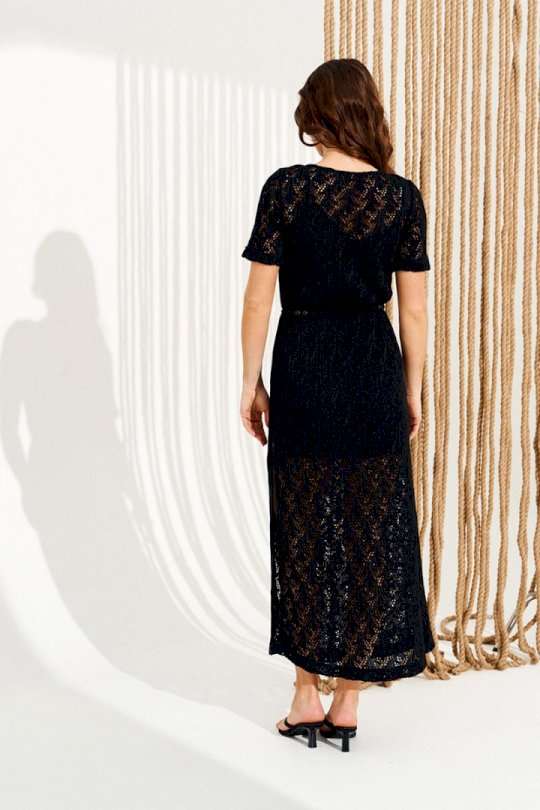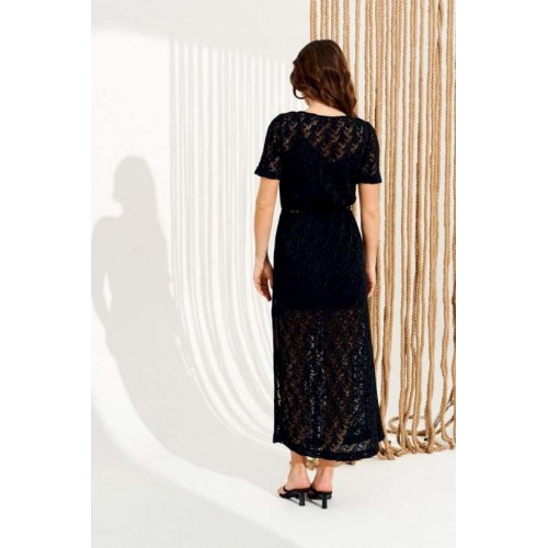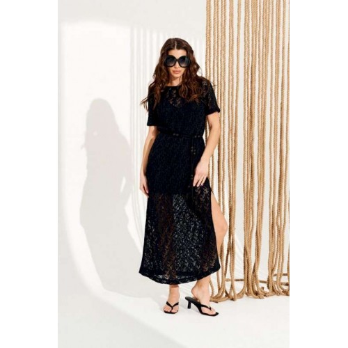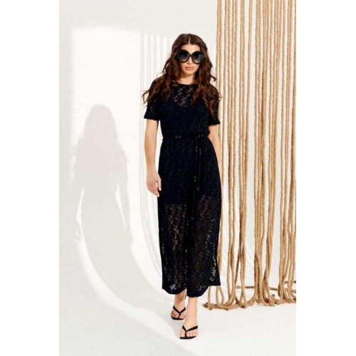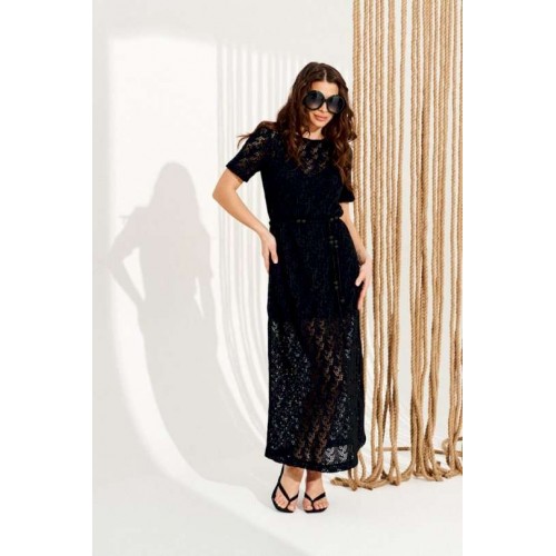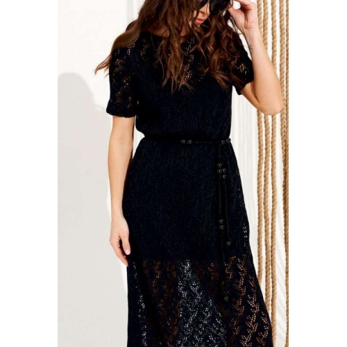 Платье из трикотажного полотна, умеренного объема, полуприлегающего силуэта, с круглым вырезом горловины. Вырез горловины обработан притачной обтачкой. Перед и спинка цельные. Левый боковой шов заканчивается разрезом. Рукав втачной, короткий. В комплекте декоративный пояс с бусинами. Нижнее платье умеренного объема, полуприлегающего силуэта, на регулируемых бретелях, с V-образным вырезом горловины. Перед с нагрудными вытачками. Длина изделия на модели вдоль середины спинки — 132 см (допустимое отклонение +/- 1 см)