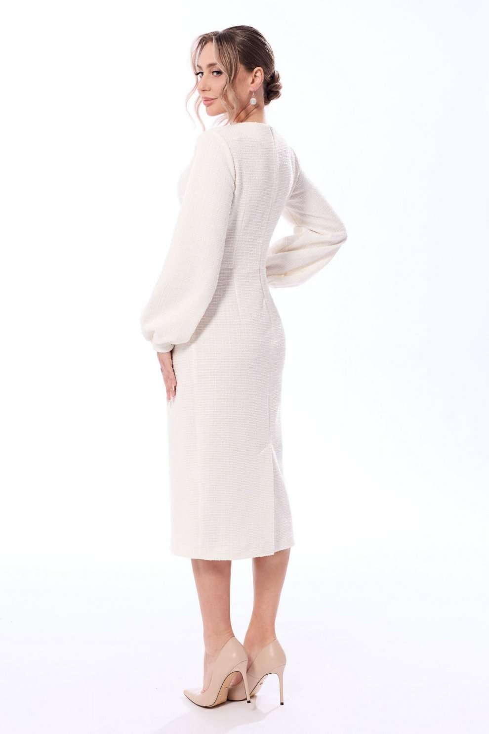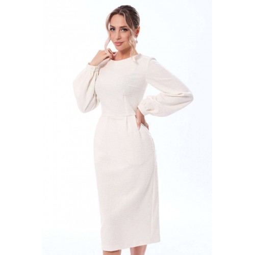 Платье, с застежкой на потайную молнию в среднем шве спинки, без воротника, с круглым вырезом горловины. Платье отрезное по линии талии. Лиф переда с талиевыми и нагрудными вытачками. Нижняя часть переда с двумя встречными складками, выходящими из талиевого шва, карманами от талиевого шва до бокового. Спинка со средним швом, заканчивающимся шлицей, талиевыми и нагрудными вытачками. Рукав втачной, длинный, с отрезной манжетой, застегивающейся на одну петлю и пуговицу. Низ рукава присборен.