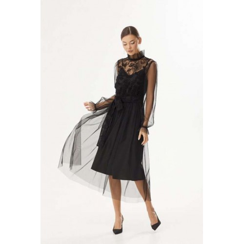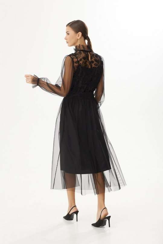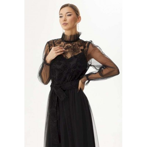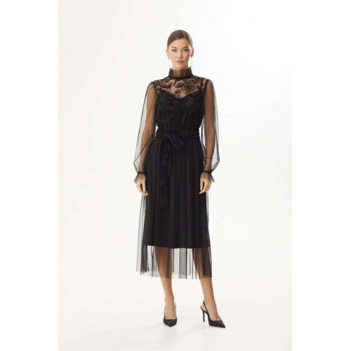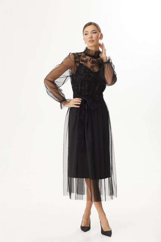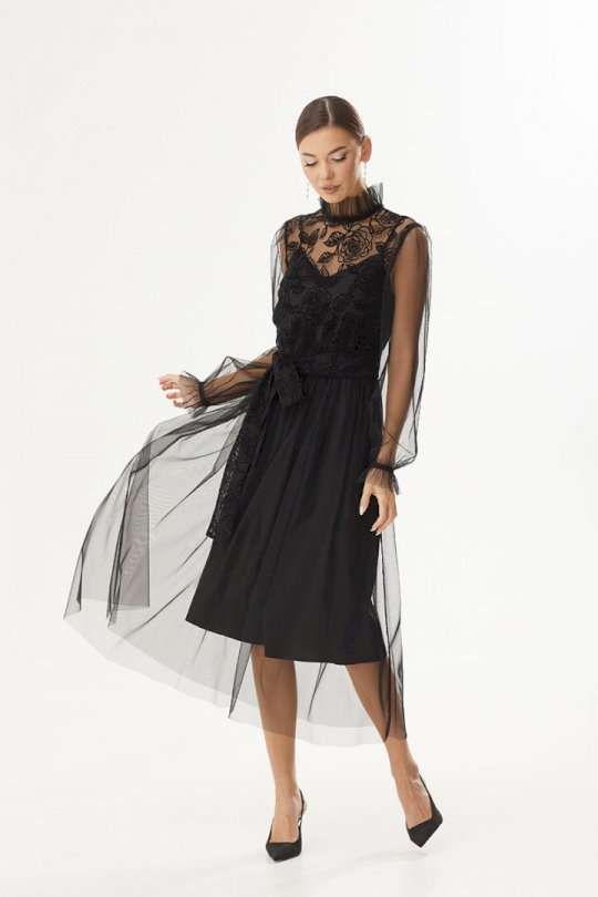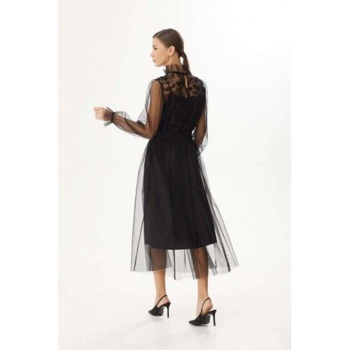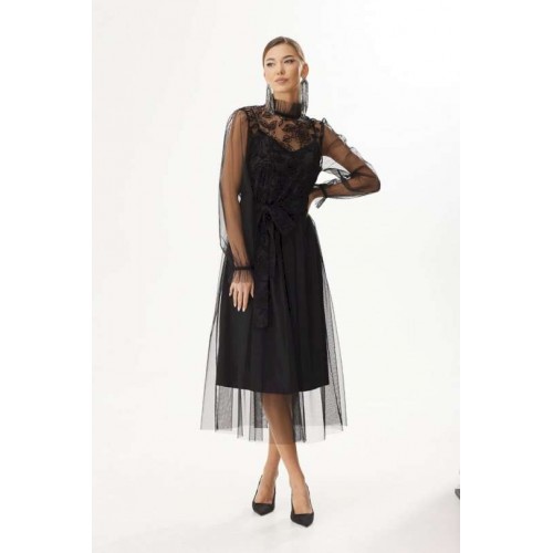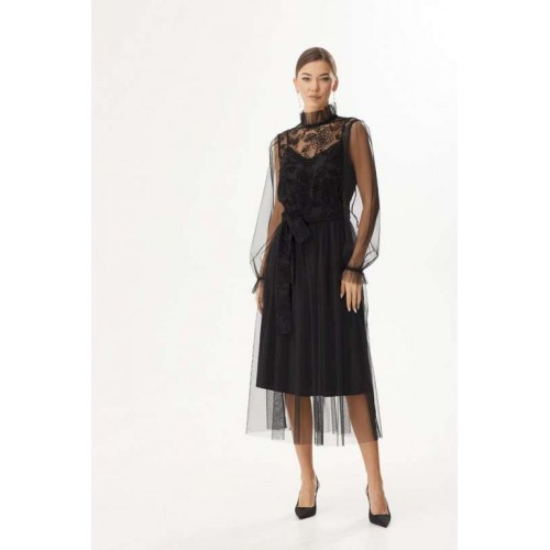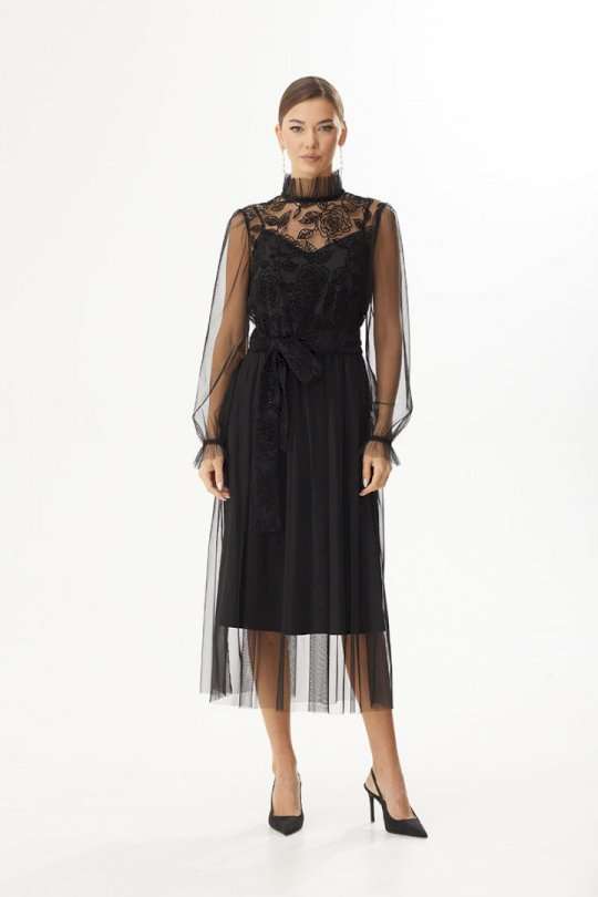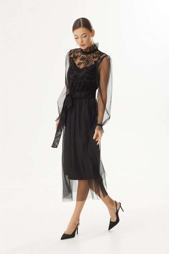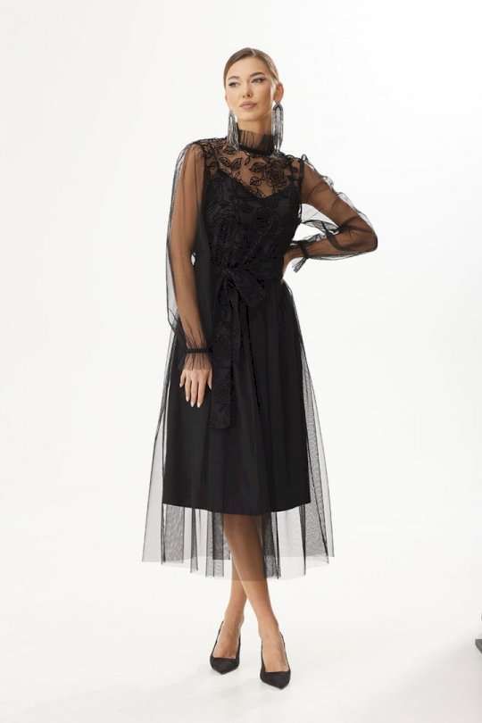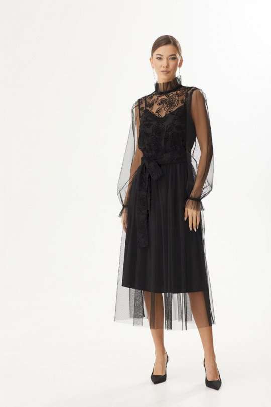 Платье двухслойное полуприлегающего силуэта, отрезное по линии талии. Верхний лиф выполнен из фатина с флоком. Перед и спинка цельнокроеные. В области горловины обработана застежка-капелька на навесную петельку и пуговицу. Нижняя юбка прямая, верхняя юбка собрана по линии талии. Рукав длинный, втачной, по низу оборка, на запястье просборен на резинку. Горловина округлой формы, декорирована тесьмой. В комплекте съемный пояс. Платье двухслойное полуприлегающего силуэта, отрезное по линии талии. Верхний лиф выполнен из фатина с флоком. Перед и спинка цельнокроеные. В области горловины обработана застежка-капелька на навесную петельку и пуговицу. Нижняя юбка прямая, верхняя юбка собрана по линии талии. Рукав длинный, втачной, по низу оборка, на запястье просборен на резинку. Горловина округлой формы, декорирована тесьмой. В комплекте съемный пояс. Длина платья по спинке88 см, длина нижнего платья 70 см.