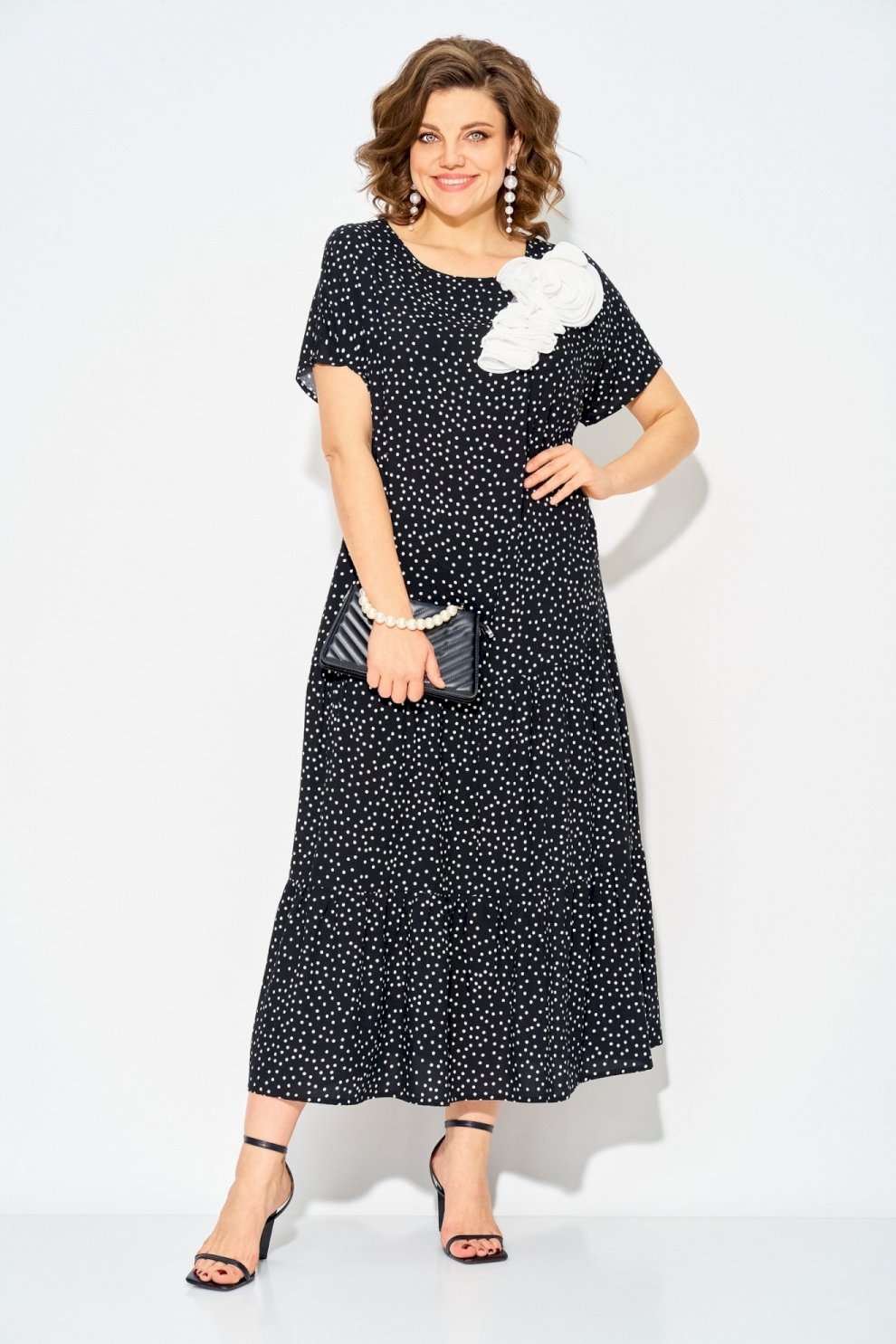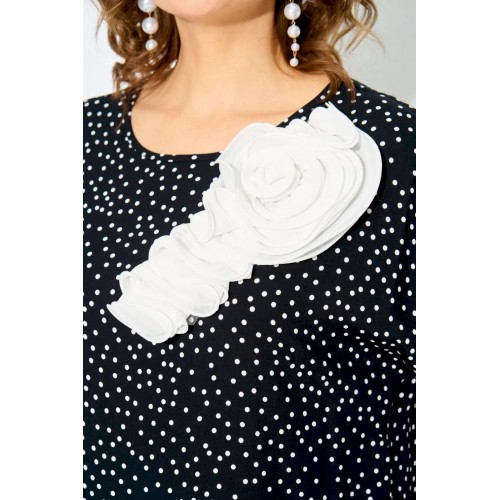 Платье 1528 Liliana-style — вечерний наряд в коллекции бренда Liliana. Легкий состав из 70% хлопка, 20% вискозы и 10% полиэстера делает платье комфортным для летних вечеров. Силуэт трапеция с коротким рукавом и округлым вырезом горловины обеспечивает романтичный и свободный образ. Наряд украшен съёмным декоративным цветком из креп-шифона и карманами в боковых швах. Идеально для свадеб и торжественных мероприятий. Черно-белый цвет с принтом в горошек добавляет изысканности, а длина по спинке 125 см и длина рукава 20 см подчеркивают комфорт и стиль.