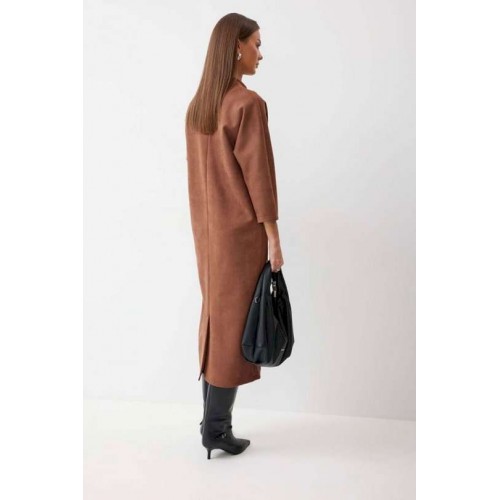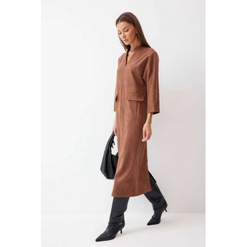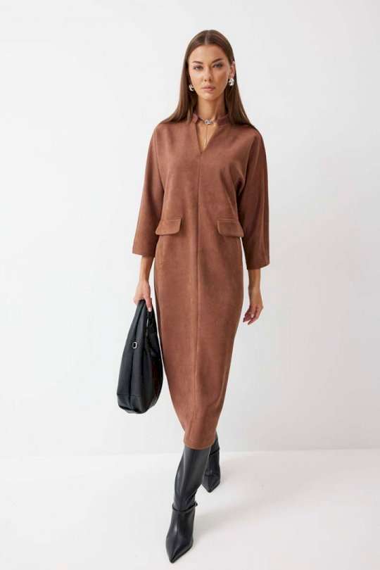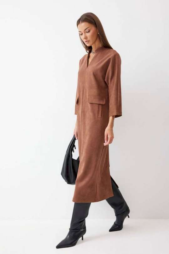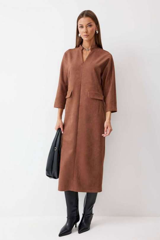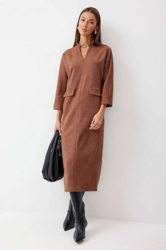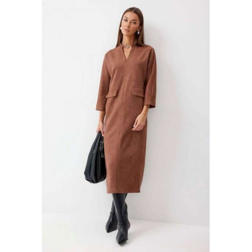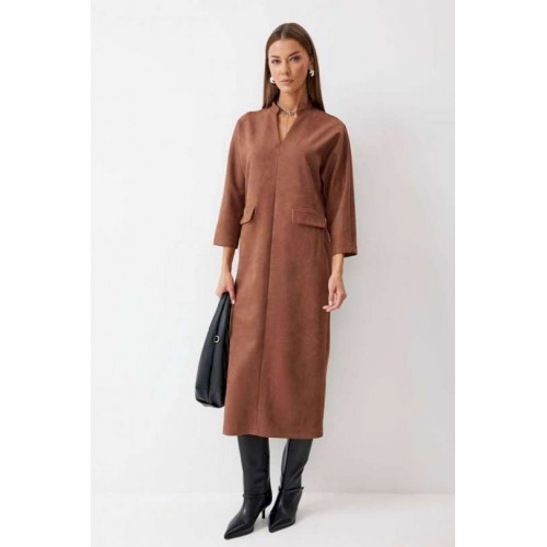 Платье прямого силуэта из трикотажного полотна длины миди. Рукав цельнокроеный, длиной ¾. Воротник-стойка. На передних половинках обработаны прорезные карманы с втачной листочкой и декоративным клапаном. По спинке расположен центральный шов с шлицей по низу. Подходит на рост 164-170 см. Длина платья (в 44-48 р. – 120 см) (в 50-54 р. – 121см). Длина рукава от горловины (в 44-48 р. – 59 см) (в 50-54 р. - 60.5 см).