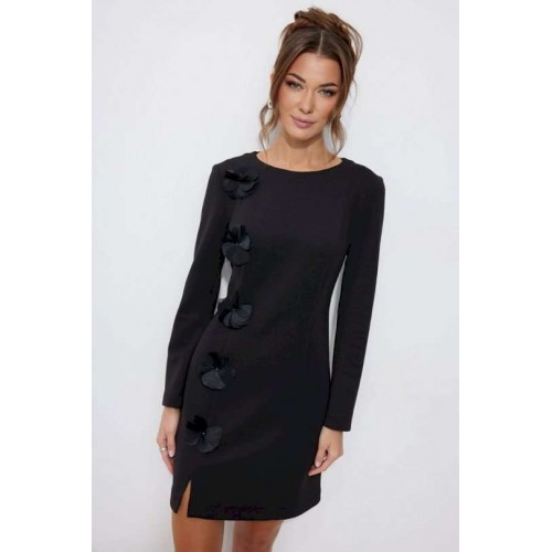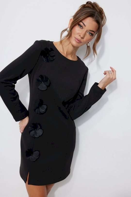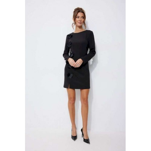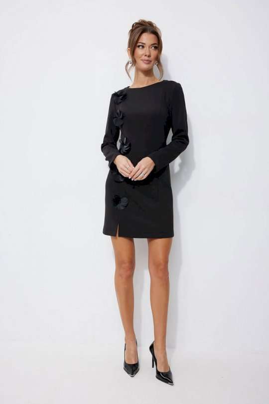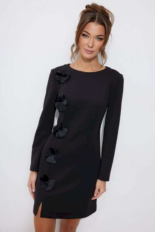 Нарядное платье из трикотажного полотна, длина мини. Платье прилегающего силуэта с небольшим расширением по низу. С рельефами по переду и спинке. По переду слева вдоль рельефа пришивной декор «цветы». По переду слева рельеф с разрезом по низу. Рукав втачной, длинный. Вырез горловины «лодочка». Потайная молния в среднем шве спинки. Обращаем Ваше внимание, что декор может незначительно отличаться от фото. Длина платья 44-48р 82 см, в 50-54р 92 см. Длина рукава 61 см во всех размерах.