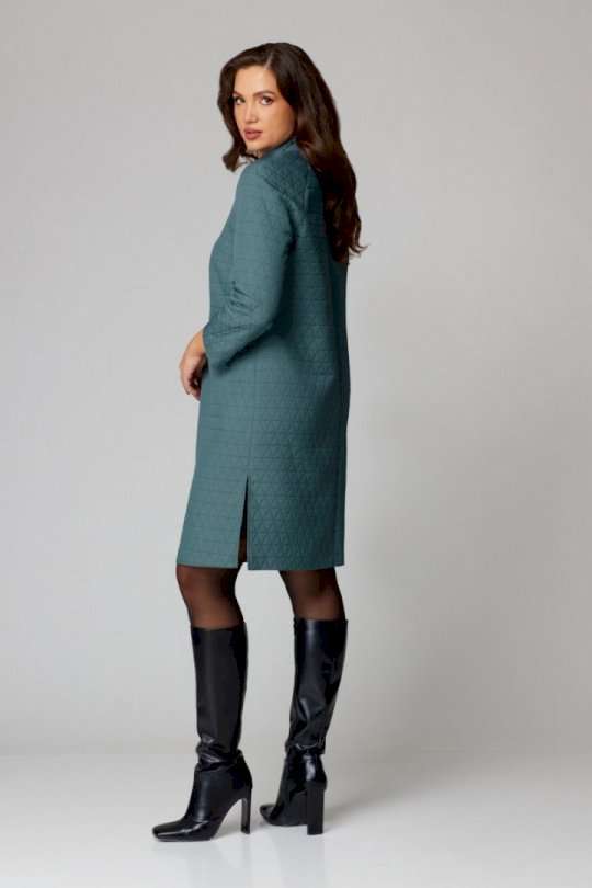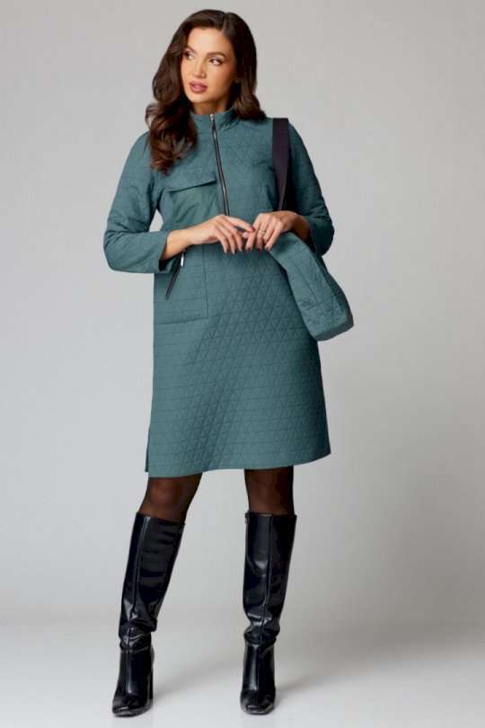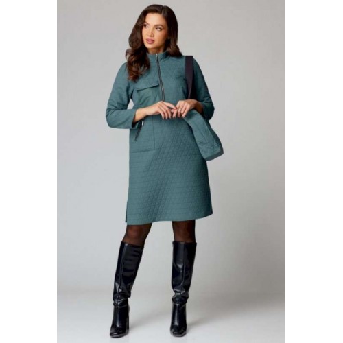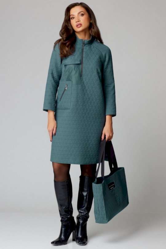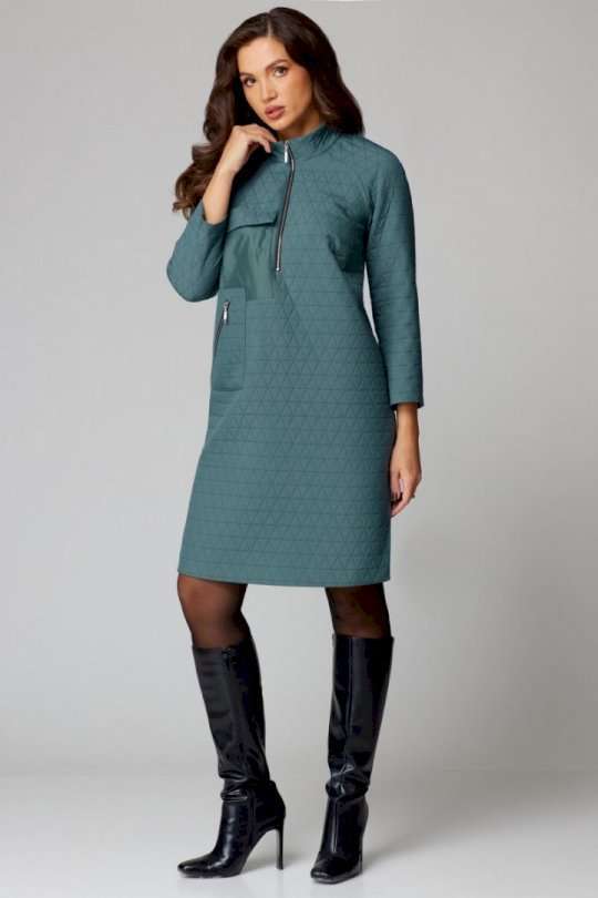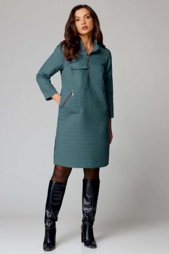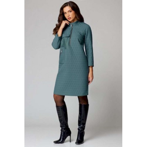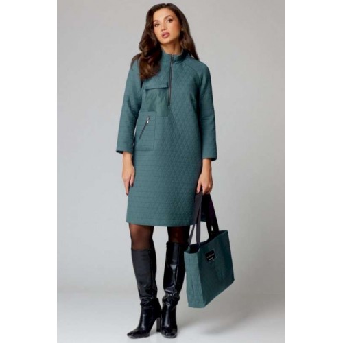 Платье женское, прямого силуэта. Рукав реглан с вытачкой по плечу, длина 7/8. Горловина с воротником стойкой на застежку – молнию. По переду, с правой стороны два накладных кармана, верхний карман из отделочной ткани с клапаном из основной ткани, нижний карман из основной ткани с одним входом на тесьму-молнию и другим с боковой стороны. В боковых швах платья разрезы. Спинка со средним швом. Длина платья по спинке 94 см. Длина рукава 65см