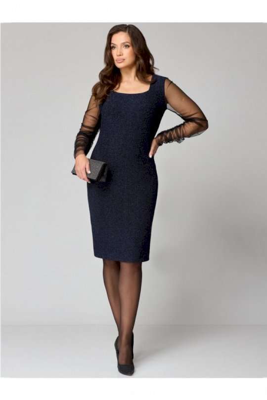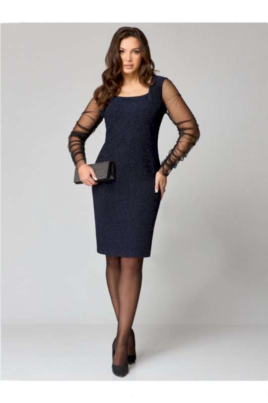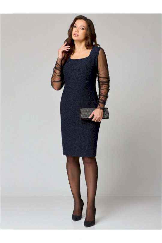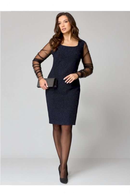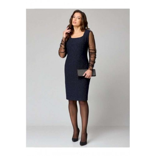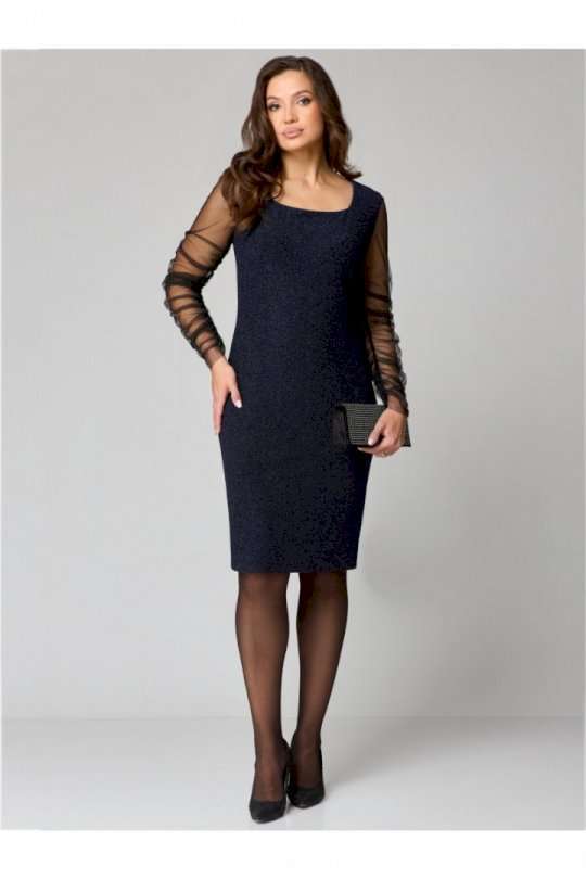 Элегантное женское платье полуприлегающего силуэта из трикотажного полотна с мерцающим блеском.Вырез горловины «каре», по переду нагрудные вытачки, спинка со средним швом и талиевыми вытачками. Рукав втачной, одношовный выполнен из сетки и присборен на венгерку по шву.