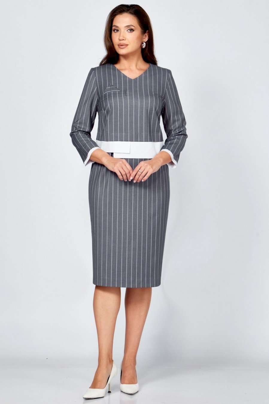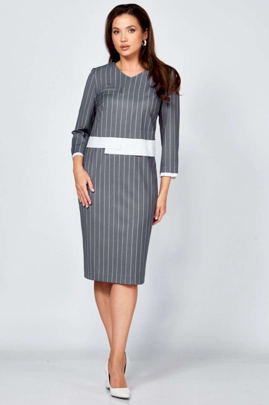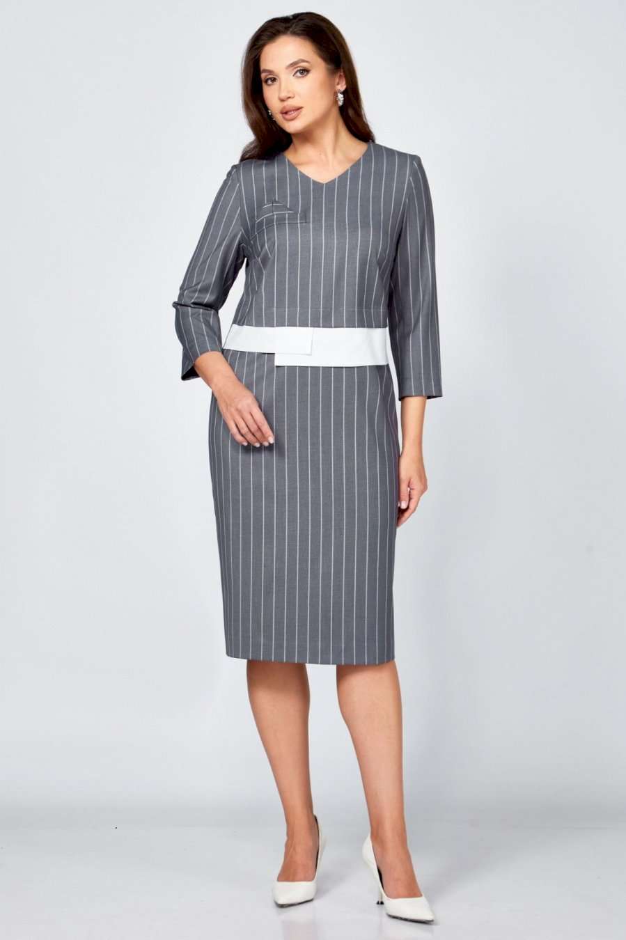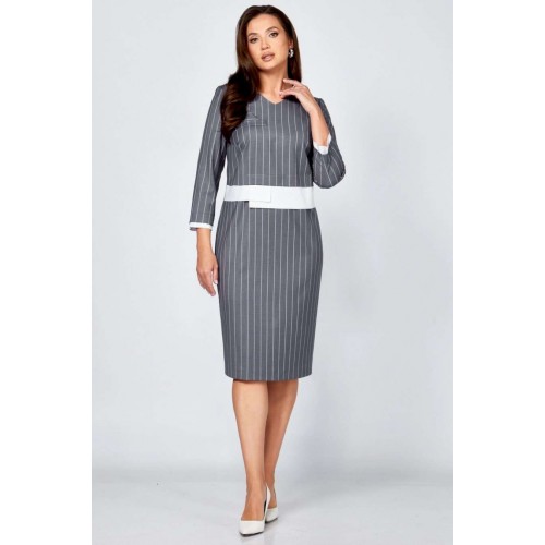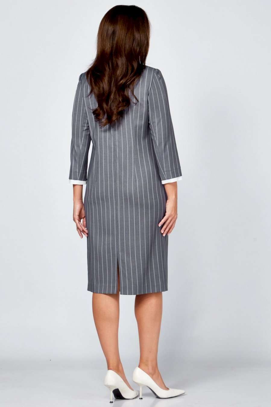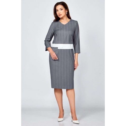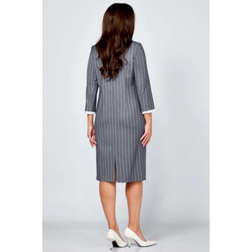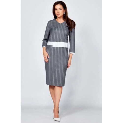 Платье женское полуприлегающего силуэта, без подкладки. V-образный вырез горловины. По переду нагрудные вытачки и подрез чуть выше линии талии. От подреза идут вставки из хлопка ассиметричные по длине. Синка со средним швом, талевыми вытачками и разрезом по низу. Застежка по спинке на потайную тесьму-молнию. Рукав втачной двухшовный со съемной манжетой из хлопка. Манжета застегивается на 4 пуговицы и петли. Длина платья 105см , длина рукава с манжетой 51см.