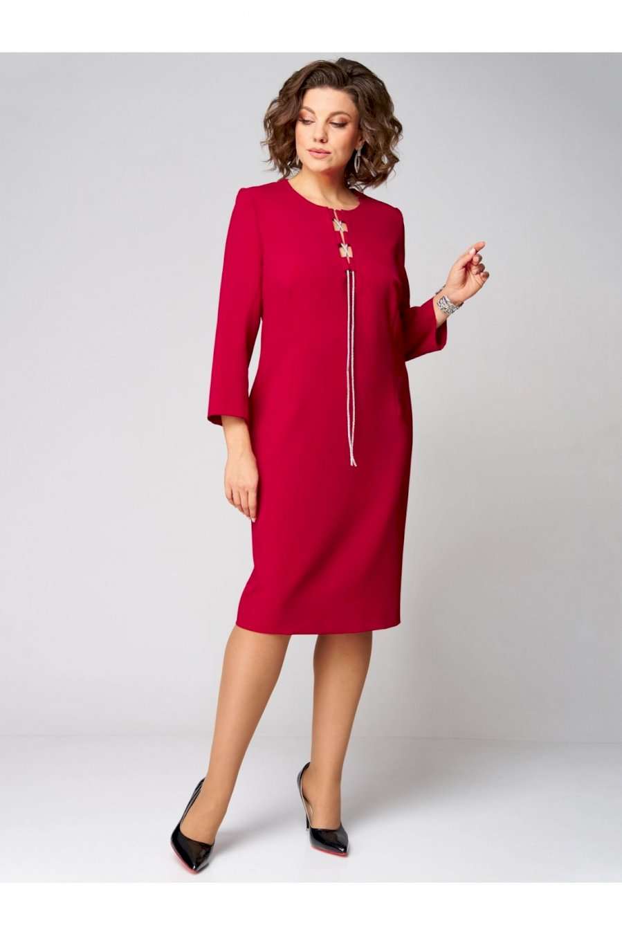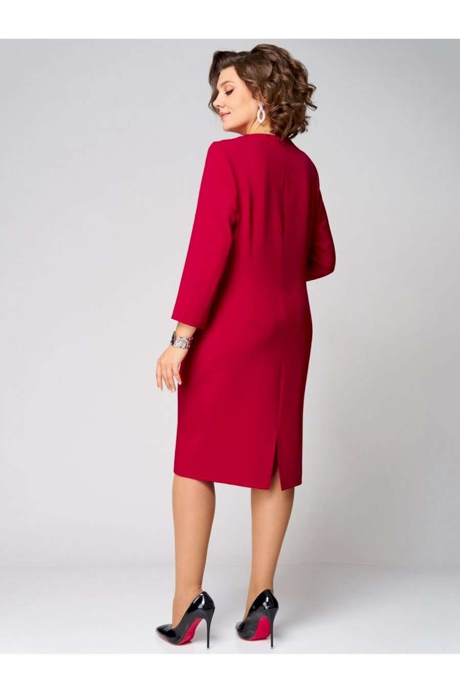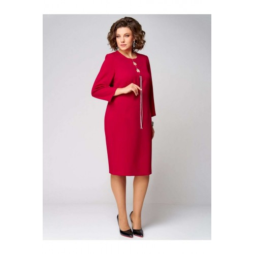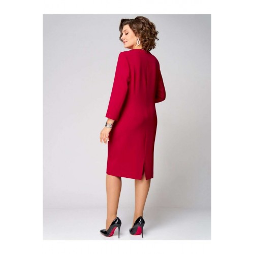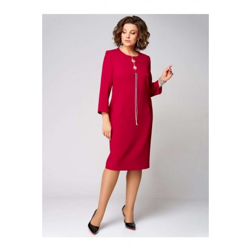 Платье полуприлегающего силуэта выполнено из поли вискозной ткани. Округлый вырез горловины, обработан обтачкой. По переду вертикальный вырез со шлевками , через них вдет декоративный шнур. По переду застрочены нагрудные и талевые вытачки. Синка с талевыми вытачками, средним швом и застежкой на потайную тесьму-молнию, по низу разрез. Рукав втачной, одношовный. Длина платья по спинке –105 см, длина рукава -53 см.Платье без подкладки.