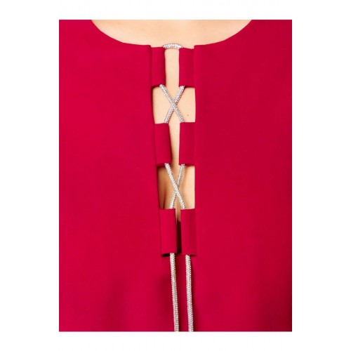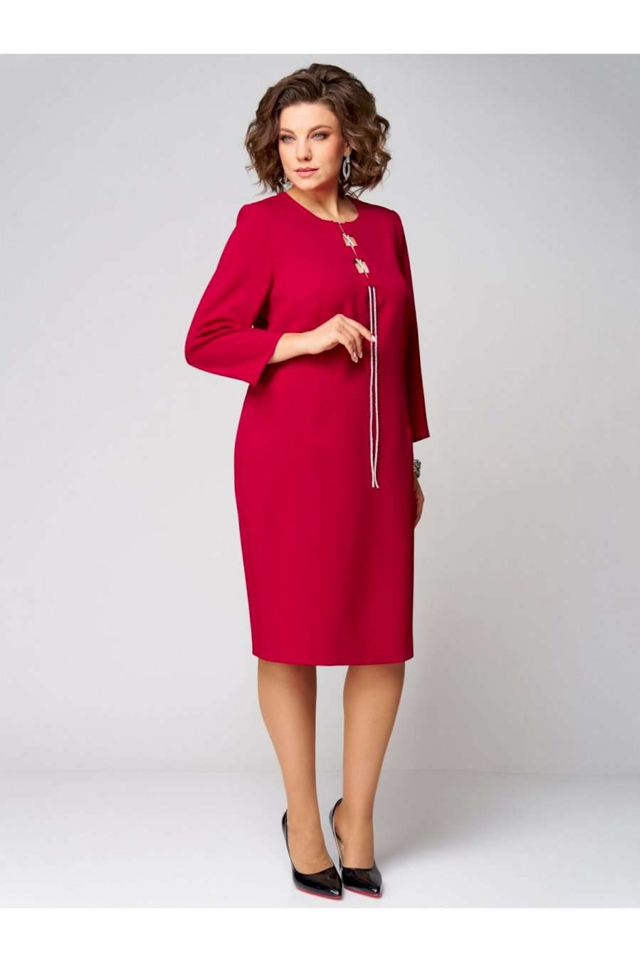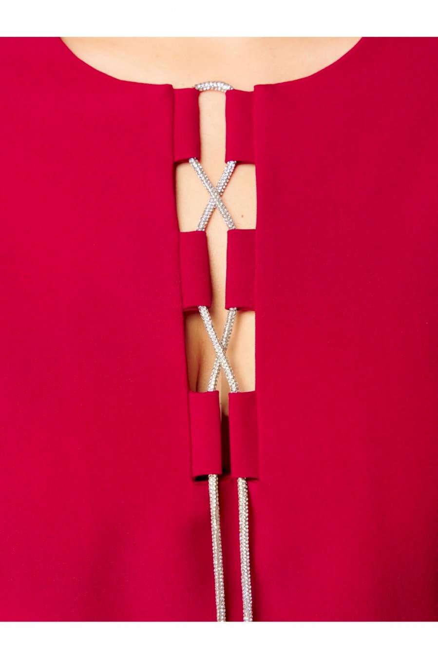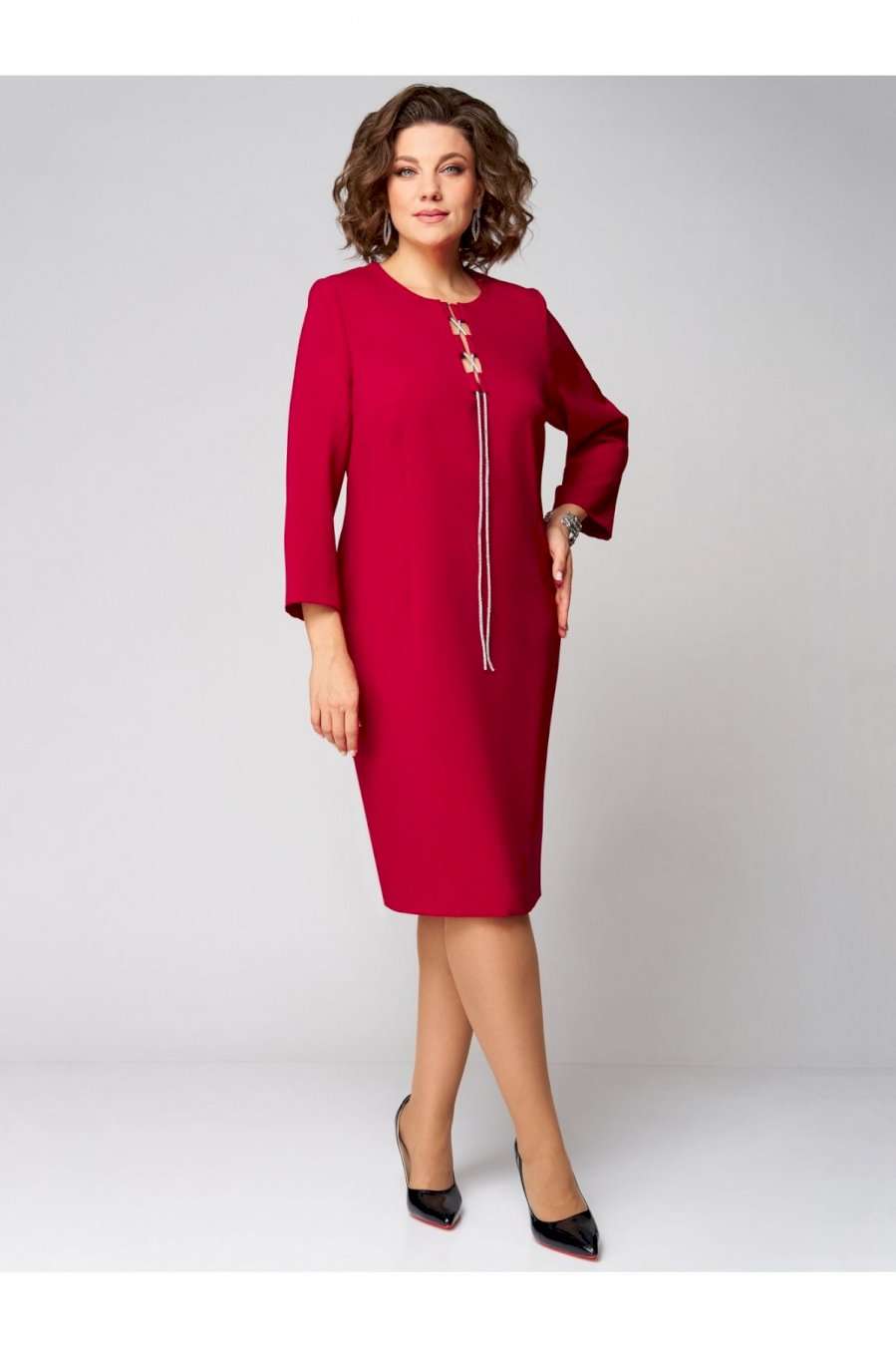 Платье полуприлегающего силуэта выполнено из поли вискозной ткани. Округлый вырез горловины, обработан обтачкой. По переду вертикальный вырез со шлевками , через них вдет декоративный шнур. По переду застрочены нагрудные и талевые вытачки. Синка с талевыми вытачками, средним швом и застежкой на потайную тесьму-молнию, по низу разрез. Рукав втачной, одношовный. Длина платья по спинке –105 см, длина рукава -53 см.Платье без подкладки.