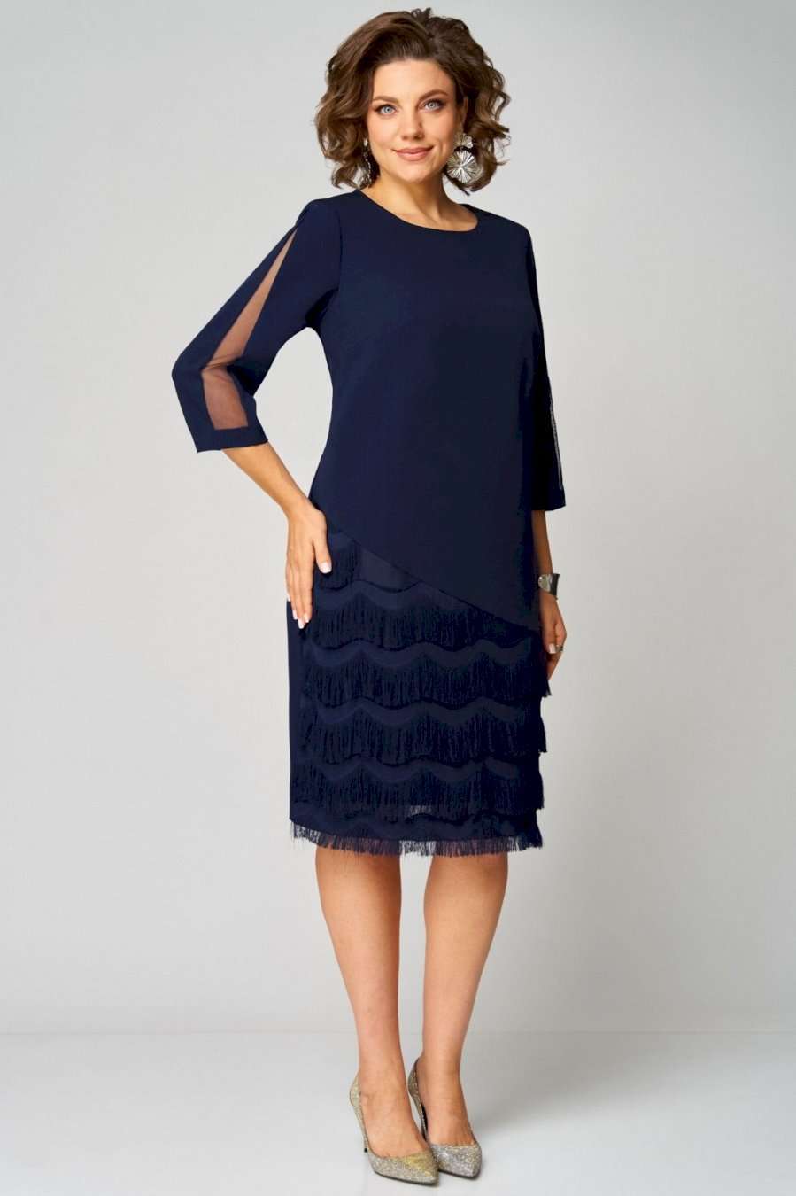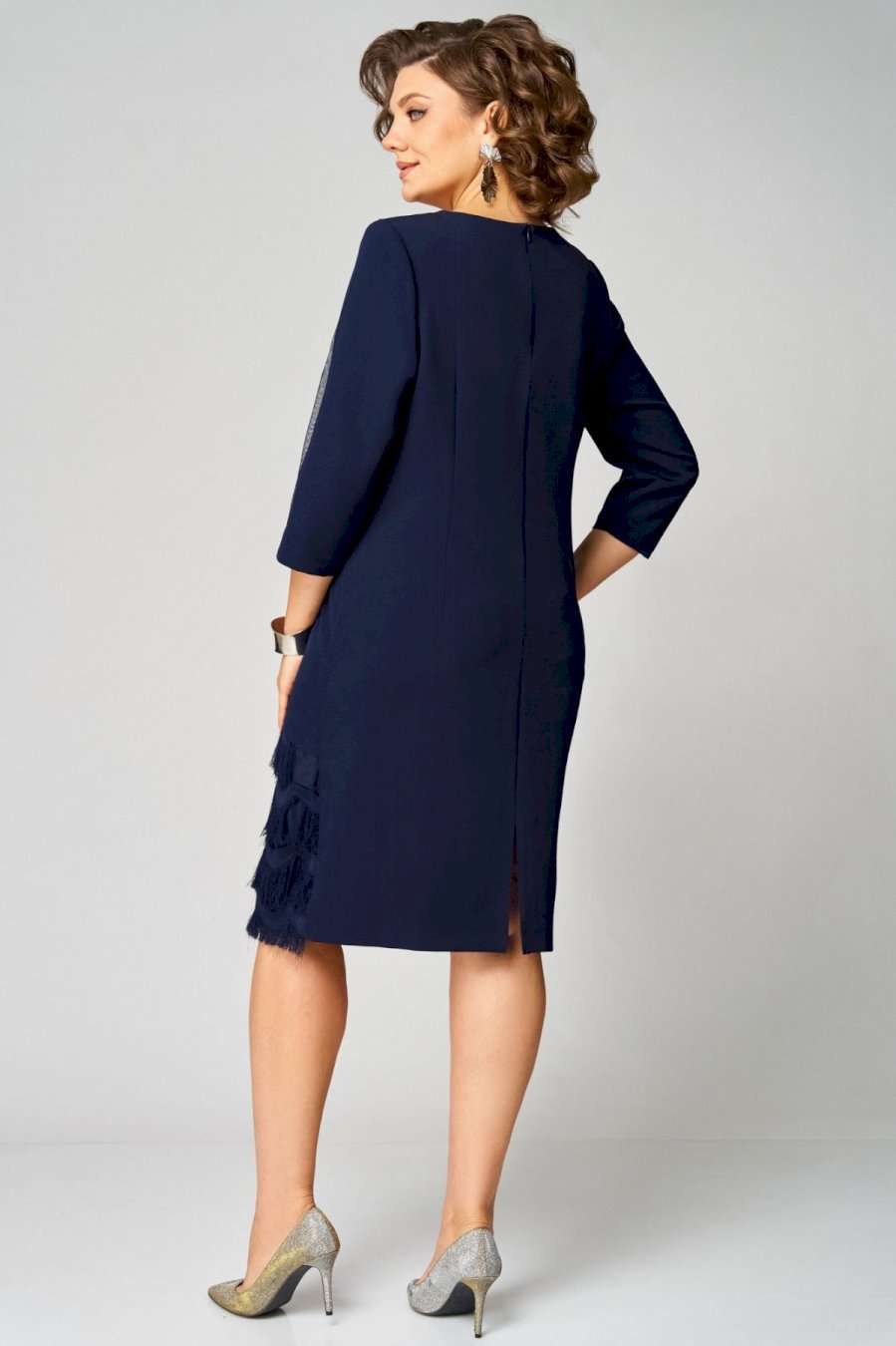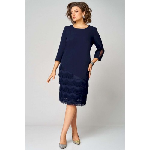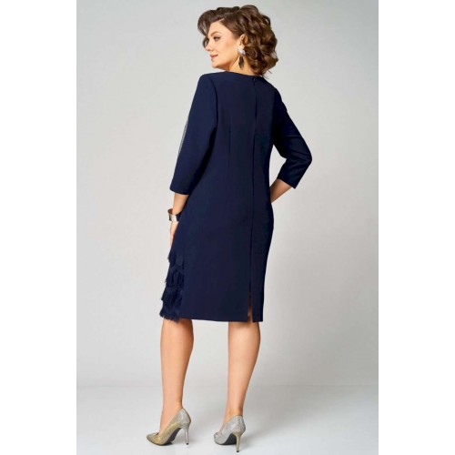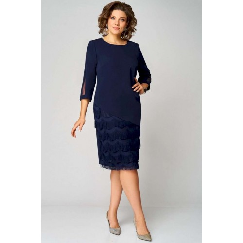 Платье полуприлегающего силуэта . Округлый вырез горловины, обработан обтачкой .Перед с нагрудными вытачками и подрезом из бахромы по диагонали. Трикотажная подкладка идет от подреза только по переду. Рукав втачной, по центру рукава вставка из сетки. Спинка со средним швом и разрезом по низу, застежка на потайную тесьму-молнию.