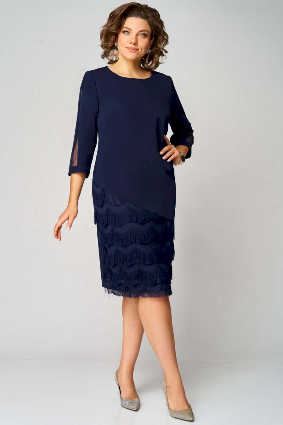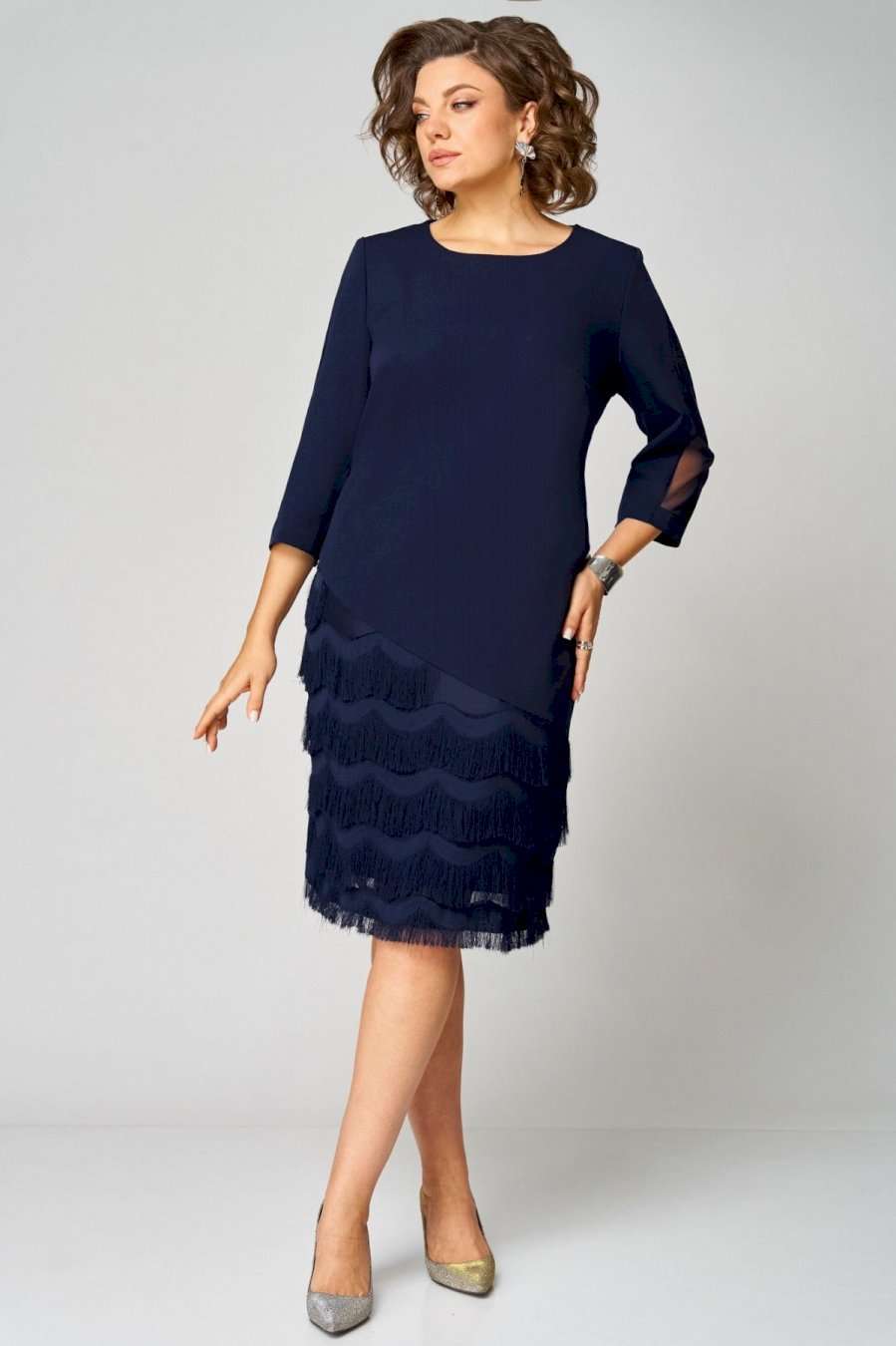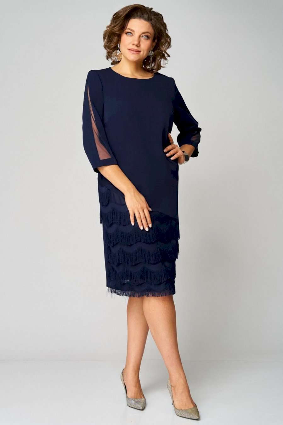 Платье полуприлегающего силуэта . Округлый вырез горловины, обработан обтачкой .Перед с нагрудными вытачками и подрезом из бахромы по диагонали. Трикотажная подкладка идет от подреза только по переду. Рукав втачной, по центру рукава вставка из сетки. Спинка со средним швом и разрезом по низу, застежка на потайную тесьму-молнию.