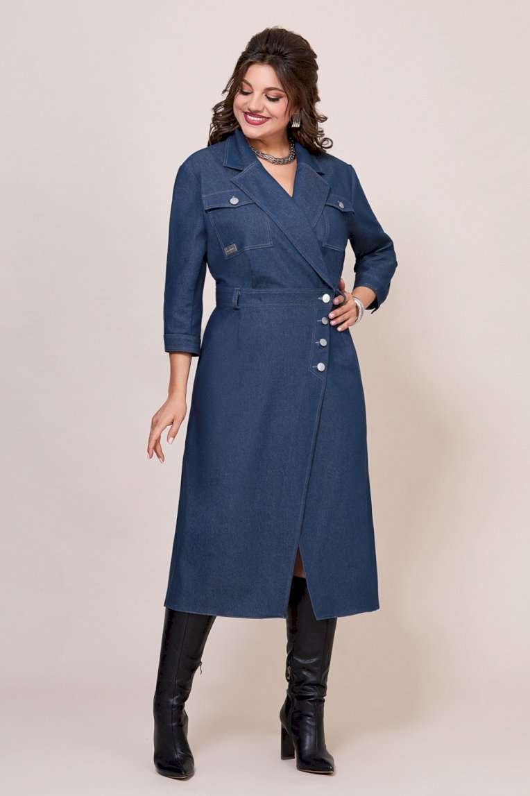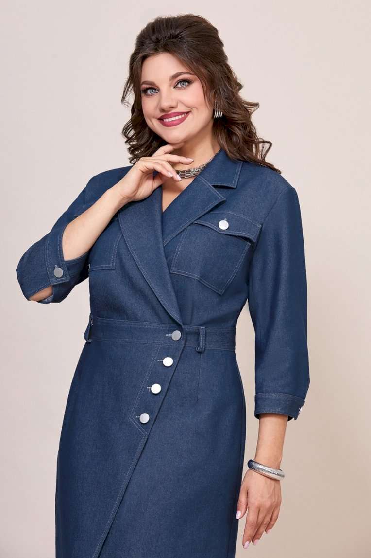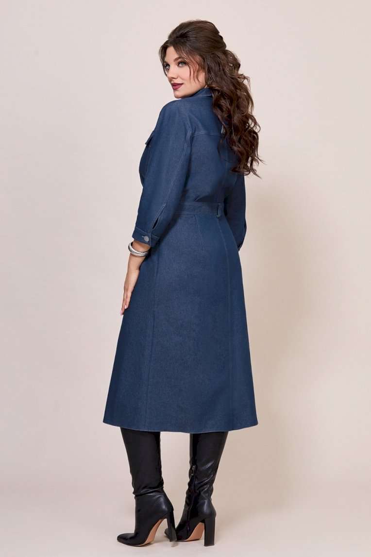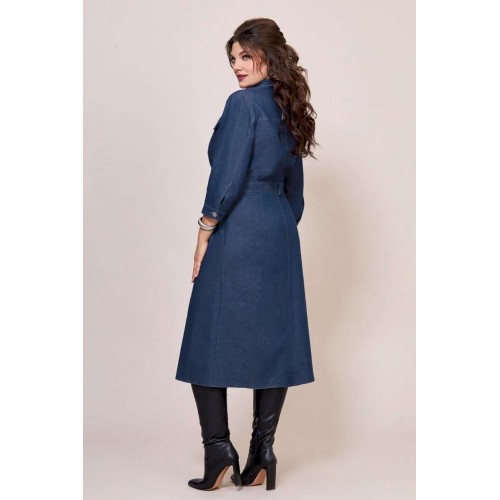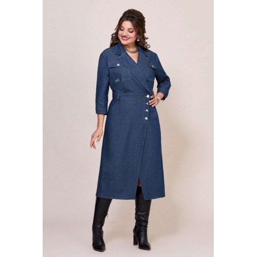 Стильное, женское платье полу-прилегающего силуэта, выполнено из джинсовой ткани. Лиф платья отрезной по линии талии, с втачным поясом. Лиф с V-образным вырезом, горловина обработана воротником пиджачного типа. Также на лифе обработаны накладные карманы с клапаном. Юбка платья А-образного силуэта, с ассиметричной застежкой на петли-пуговицы, по переду разрез. Рукав втачной, оптимальной длины, по низу манжет. Спинка отрезная по линии талии, с втачным поясом, на поясе шлевки, также на спинке обработана кокетка и средний шов, юбка также со средним швом. Эффектное и стильное платье из джинса всегда в тренде! Длина 118 см. в 52р. Ширина груди- 56см, Ширина талии -47см, Ширина бедер- 59см, длина рукава- 45см, ширина рукава 20см