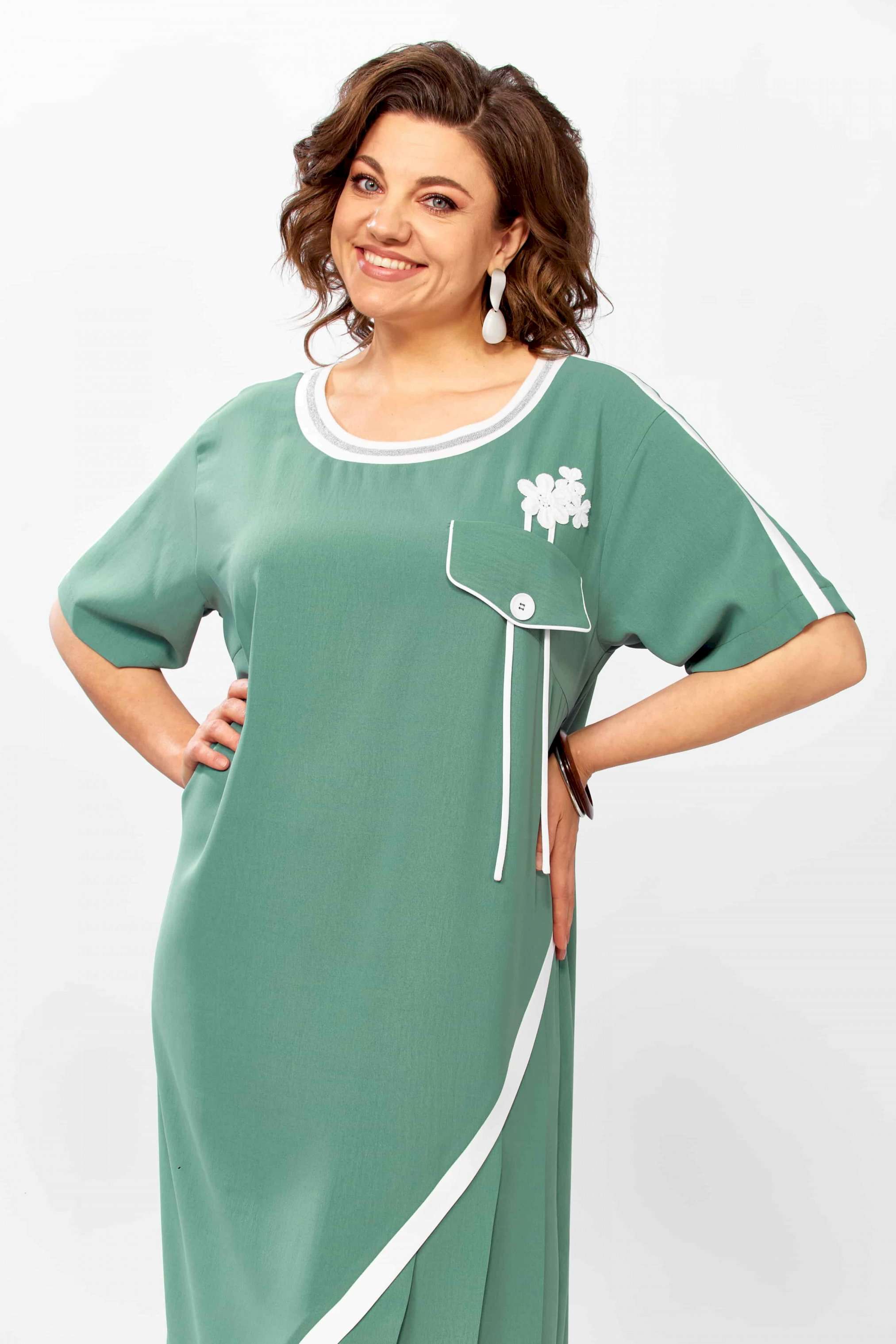 Летнее, женское платье свободного покроя, выполнено из льна-вишера. Горловина платья округлой формы, обработана довязом контрастного цвета, на полочке обработаны нагрудные вытачки, на лифе накладной карма с кантом контрастного цвет. Возле клапана выполнен декор в цветочном стиле, по низу полочки выполнен ассиметричный подрез с отделкой планкой контрастного цвета, на подрезе выполнены односторонние складки. Рукав втачной, укороченный, с планкой по середине контрастного цвета, которая переходит на плечо. Спинка выполнена из основной ткани, со средним швом. Легкое платье в спортивном стиле, с элементами романтики, универсальное и удобное для сочетаний как со спортивной обувью, также с обувью на каблуке или в классическом стиле. в 52р. Ширина груди- 61см, Ширина талии -60см, Ширина бедер- 66см, длина рукава- 23см, ширина рукава -23см.