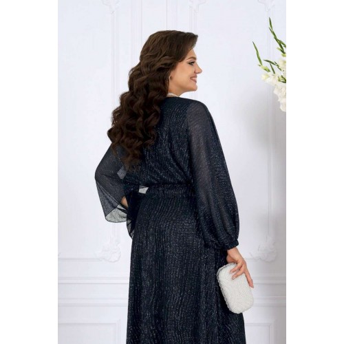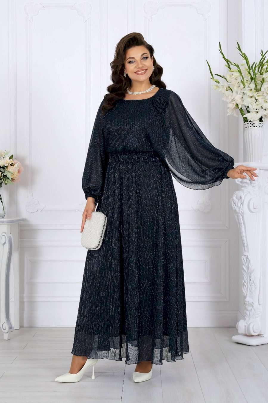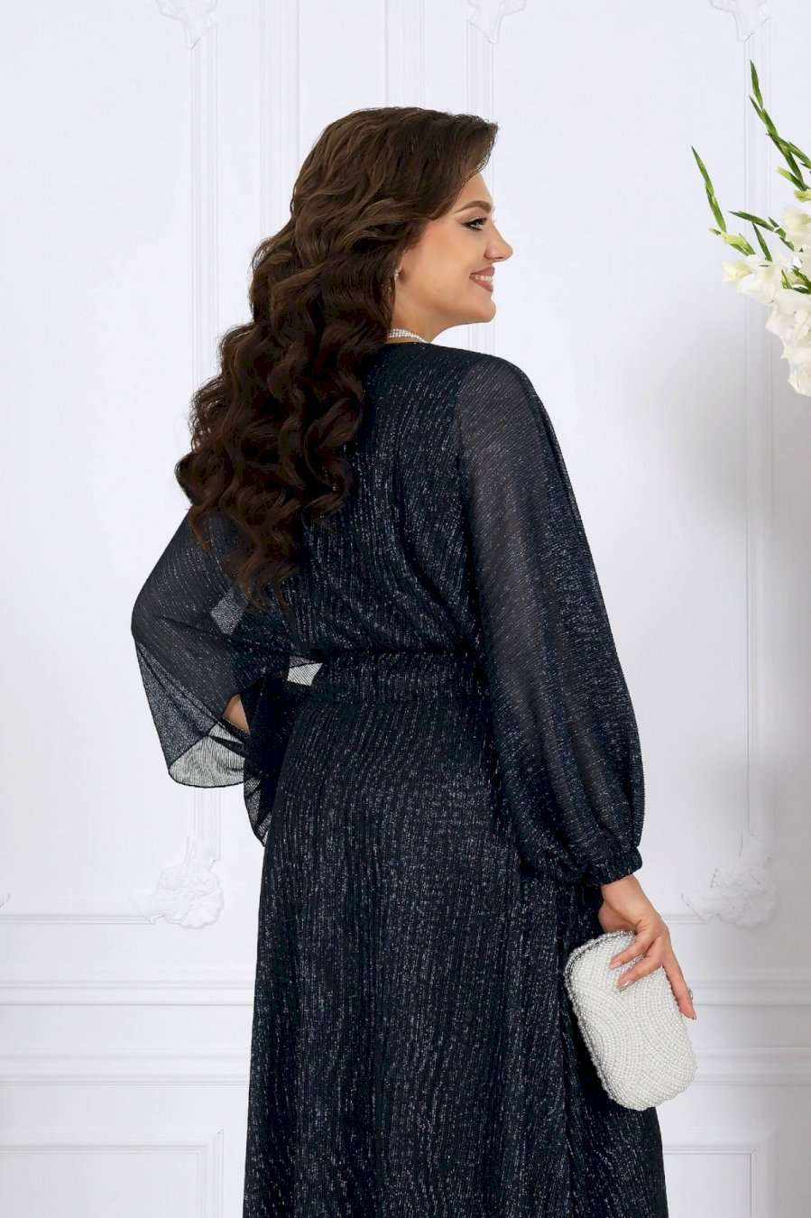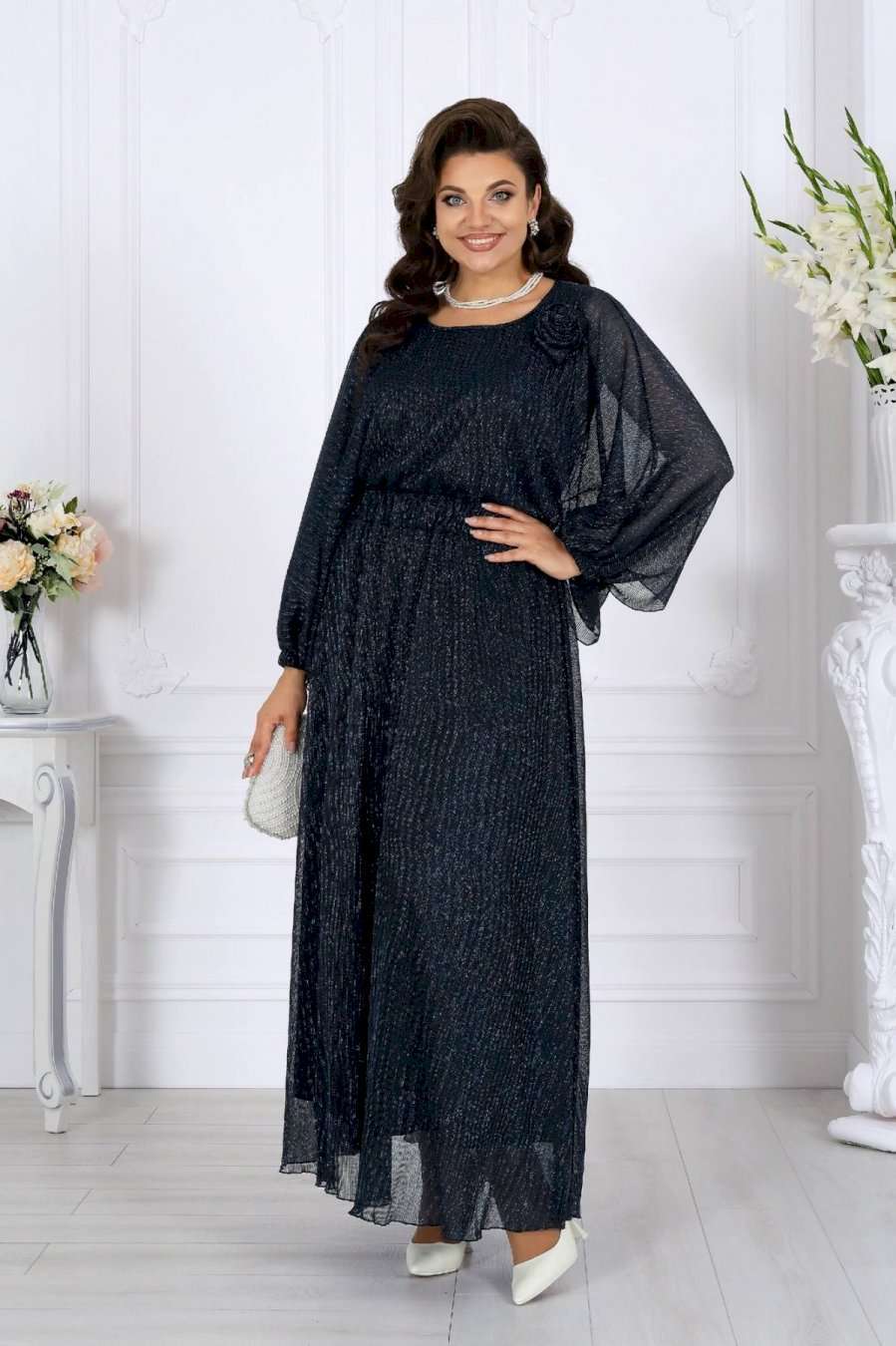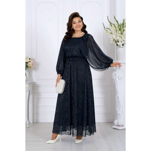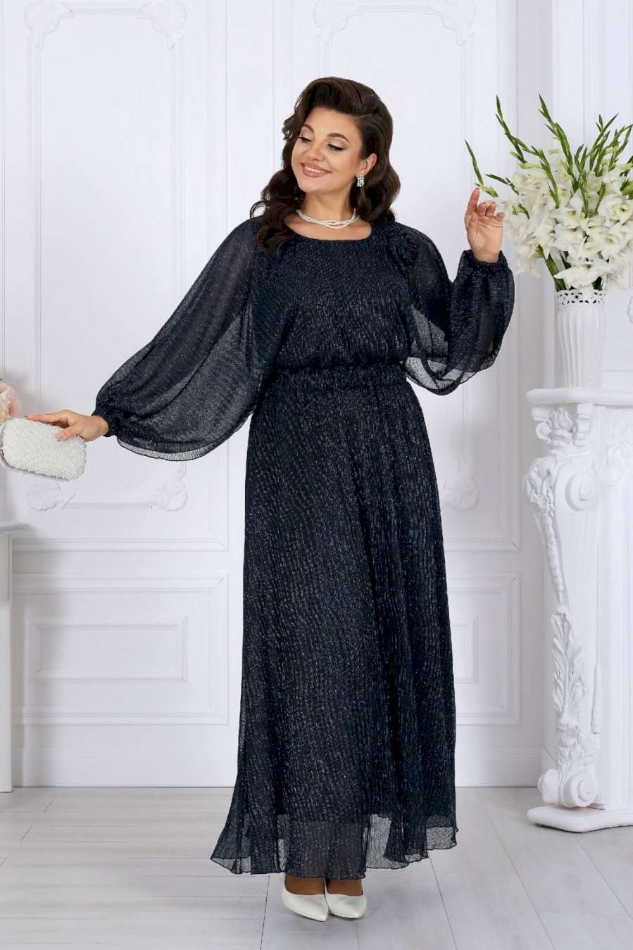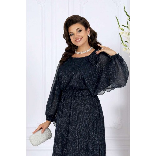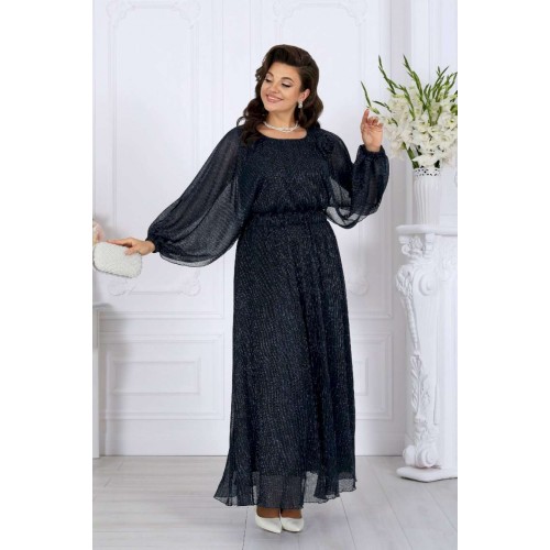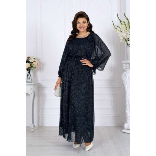 Элегантное вечернее платье в пол, созданное из воздушной сетки-гофре с нитью люрекс, — истинное воплощение праздничного блеска и женственности. Легкое мерцание ткани при каждом движении создает ощущение роскоши, а струящаяся юбка в пол формирует безупречный силуэт. Лиф со свободной посадкой деликатно драпируется, подчеркивая утонченность образа, а эластичная вставка на талии обеспечивает комфорт и идеальную посадку для фигур разных типов, включая большие размеры. Особый акцент — летящие рукава с разрезами и мягкой сборкой на манжетах, которые добавляют легкости и выразительности. Платье дополнено изысканной съемной декоративной деталью в виде «цветка», выполненного из основного полотна, что подчеркивает дизайнерский характер модели. Универсальное по стилю, оно идеально для самых значимых событий: свадеб, юбилеев, торжественных приемов или праздничных вечеров. Платье женское, приталенного силуэта, выполнено из сетки-гофре с нитью «люрекс». Модель на трикотажной подкладке, без застежки и плечевых накладок. Платье отрезное по линии талии, со свободным лифом и расширенной к низу юбкой. Для лучшего прилегания в области талии в отрезном поясе предусмотрена эластичная лента, вставленная по всей длине. Лиф цельнокроеный с рукавами, без боковых швов -- с разрезами от талии до манжет. Для регулирования длины рукава внутрь манжеты протянута эластичная лента. Горловина округлая, окантована узкой косой бейкой из основного материала. Платье дополнено съемным «цветком» з основного полотна. Длина платья (от горловины спинки) – 139 см, длина платья (от талии спинки) – 97 см; длина рукава (от горловины до манжеты) – 70 см (50-52 р-р), 71 см (54-58 р-р).