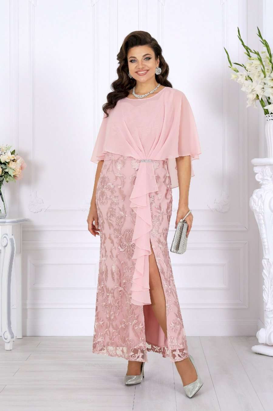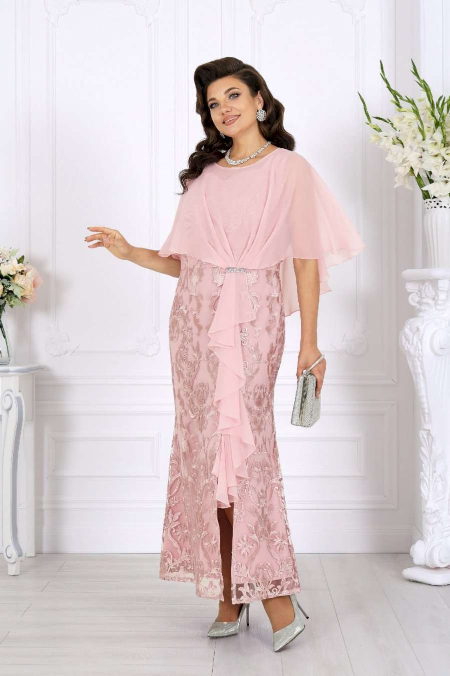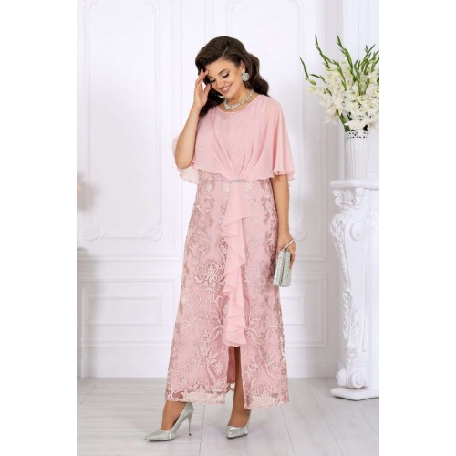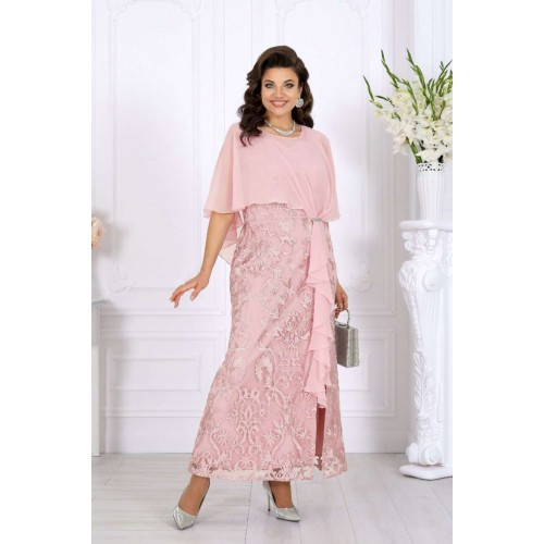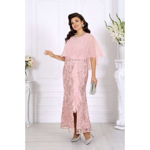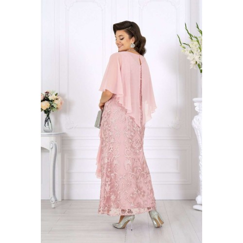 Роскошное длинное платье всегда смотрится благородно и празднично, а продуманное сочетание тканей делает образ особенно выразительным. Основу платья составляет комбинация двух слоев: нижний – гладкий сатин, придающий силуэту глубину и плотность, верхний – изысканный гипюр с утончённым цветочным узором. Такое сочетание смотрится дорого и нарядно, создавая эффект объема и игры фактур. Юбка-годе мягко расширяется к низу, формируя стройный и плавный силуэт, а изящный разрез добавляет образу легкую смелость и кокетство. Особое внимание привлекает асимметричная пелерина из воздушного шифона. Она красиво драпируется спереди, фиксируясь в линии талии, и мягко ниспадает по спинке. Легкая полупрозрачность шифона вносит нотку романтики, а волан, проходящий по линии разреза, придает платью динамику и утонченное движение. Акцент в виде декоративного узла, украшенного тесьмой со стразами, сияет при свете и завершает праздничный образ. V-образный вырез на спинке подчеркивает изящество фигуры и делает образ более открытым и женственным. Потайная молния обеспечивает удобство и сохраняет безупречность силуэта. Это платье идеально подойдет для торжественных случаев: свадьбы, юбилея, выпускного, корпоративного вечера или любого особенного праздника. Оно гармонично смотрится в больших размерах и станет отличным выбором для женщин, ценящих качество, стиль и комфорт. В этом вечернем нарядном платье каждая женщина будет чувствовать себя королевой — уверенной, красивой и неповторимой. Платье женское, отрезное по линии талии, с лифом прилегающего силуэта и юбкой-годе. Перед и спинка состоят из двух разных по длине слоев: верхний выполнен из гипюра, нижний – из сатина. Модель без подкладки, без воротника, без рукавов и плечевых накладок. Спинка с рельефными швами, направленными от пройм до талии, с застежкой на потайную тесьму-«молнию» (50см) в среднем шве и V-образным вырезом горловины. Перед с рельефными швами, направленными от пройм до талии, с фигурным вырезом горловины и разрезом в нижней части юбки. Платье дополняется несъемной асимметричной пелериной из шифона: спереди задрапирована складками и входит в шов талии, по горловине спинки застегивается на пуговицу и навесную петельку. От пелерины вниз, по рельефу и разрезу настрочен волан из шифона. Узел декорирован тесьмой со стразами. Длина платья по среднему шву спинки (от горловины пелерины) - 139 см; длина платья по среднему шву спинки (от талии) – 100 см.