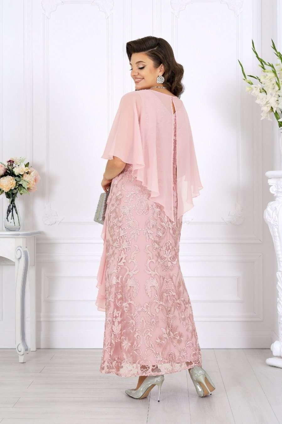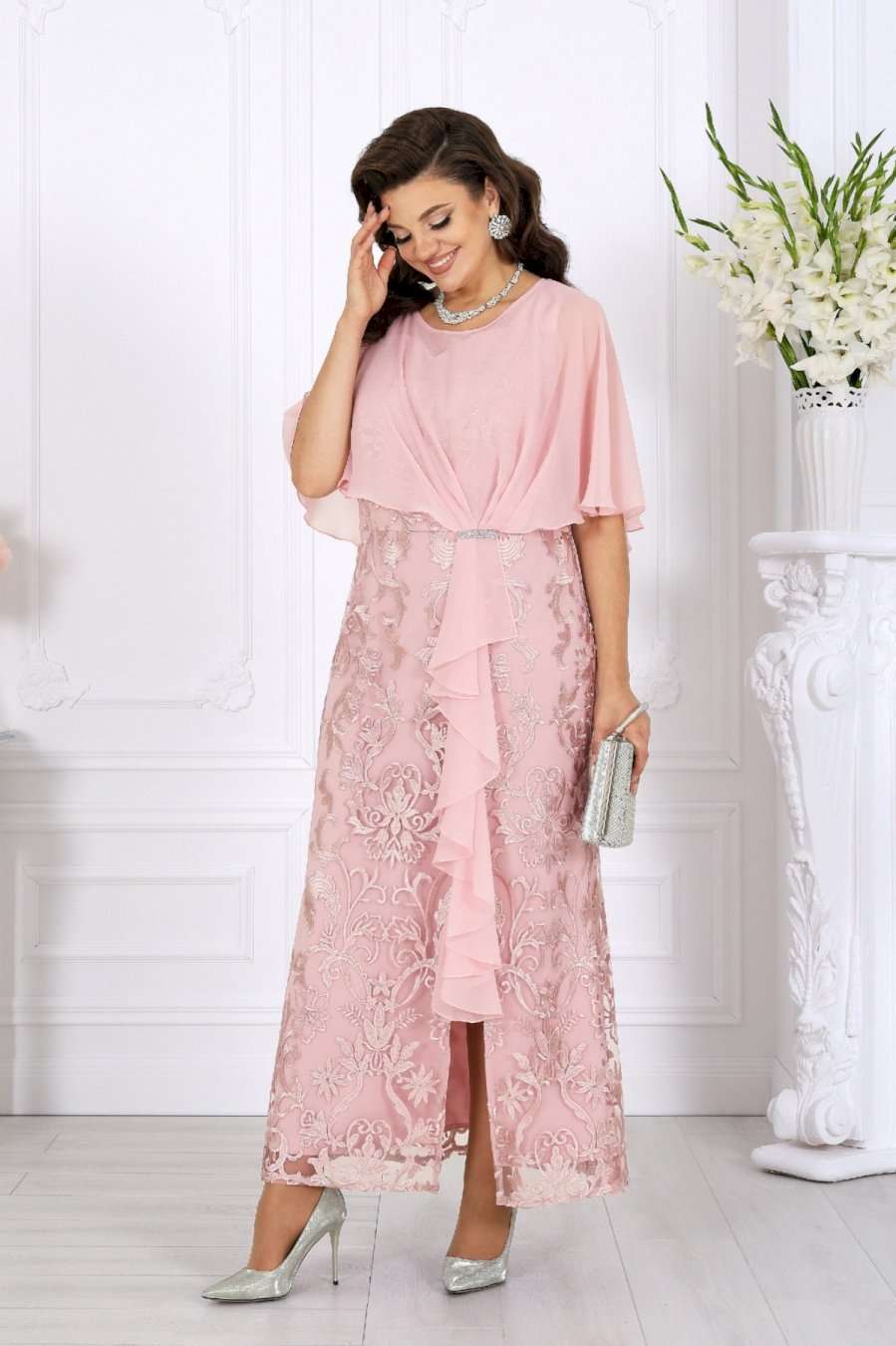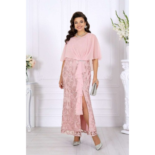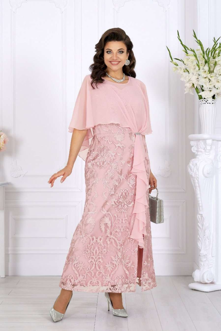Роскошное длинное платье всегда смотрится благородно и празднично, а продуманное сочетание тканей делает образ особенно выразительным. Основу платья составляет комбинация двух слоев: нижний – гладкий сатин, придающий силуэту глубину и плотность, верхний – изысканный гипюр с утончённым цветочным узором. Такое сочетание смотрится дорого и нарядно, создавая эффект объема и игры фактур. Юбка-годе мягко расширяется к низу, формируя стройный и плавный силуэт, а изящный разрез добавляет образу легкую смелость и кокетство. Особое внимание привлекает асимметричная пелерина из воздушного шифона. Она красиво драпируется спереди, фиксируясь в линии талии, и мягко ниспадает по спинке. Легкая полупрозрачность шифона вносит нотку романтики, а волан, проходящий по линии разреза, придает платью динамику и утонченное движение. Акцент в виде декоративного узла, украшенного тесьмой со стразами, сияет при свете и завершает праздничный образ. V-образный вырез на спинке подчеркивает изящество фигуры и делает образ более открытым и женственным. Потайная молния обеспечивает удобство и сохраняет безупречность силуэта. Это платье идеально подойдет для торжественных случаев: свадьбы, юбилея, выпускного, корпоративного вечера или любого особенного праздника. Оно гармонично смотрится в больших размерах и станет отличным выбором для женщин, ценящих качество, стиль и комфорт. В этом вечернем нарядном платье каждая женщина будет чувствовать себя королевой — уверенной, красивой и неповторимой. Платье женское, отрезное по линии талии, с лифом прилегающего силуэта и юбкой-годе. Перед и спинка состоят из двух разных по длине слоев: верхний выполнен из гипюра, нижний – из сатина. Модель без подкладки, без воротника, без рукавов и плечевых накладок. Спинка с рельефными швами, направленными от пройм до талии, с застежкой на потайную тесьму-«молнию» (50см) в среднем шве и V-образным вырезом горловины. Перед с рельефными швами, направленными от пройм до талии, с фигурным вырезом горловины и разрезом в нижней части юбки. Платье дополняется несъемной асимметричной пелериной из шифона: спереди задрапирована складками и входит в шов талии, по горловине спинки застегивается на пуговицу и навесную петельку. От пелерины вниз, по рельефу и разрезу настрочен волан из шифона. Узел декорирован тесьмой со стразами. Длина платья по среднему шву спинки (от горловины пелерины) - 139 см; длина платья по среднему шву спинки (от талии) – 100 см.