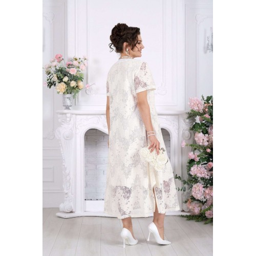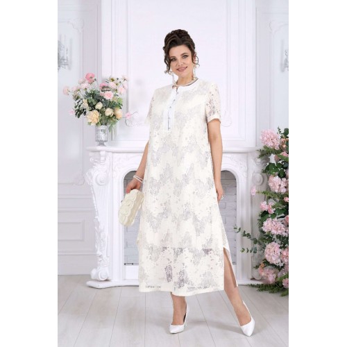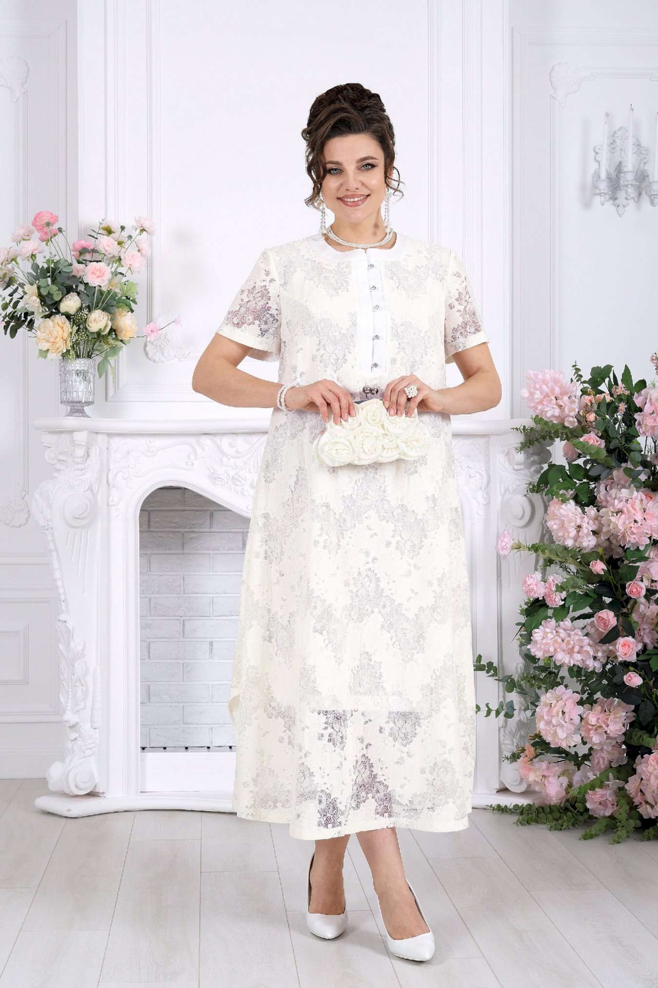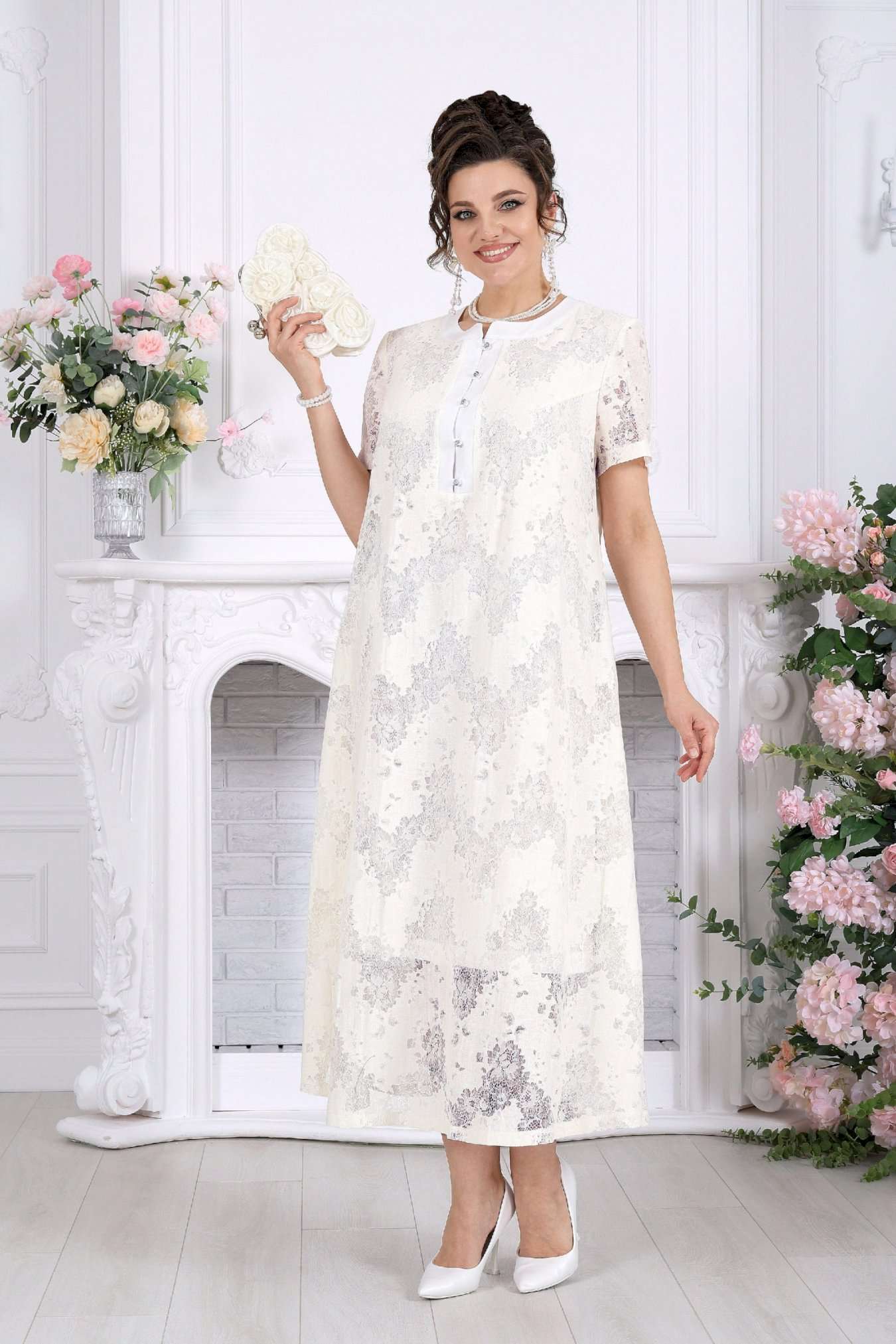 Платье, в котором хочется быть. Это универсальное праздничное платье легко адаптируется под разные события: добавьте каблуки и аксессуары — и перед вами роскошный вечерний образ, или оставьте минимализм — для элегантного дневного выхода. Нежный хлопковый гипюр создает эффект легкой дымки на коже. Платье красиво играет на свету, подчеркивая фактуру кружева и добавляя образу благородства. Это платье — про утонченность без усилий. Легкое кружево, мягкий силуэт и продуманные детали создают образ, который выглядит элегантно в любой ситуации. А-силуэт мягко скользит по фигуре, не подчеркивая лишнего и даря ощущение свободы. Полупрозрачный гипюр с деликатным рисунком добавляет глубину образу, а хлопковая подкладка делает его комфортным даже в течение долгого дня. Это платье не требует сложных сочетаний — оно само становится завершённым образом. Платье женское А-силуэта, выполнено из гипюра х/б. Модель на х/б подкладке. По центру полочки оформлена застежка с притачными планками до линии груди. На планке обработана застёжка на 5 навесных петель и 5 пуговиц. Рукав в платье втачной короткий. Перед с нагрудными вытачками, направленными от пройм. Горловина оформлена воротником стойка. По боковым швам, внизу платья оформлены фигурные разрезы. Длина платья – см (50-54 р-р), см (56-66 р-р); длина рукава- см.