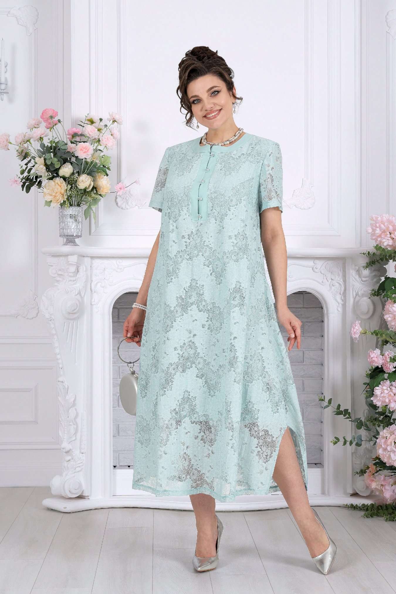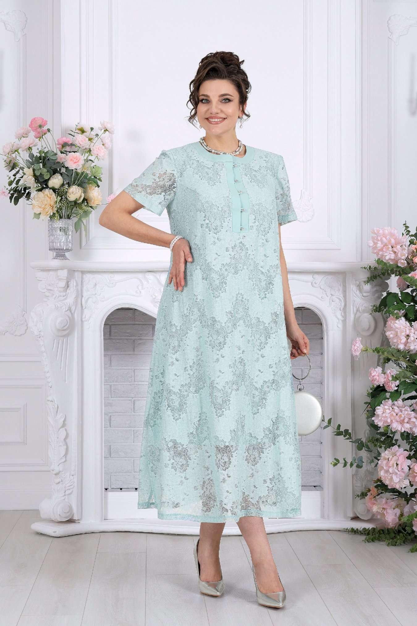 Платье, в котором хочется быть. Это универсальное праздничное платье легко адаптируется под разные события: добавьте каблуки и аксессуары — и перед вами роскошный вечерний образ, или оставьте минимализм — для элегантного дневного выхода. Нежный хлопковый гипюр создает эффект легкой дымки на коже. Платье красиво играет на свету, подчеркивая фактуру кружева и добавляя образу благородства. Это платье — про утонченность без усилий. Легкое кружево, мягкий силуэт и продуманные детали создают образ, который выглядит элегантно в любой ситуации. А-силуэт мягко скользит по фигуре, не подчеркивая лишнего и даря ощущение свободы. Полупрозрачный гипюр с деликатным рисунком добавляет глубину образу, а хлопковая подкладка делает его комфортным даже в течение долгого дня. Это платье не требует сложных сочетаний — оно само становится завершённым образом. Платье женское А-силуэта, выполнено из гипюра х/б. Модель на х/б подкладке. По центру полочки оформлена застежка с притачными планками до линии груди. На планке обработана застёжка на 5 навесных петель и 5 пуговиц. Рукав в платье втачной короткий. Перед с нагрудными вытачками, направленными от пройм. Горловина оформлена воротником стойка. По боковым швам, внизу платья оформлены фигурные разрезы. Длина платья – см (50-54 р-р), см (56-66 р-р); длина рукава- см.