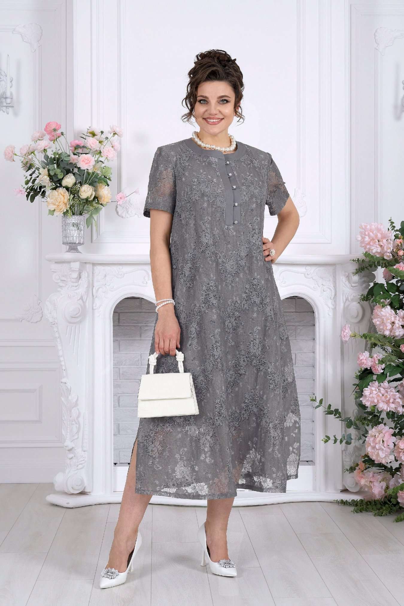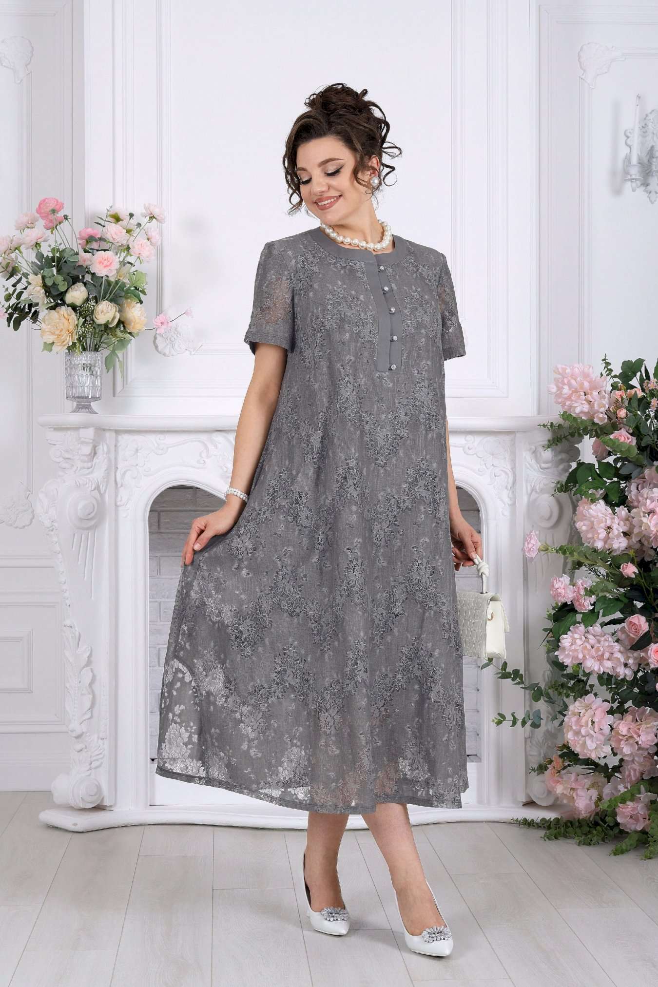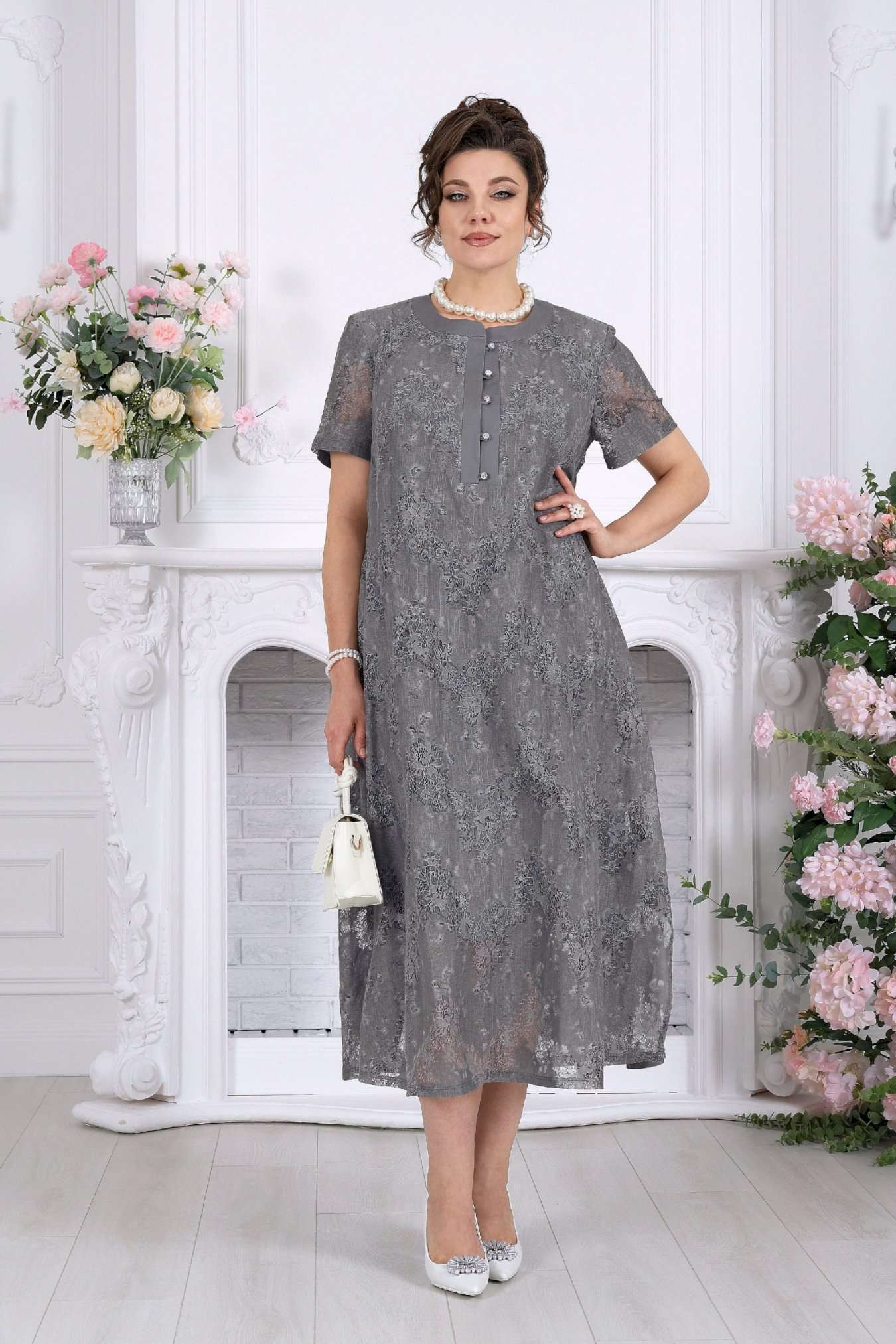 Платье, в котором хочется быть. Это универсальное праздничное платье легко адаптируется под разные события: добавьте каблуки и аксессуары — и перед вами роскошный вечерний образ, или оставьте минимализм — для элегантного дневного выхода. Нежный хлопковый гипюр создает эффект легкой дымки на коже. Платье красиво играет на свету, подчеркивая фактуру кружева и добавляя образу благородства. Это платье — про утонченность без усилий. Легкое кружево, мягкий силуэт и продуманные детали создают образ, который выглядит элегантно в любой ситуации. А-силуэт мягко скользит по фигуре, не подчеркивая лишнего и даря ощущение свободы. Полупрозрачный гипюр с деликатным рисунком добавляет глубину образу, а хлопковая подкладка делает его комфортным даже в течение долгого дня. Это платье не требует сложных сочетаний — оно само становится завершённым образом. Платье женское А-силуэта, выполнено из гипюра х/б. Модель на х/б подкладке. По центру полочки оформлена застежка с притачными планками до линии груди. На планке обработана застёжка на 5 навесных петель и 5 пуговиц. Рукав в платье втачной короткий. Перед с нагрудными вытачками, направленными от пройм. Горловина оформлена воротником стойка. По боковым швам, внизу платья оформлены фигурные разрезы. Длина платья – см (50-54 р-р), см (56-66 р-р); длина рукава- см.