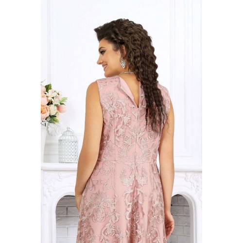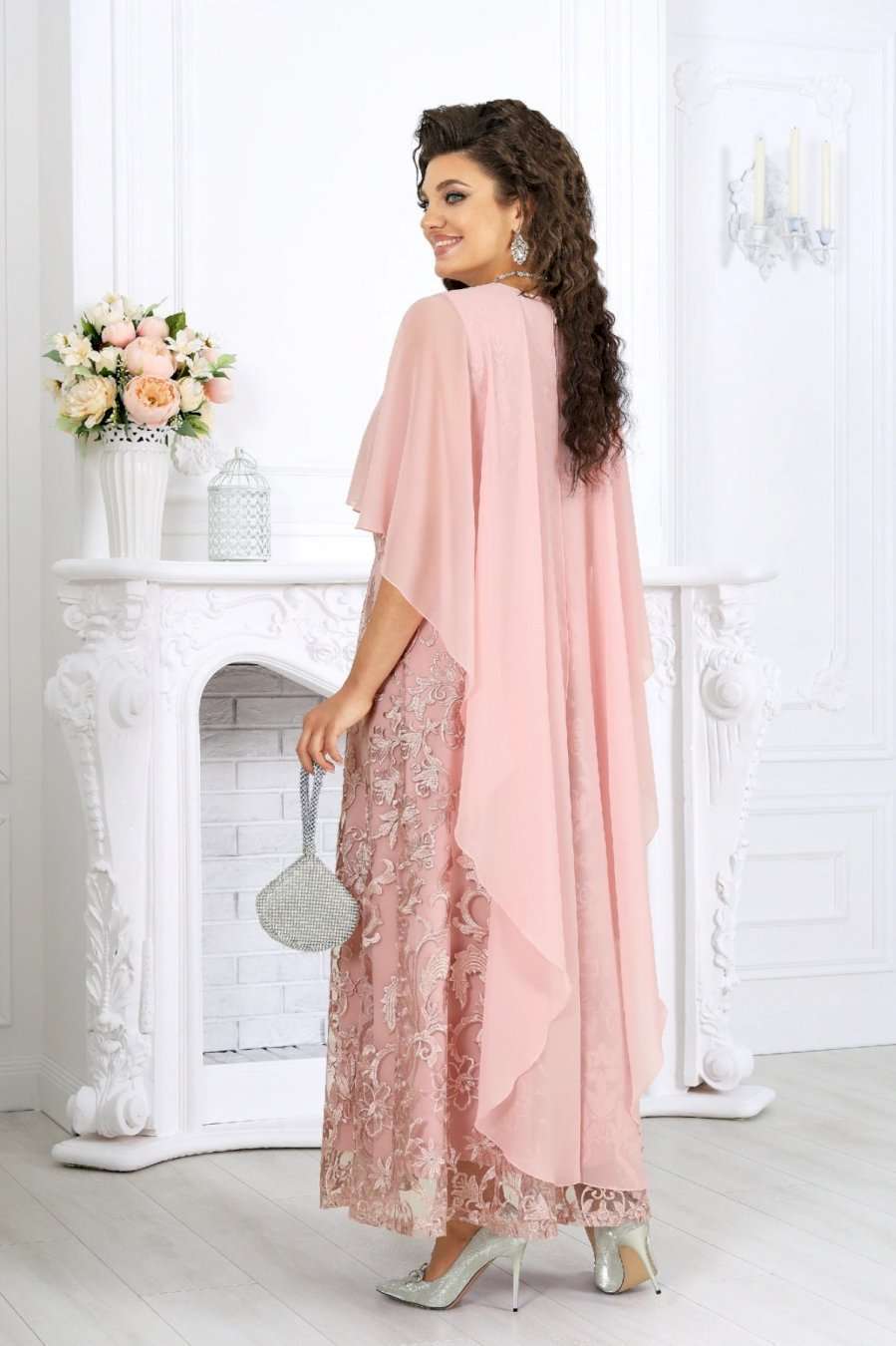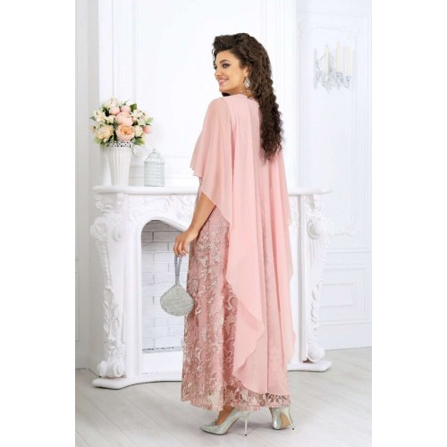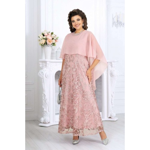 Роскошное вечернее платье в пол с пелериной – идеальный выбор для торжественного события. Это элегантное платье изысканно подчеркивает фигуру и придает образу воздушную легкость. Выполненное из качественного гипюра и гладкой плательной ткани "сатин", оно сочетает в себе классический силуэт и утонченную отделку. Фишкой модели становится асимметричная шифоновая пелерина, которую можно легко снять или надеть в зависимости от настроения. Пелерина добавляет легкости, грации и романтичного шика, а также маскирует зону плеч, если это необходимо. Платье женское, выполнено из гипюра и плательной ткани «сатин». Перед и спинка состоят из двух разных по длине слоев: нижний короче верхнего на 10 см. Модель без подкладки, без рукавов и плечевых накладок, без воротника. Платье отрезное по линии талии, с лифом прилегающего силуэта и расширенной к низу юбкой. Верхний и нижний слои материалов лифа скреплены по горловине, проймам, плечевым и рельефным швам переда и спинки. Верхний и нижний слои юбки скреплены только по лини талии; на переднем и заднем полотнищах верхней юбки обработаны рельефные швы. В среднем шве спинки предусмотрена застежка на потайную тесьму-«молнию» (50см). Вырез горловины переда и спинки округлый, углубленный по переду. Платье дополняется пелериной из шифона, разъемной по середине спинки; низ пелерины асимметричный, укороченный спереди. Пелерина пристегивается по горловине платья на 2 навесные петельки и 2 маленькие пуговицы. Длина платья (верхний слой) - 133 см. Длина пелерины – 128 см.