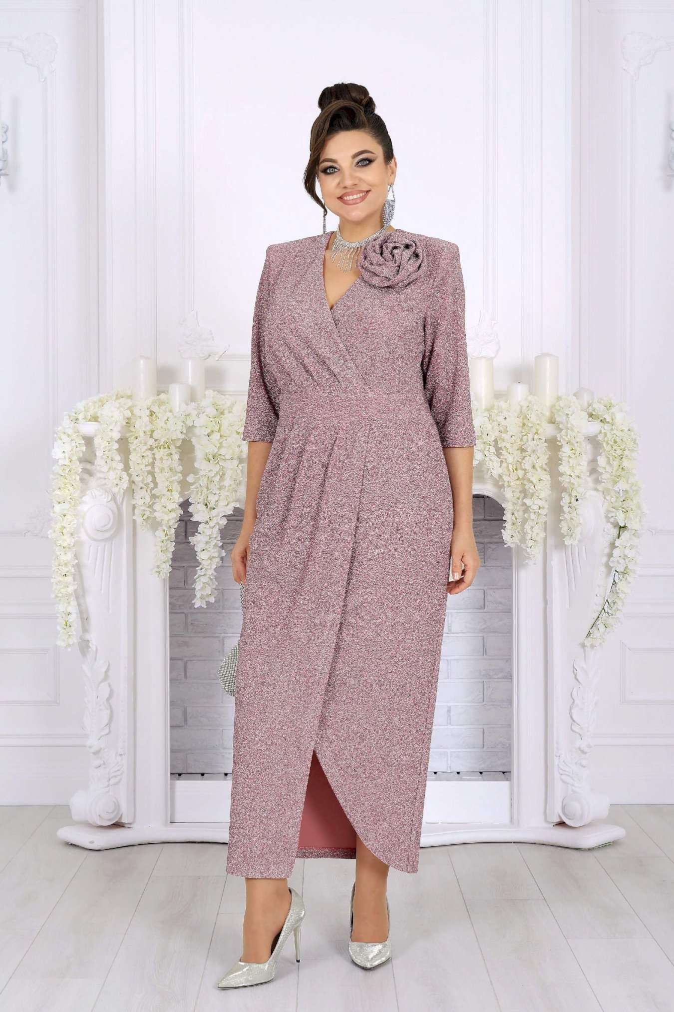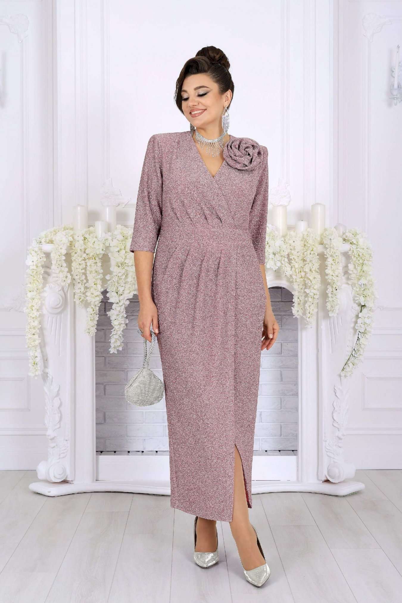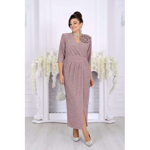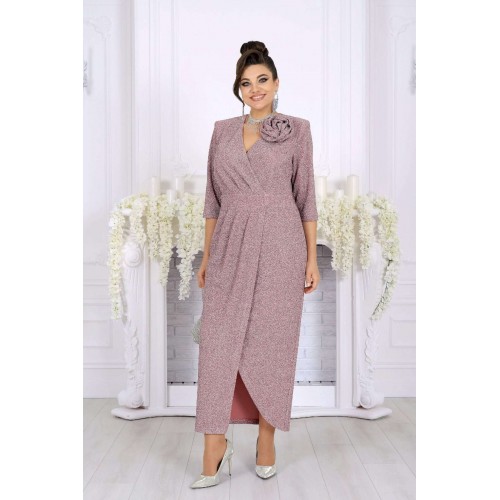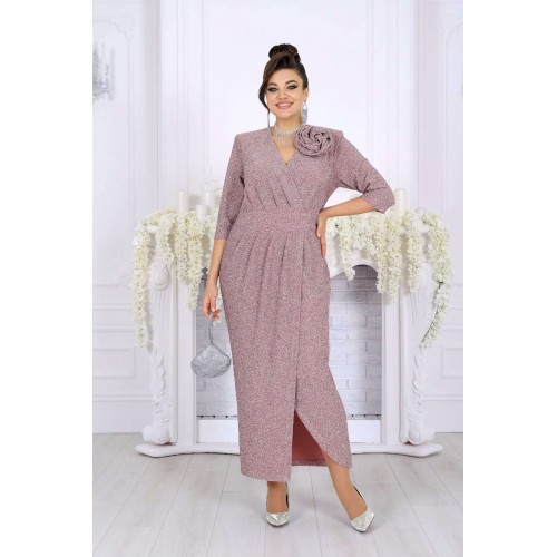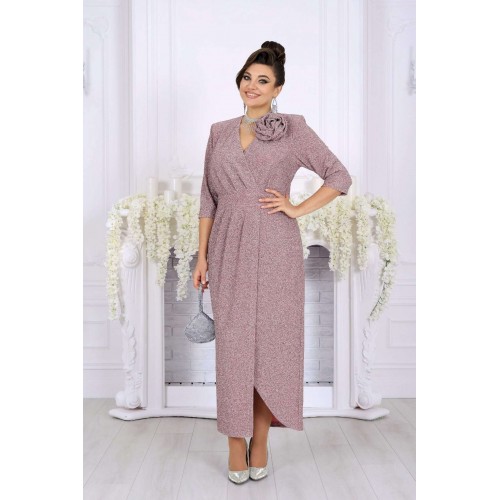 Стильное и эффектное платье для тех, кто хочет блистать на любом празднике. Модель выполнена из эластичного трикотажа с люрексом — ткань красиво переливается и подчёркивает изысканность образа. Удобный крой с акцентом на талию, запах и мягкие складки визуально вытягивают силуэт, а асимметричный низ добавляет динамики. Съемный цветок позволяет менять настроение образа — от сдержанного до яркого и романтичного. Это платье создано для женщин, которые ценят комфорт и красоту в каждом движении. Платье женское полуприлегающего силуэта, выполнено из трикотажного полотна с фактурной лицевой стороной «люрекс». Модель на трикотажной подкладке, с плечевыми накладками. На правой части переда, вдоль отрезного пояса, заложены косые односторонние складки; детали лифа и юбки скреплены на запах. Низ платья асимметричный: правая часть переда -- удлинена к центру и оформлена углом, левая -- скругленная и входит в правый боковой шов. На спинке обработаны талиевые вытачки. В левом боковом шве предусмотрена застежка на потайную тесьму-«молнию» (35 см). Рукав длиной 3/4, втачной. Платье дополнено съемным «цветком» из основного полотна. Длина платья-138 см; длина рукава-41 см.