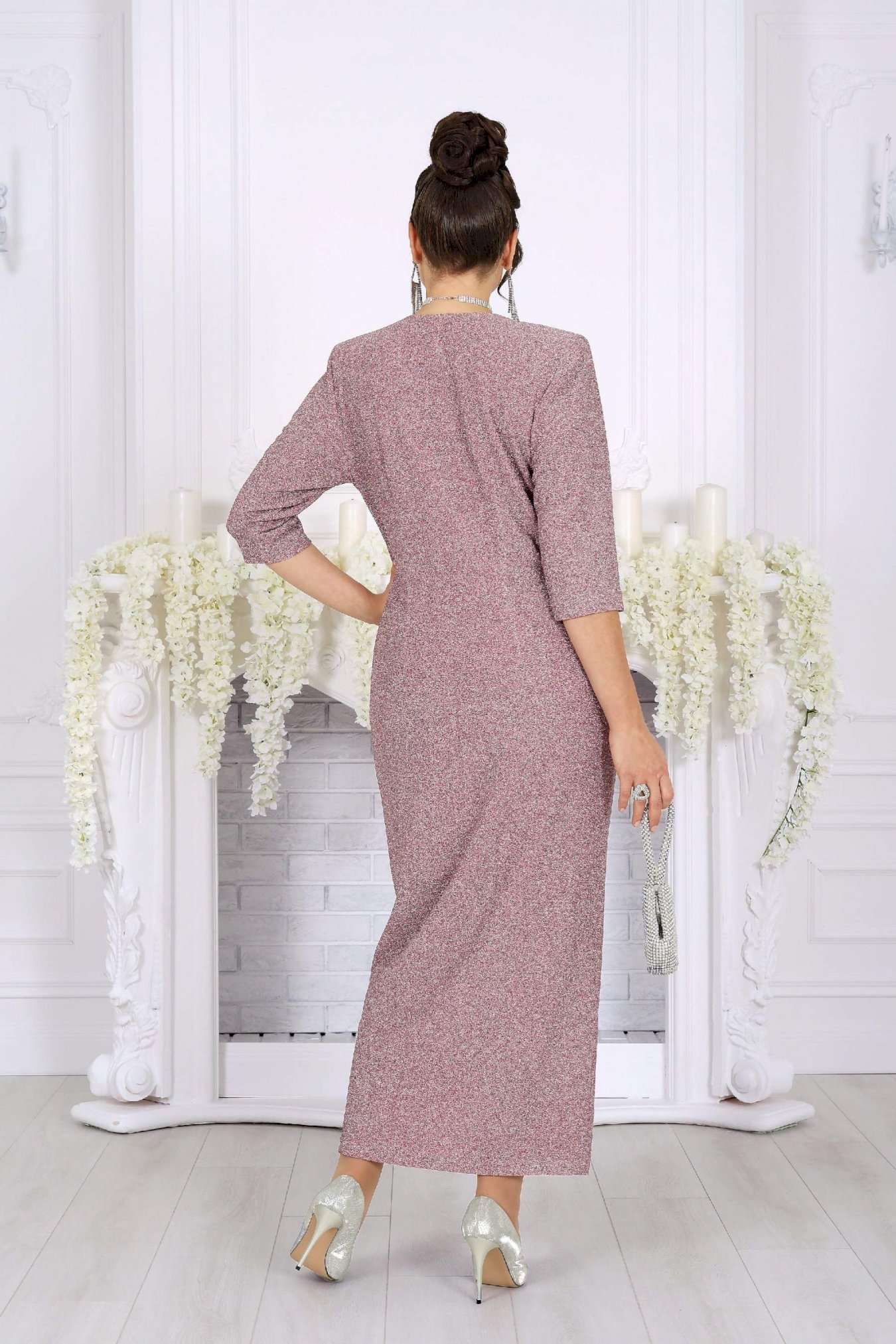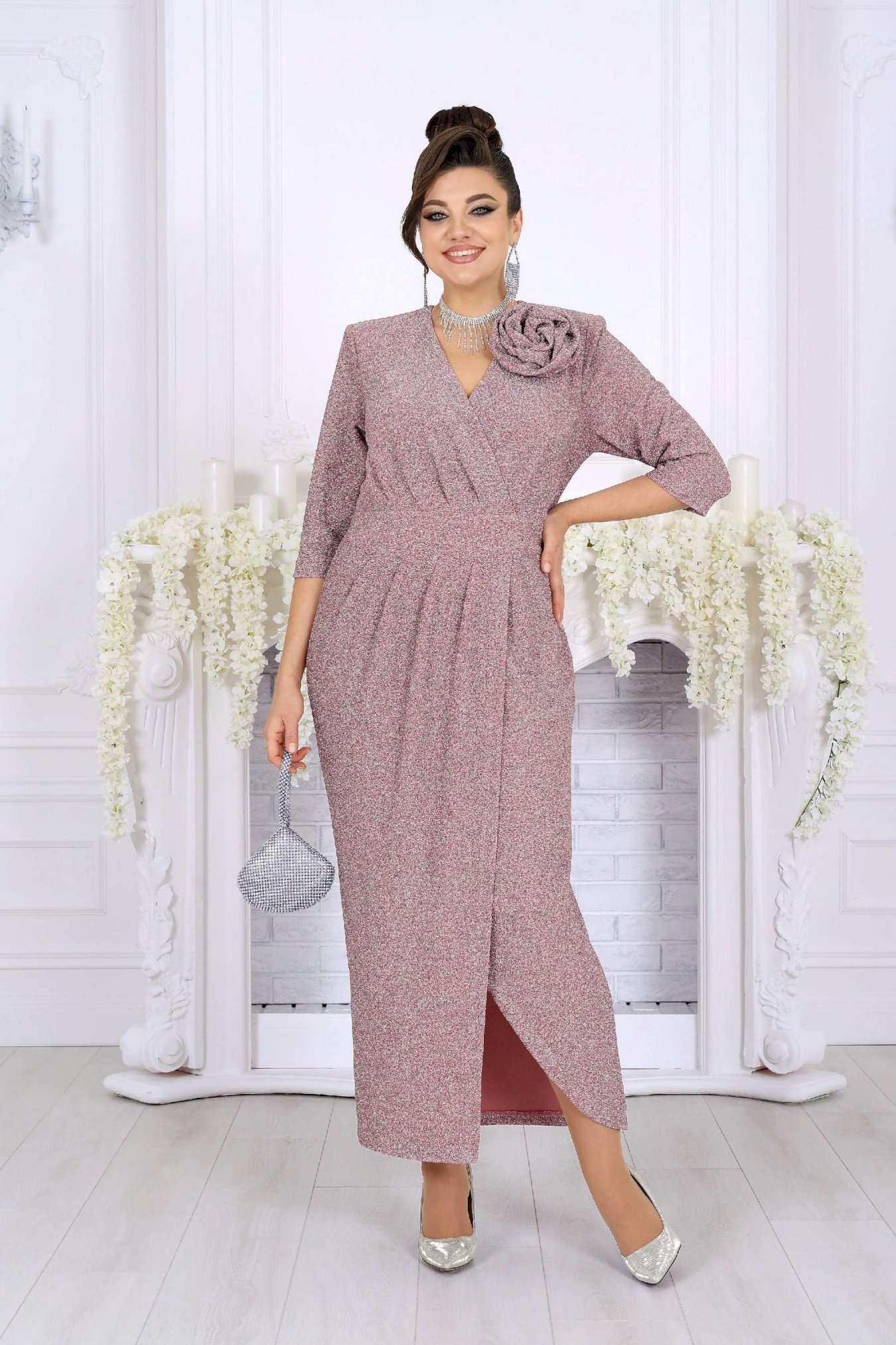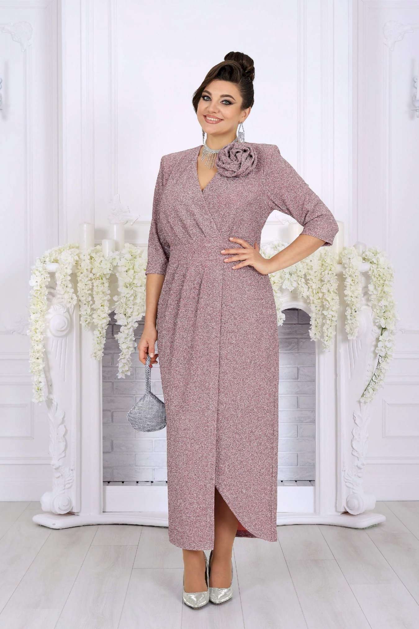 Стильное и эффектное платье для тех, кто хочет блистать на любом празднике. Модель выполнена из эластичного трикотажа с люрексом — ткань красиво переливается и подчёркивает изысканность образа. Удобный крой с акцентом на талию, запах и мягкие складки визуально вытягивают силуэт, а асимметричный низ добавляет динамики. Съемный цветок позволяет менять настроение образа — от сдержанного до яркого и романтичного. Это платье создано для женщин, которые ценят комфорт и красоту в каждом движении. Платье женское полуприлегающего силуэта, выполнено из трикотажного полотна с фактурной лицевой стороной «люрекс». Модель на трикотажной подкладке, с плечевыми накладками. На правой части переда, вдоль отрезного пояса, заложены косые односторонние складки; детали лифа и юбки скреплены на запах. Низ платья асимметричный: правая часть переда -- удлинена к центру и оформлена углом, левая -- скругленная и входит в правый боковой шов. На спинке обработаны талиевые вытачки. В левом боковом шве предусмотрена застежка на потайную тесьму-«молнию» (35 см). Рукав длиной 3/4, втачной. Платье дополнено съемным «цветком» из основного полотна. Длина платья-138 см; длина рукава-41 см.