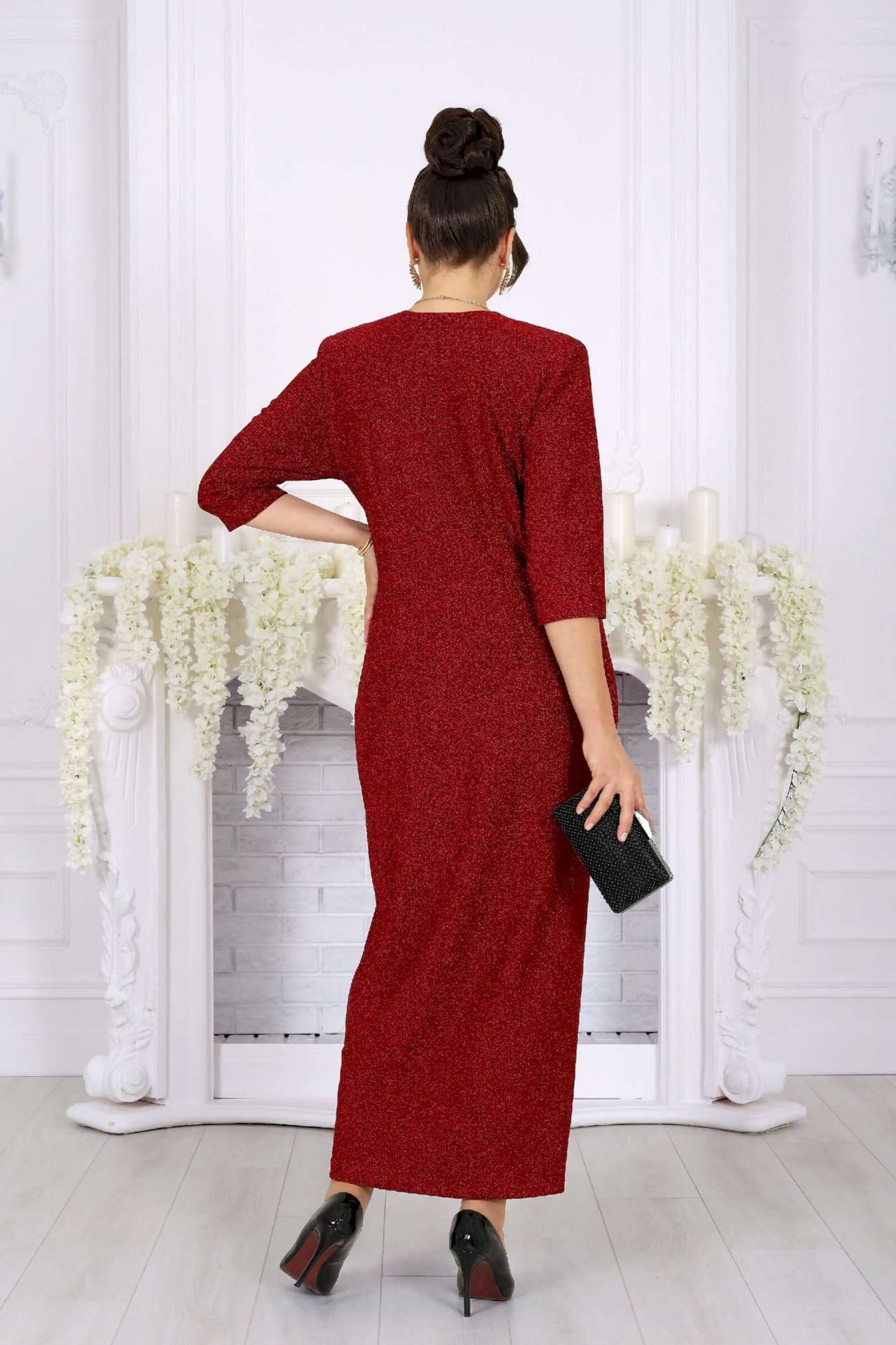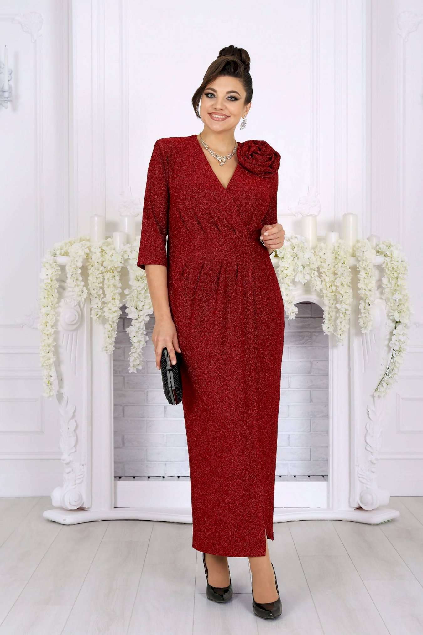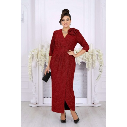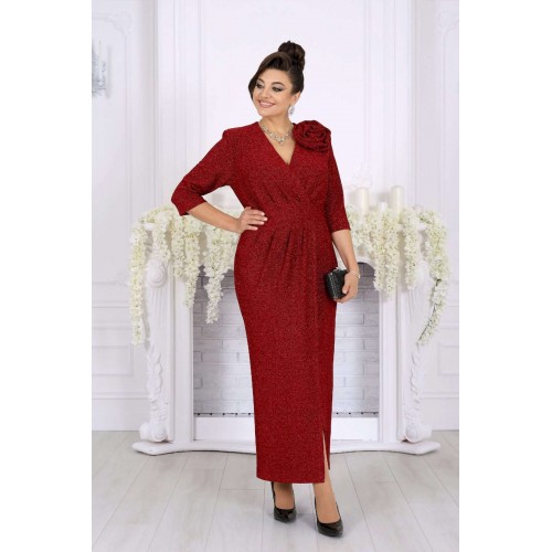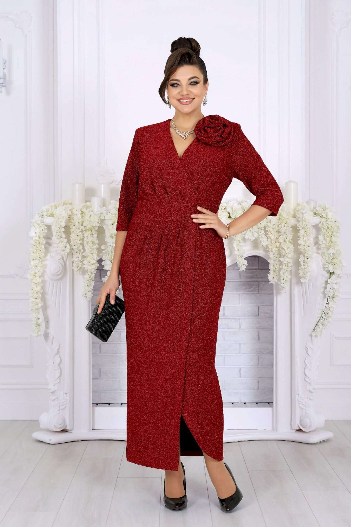 Стильное и эффектное платье для тех, кто хочет блистать на любом празднике. Модель выполнена из эластичного трикотажа с люрексом — ткань красиво переливается и подчёркивает изысканность образа. Удобный крой с акцентом на талию, запах и мягкие складки визуально вытягивают силуэт, а асимметричный низ добавляет динамики. Съемный цветок позволяет менять настроение образа — от сдержанного до яркого и романтичного. Это платье создано для женщин, которые ценят комфорт и красоту в каждом движении. Платье женское полуприлегающего силуэта, выполнено из трикотажного полотна с фактурной лицевой стороной «люрекс». Модель на трикотажной подкладке, с плечевыми накладками. На правой части переда, вдоль отрезного пояса, заложены косые односторонние складки; детали лифа и юбки скреплены на запах. Низ платья асимметричный: правая часть переда -- удлинена к центру и оформлена углом, левая -- скругленная и входит в правый боковой шов. На спинке обработаны талиевые вытачки. В левом боковом шве предусмотрена застежка на потайную тесьму-«молнию» (35 см). Рукав длиной 3/4, втачной. Платье дополнено съемным «цветком» из основного полотна. Длина платья-138 см; длина рукава-41 см.