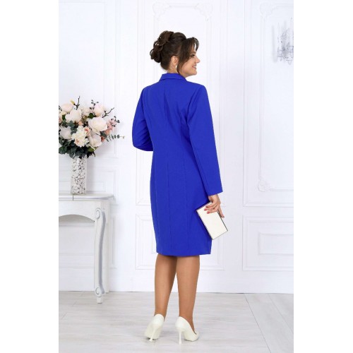 Модель выполнена из качественной костюмной поливискозы и дополнена подкладкой, что обеспечивает комфорт и идеальную посадку. Полуприлегающий силуэт красиво подчеркивает фигуру, а оригинальный асимметричный крой делает образ современным и выразительным. Особое внимание привлекает правая часть переда, стилизованная под двубортный жакет с декоративными пуговицами и аккуратными прорезными карманами с клапаном. Левая часть завершена кокетливым разрезом, добавляющим образу легкой смелости. Длинные втачные рукава и воротник пиджачного типа придают модели сдержанную классику. Такое платье универсально: оно одинаково уместно в офисе, на деловой встрече, романтическом ужине или праздничном вечере. Его легко адаптировать под повседневный образ и под торжественный выход — достаточно подобрать аксессуары. Платье женское, полуприлегающего силуэта, выполнено из костюмной поливискозы. Модель на подкладке, с плечевыми накладками и застежкой в боковом шве на потайную тесьму-«молнию». Перед ассиметричный: правая сторона оформлена в виде двубортного жакета с имитацией застежки на декоративные пуговицы. Спереди обработаны рельефные швы, направленные от пройм и прорезные карманы с клапаном; на левой части переда рельеф заканчивается разрезом. Спинка со средним и рельефными швами, направленным от пройм. Воротник пиджачного типа. Рукав длинный, втачной. Длина платья - 104 см; длина рукава - 61 см.