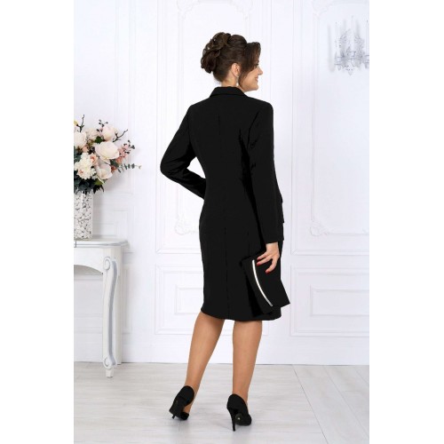 Модель выполнена из качественной костюмной поливискозы и дополнена подкладкой, что обеспечивает комфорт и идеальную посадку. Полуприлегающий силуэт красиво подчеркивает фигуру, а оригинальный асимметричный крой делает образ современным и выразительным. Особое внимание привлекает правая часть переда, стилизованная под двубортный жакет с декоративными пуговицами и аккуратными прорезными карманами с клапаном. Левая часть завершена кокетливым разрезом, добавляющим образу легкой смелости. Длинные втачные рукава и воротник пиджачного типа придают модели сдержанную классику. Такое платье универсально: оно одинаково уместно в офисе, на деловой встрече, романтическом ужине или праздничном вечере. Его легко адаптировать под повседневный образ и под торжественный выход — достаточно подобрать аксессуары. Платье женское, полуприлегающего силуэта, выполнено из костюмной поливискозы. Модель на подкладке, с плечевыми накладками и застежкой в боковом шве на потайную тесьму-«молнию». Перед ассиметричный: правая сторона оформлена в виде двубортного жакета с имитацией застежки на декоративные пуговицы. Спереди обработаны рельефные швы, направленные от пройм и прорезные карманы с клапаном; на левой части переда рельеф заканчивается разрезом. Спинка со средним и рельефными швами, направленным от пройм. Воротник пиджачного типа. Рукав длинный, втачной. Длина платья - 104 см; длина рукава - 61 см.