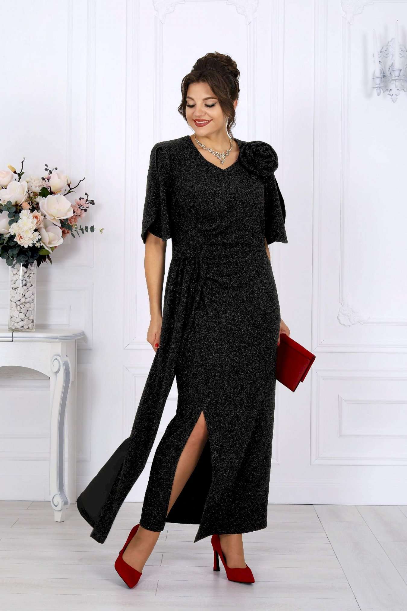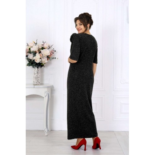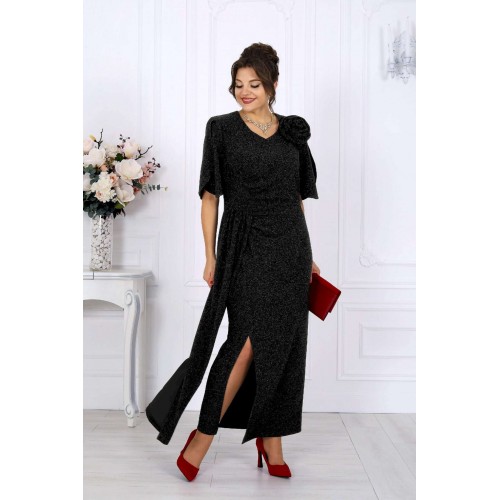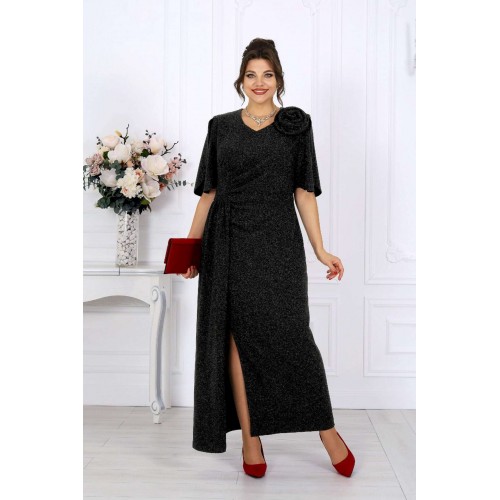 Платье, которое само по себе становится событием. Роскошное вечернее платье из мерцающего трикотажа с нитью люрекс создано, чтобы подчеркнуть женственность и элегантность в каждом движении. Оно притягивает взгляд, играя бликами при любом освещении — будь то мягкий свет ресторанных ламп или огни праздничного зала. Это тот редкий случай, когда комфорт и эффектность соединяются в идеальном балансе: платье выглядит торжественно, но остаётся удобным даже во время самого долгого вечера. Главный акцент — отлетная деталь из того же мерцающего полотна. Она добавляет образу утончённую театральность. Съемный цвет выполнен в тон платья, его можно расположить на плече, в зоне декольте или у талии — в зависимости от настроения и события. Платье идеально садится по фигуре, подчёркивая достоинства женщин с роскошными формами. Эта модель — воплощение торжественности и женственности. Она будет уместна на свадьбе, юбилее, выпускном, театральной премьере или корпоративном вечере. Стоит лишь надеть туфли на каблуке и добавить каплю любимого парфюма — и вы уже героиня праздника, к которой прикованы все взгляды. Платье женское полуприлегающего силуэта, выполнено из трикотажного полотна с фактурной лицевой стороной «люрекс». Модель на трикотажной подкладке, с плечевыми накладками. В левом боковом шве обработана застежка на потайную тесьму-«молнию» (35 см). Перед платья с горизонтальным подрезом по линии талии и отлетной деталью в шве подреза. В правой части переда обработан рельеф с разрезом в нижней части. Вдоль рельефного шва заложены односторонние складки, направленные к центру переда. Спинка с талиевыми вытачками. Горловина спинки округлая, по переду V-образная, углубленная. Рукав короткий, втачной, формы «крылышко на запах», со скругленными краями. Платье дополнено съемным «цветком» из основного полотна. Длина платья - 136 см; длина рукава - 31 см.