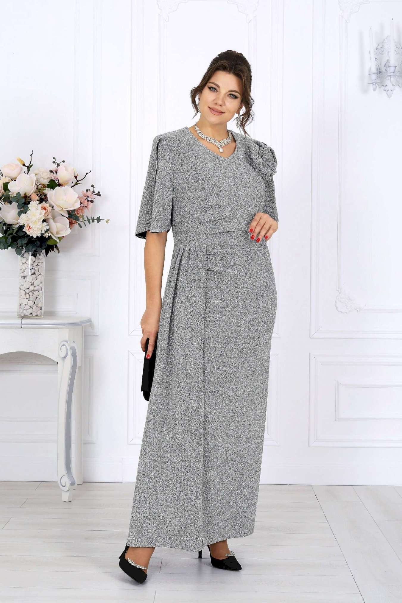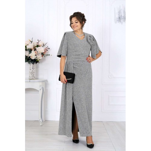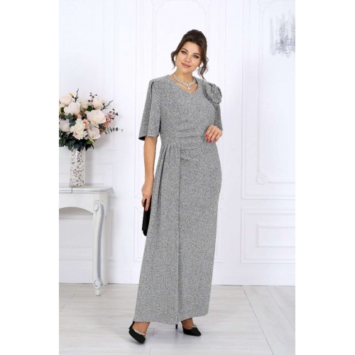 Платье, которое само по себе становится событием. Роскошное вечернее платье из мерцающего трикотажа с нитью люрекс создано, чтобы подчеркнуть женственность и элегантность в каждом движении. Оно притягивает взгляд, играя бликами при любом освещении — будь то мягкий свет ресторанных ламп или огни праздничного зала. Это тот редкий случай, когда комфорт и эффектность соединяются в идеальном балансе: платье выглядит торжественно, но остаётся удобным даже во время самого долгого вечера. Главный акцент — отлетная деталь из того же мерцающего полотна. Она добавляет образу утончённую театральность. Съемный цвет выполнен в тон платья, его можно расположить на плече, в зоне декольте или у талии — в зависимости от настроения и события. Платье идеально садится по фигуре, подчёркивая достоинства женщин с роскошными формами. Эта модель — воплощение торжественности и женственности. Она будет уместна на свадьбе, юбилее, выпускном, театральной премьере или корпоративном вечере. Стоит лишь надеть туфли на каблуке и добавить каплю любимого парфюма — и вы уже героиня праздника, к которой прикованы все взгляды. Платье женское полуприлегающего силуэта, выполнено из трикотажного полотна с фактурной лицевой стороной «люрекс». Модель на трикотажной подкладке, с плечевыми накладками. В левом боковом шве обработана застежка на потайную тесьму-«молнию» (35 см). Перед платья с горизонтальным подрезом по линии талии и отлетной деталью в шве подреза. В правой части переда обработан рельеф с разрезом в нижней части. Вдоль рельефного шва заложены односторонние складки, направленные к центру переда. Спинка с талиевыми вытачками. Горловина спинки округлая, по переду V-образная, углубленная. Рукав короткий, втачной, формы «крылышко на запах», со скругленными краями. Платье дополнено съемным «цветком» из основного полотна. Длина платья - 136 см; длина рукава - 31 см.
