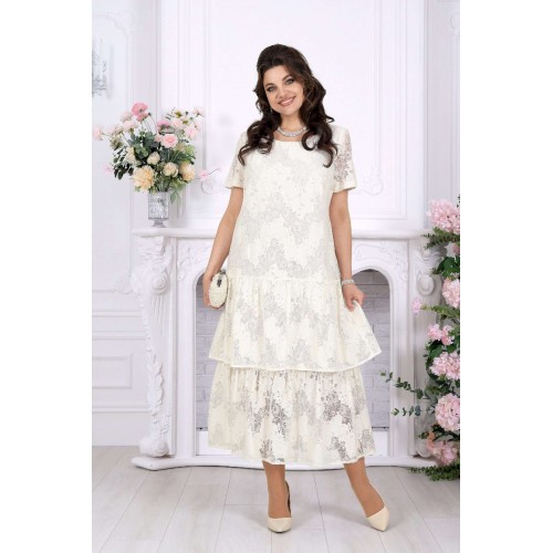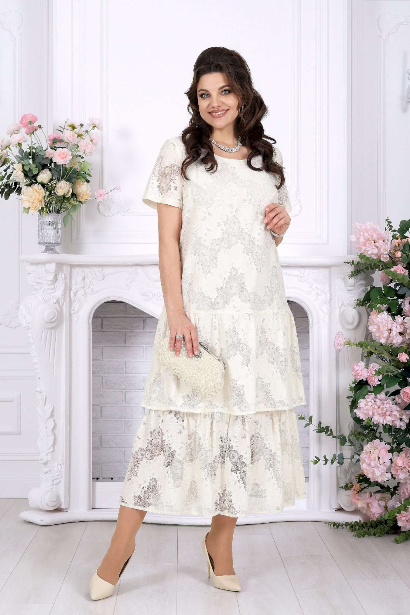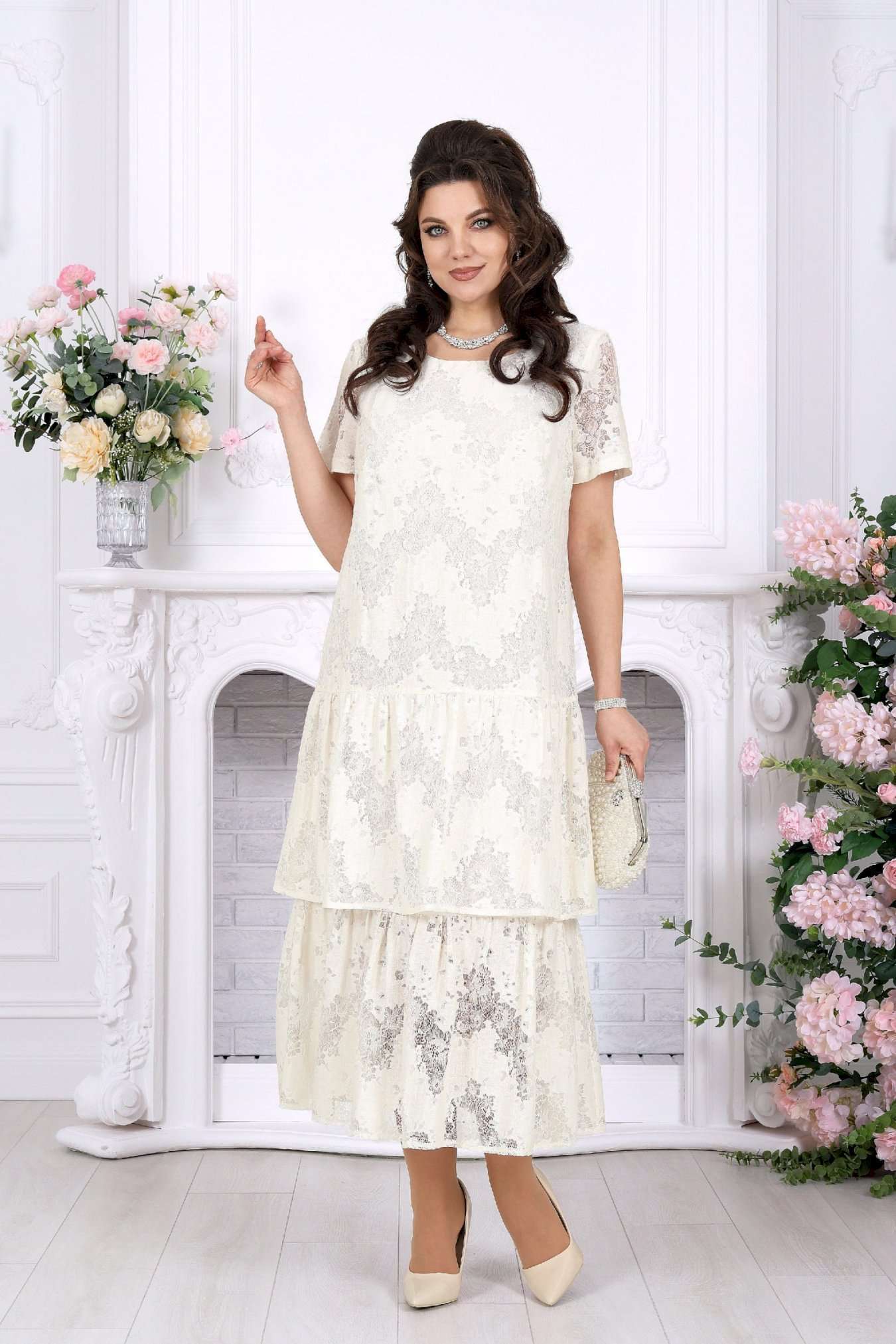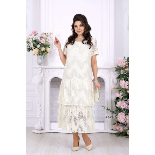 Лёгкость кружева, мягкое движение ткани и ощущение праздника в каждом шаге - платье, в котором хочется быть особенной. Праздничное платье из кружевного хлопкового гипюра создаёт изысканный и одновременно очень женственный образ. Оно выглядит нарядно и утончённо, но при этом остаётся удивительно удобным — идеальный баланс для тех случаев, когда хочется блистать и чувствовать себя свободно. Модель подчеркивает статус, вкус и уверенность, делая образ гармоничным и запоминающимся. Свободный А-силуэт мягко ложится по фигуре, деликатно скрывая нюансы и создавая красивую линию силуэта. Двухъярусные воланы добавляют образу динамики и лёгкости, а кружевная фактура придаёт глубину и благородство. Короткий рукав делает платье комфортным для тёплого сезона, а натуральная хлопковая подкладка обеспечивает приятные ощущения в течение всего дня. Такое платье идеально подойдёт для торжественных событий: юбилея, свадьбы, корпоратива или вечернего выхода. Оно легко адаптируется и для более спокойных случаев — стоит лишь сменить аксессуары. Отдельное внимание заслуживает качество исполнения: аккуратный крой, продуманные детали и белорусское производство, которое славится посадкой на фигуру, в том числе для женщин с формами. Это платье — про уверенность, комфорт и тот самый нарядный эффект, который не требует лишних усилий. Ключевые особенности: - праздничное и вечернее настроение - кружевное полотно из натурального хлопка - нарядный, но комфортный крой - универсально: от торжества до особого повода - большие размеры, идеально для полных - лёгкое, дышащее, летнее и весеннее - белорусское качество и продуманная посадка Платье женское, свободного кроя А силуэта, выполнено из хлопкового гипюра. Модель на хлопчатобумажной подкладке, с коротким рукавом, без плечевых накладок. По переду обработаны вытачки, направленные от пройм. Платье отрезное по линии бёдер с притачным, присборенным воланом. Второй волан присборен и пришит к низу подкладки. Вырез горловины спинки округлый, по переду – углубленный округлый. Длина платья –125 см; длина рукава-22 см.