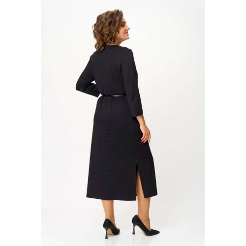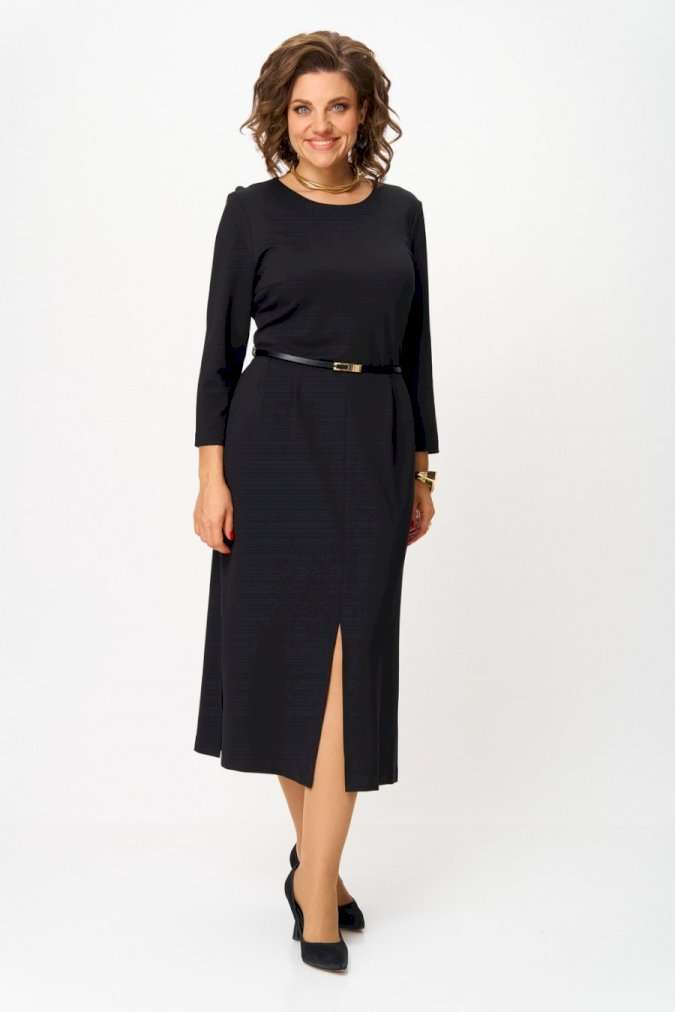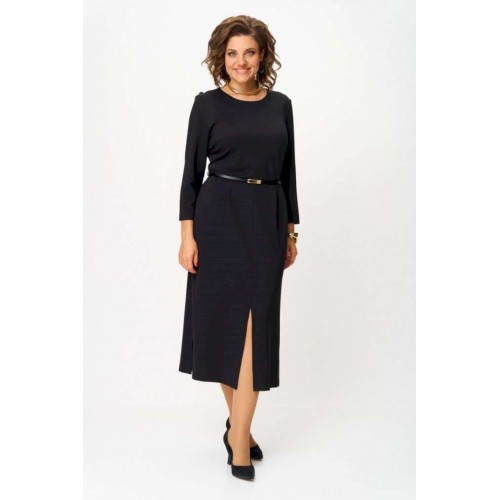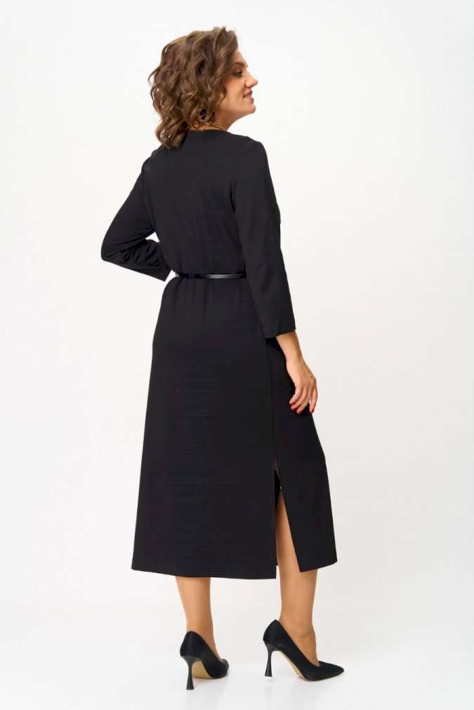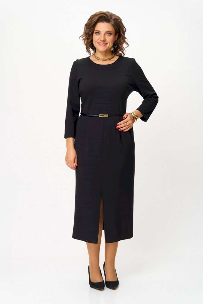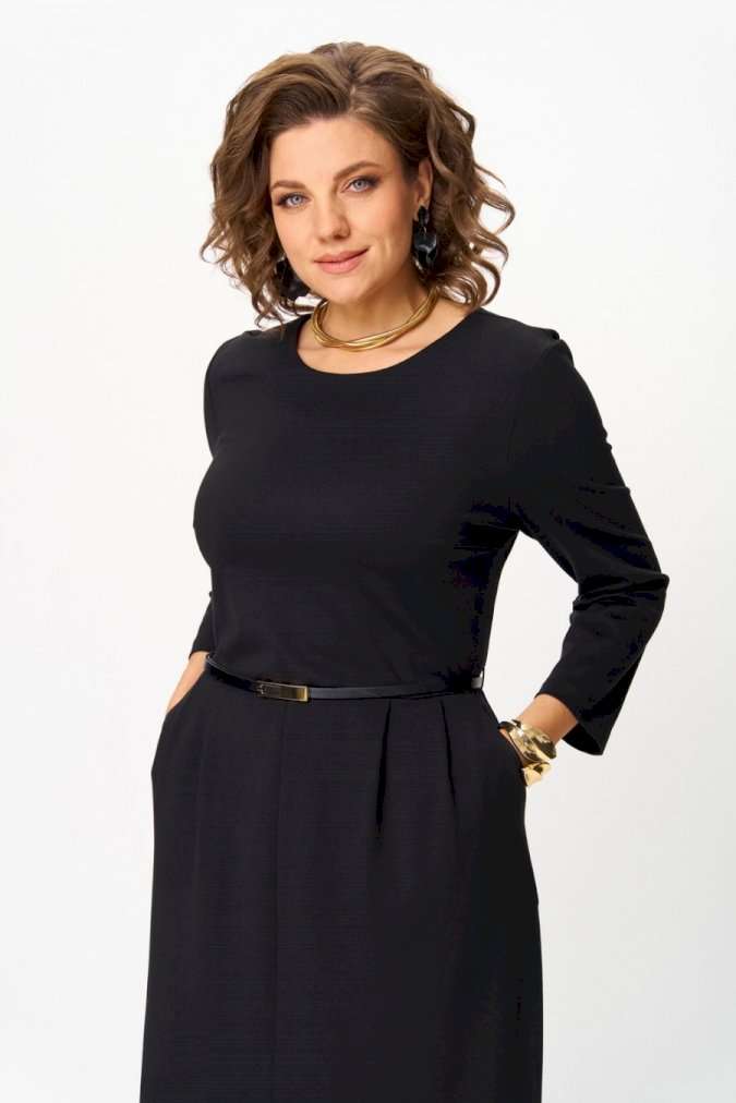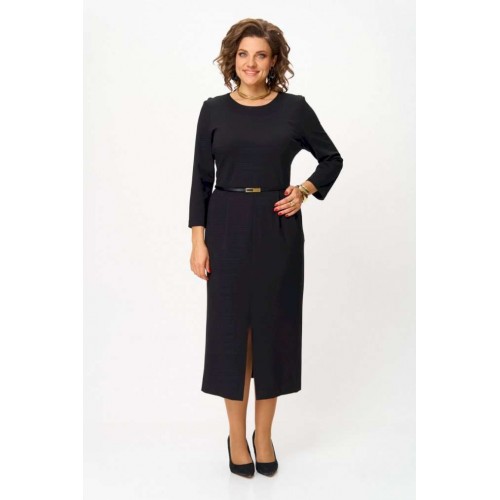 Платье женское полуприлегающего силуэта с втачным рукавом. Перед платья с горизонтальным эластичным швом по талии. Верхняя часть с вытачками по линии груди, нижняя часть со складками в области талии и карманами что обеспечивает прекрасную посадку и подчеркивает фигуру. Рукав длиной 7/8. Высокие разрезы по бокам и переду платья добавляют удобства. В комплекте съемный ремень. Фурнитура может меняться от наличия. Длина платья по спинке: 123 см Длина рукава: 50 см