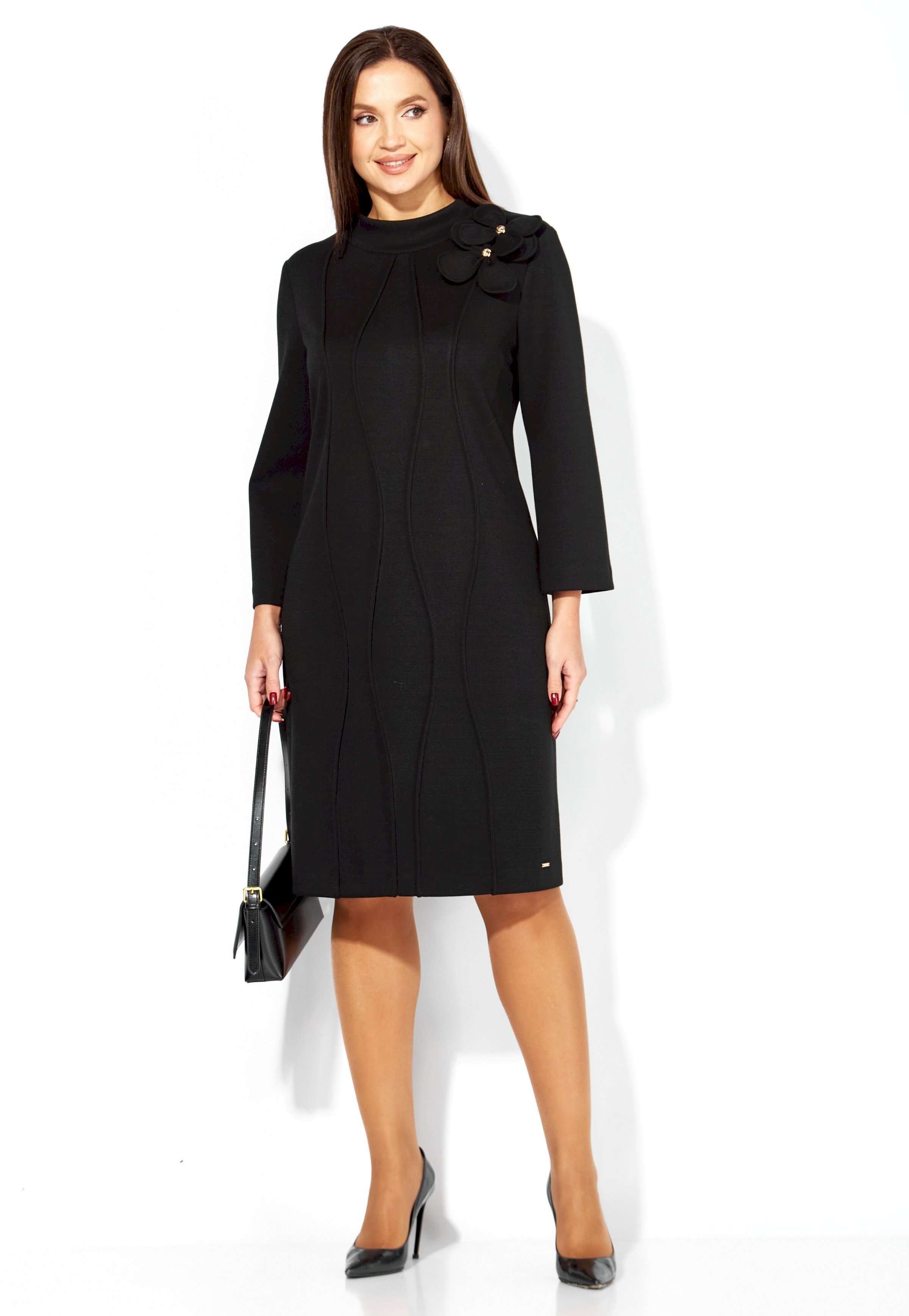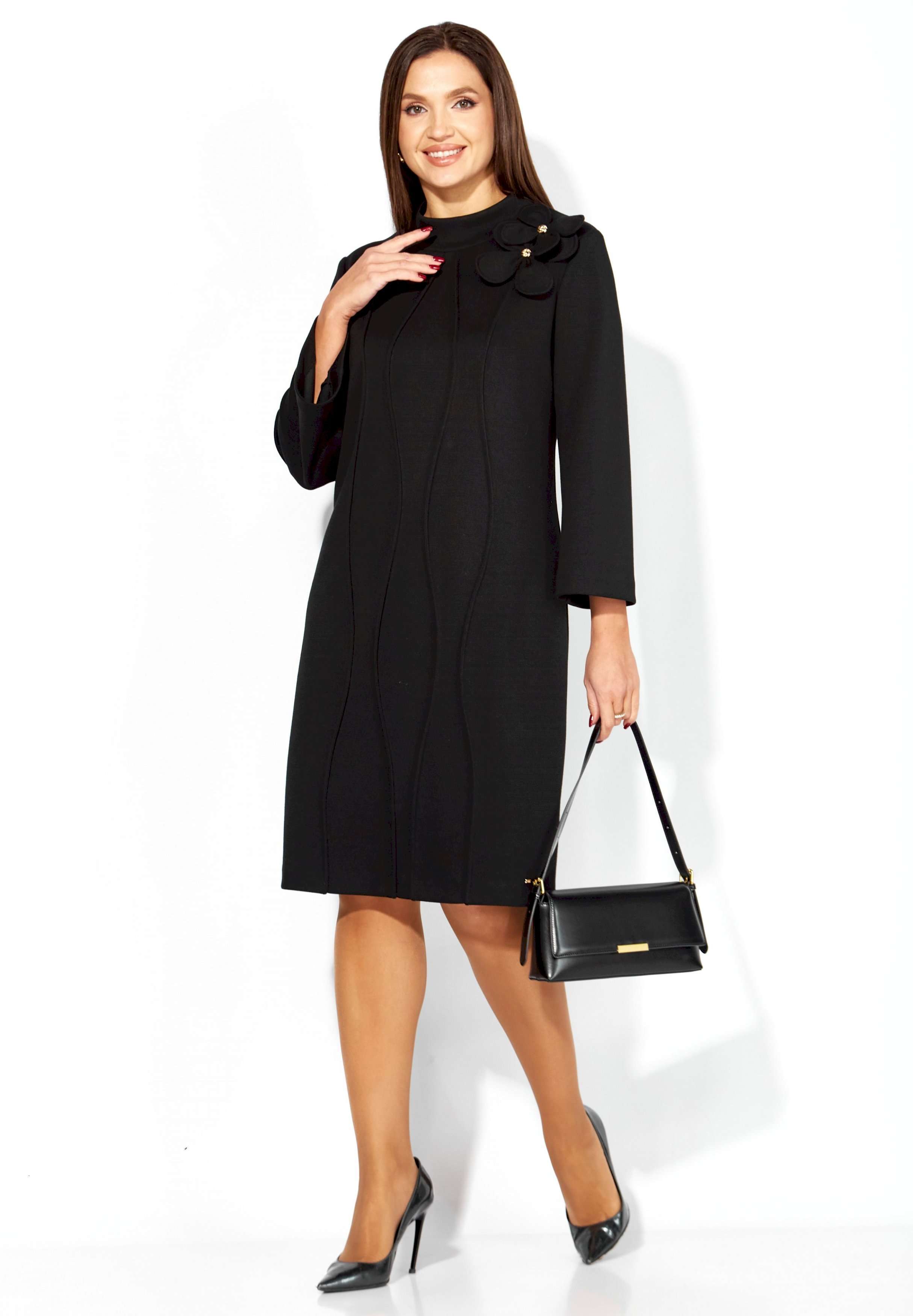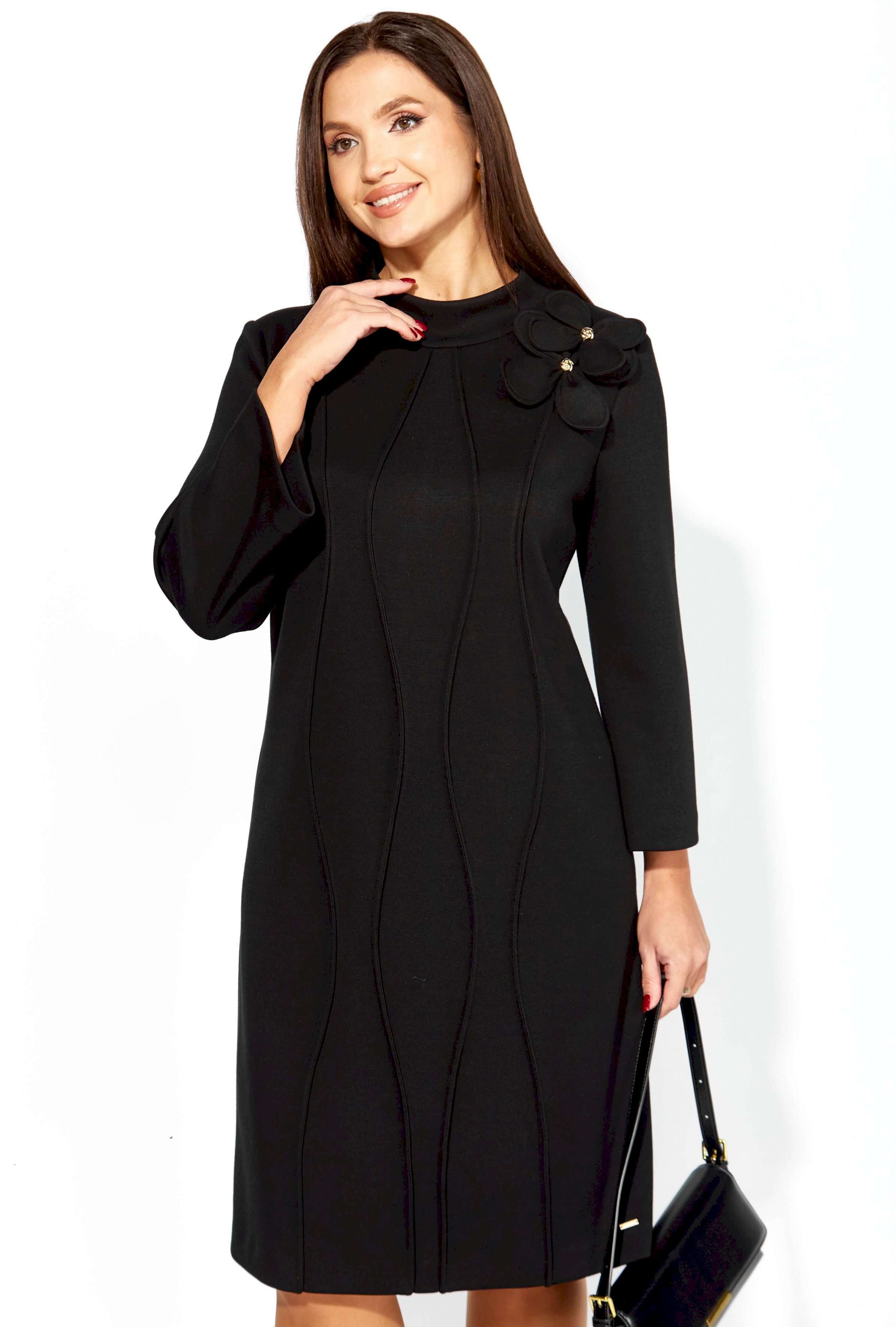 Платье женское, чуть А-силуэта, с втачным рукавом, длинной 7/8. По центу переда объемные , фигурные рельефы. Горловина оформлена небольшой мягкой стойкой. Декором служат съемные цветки-броши. По низу платья отделочная нашивка. Спинка со средним швом. Платье изготовлено из трикотажного полотна "тенсел".