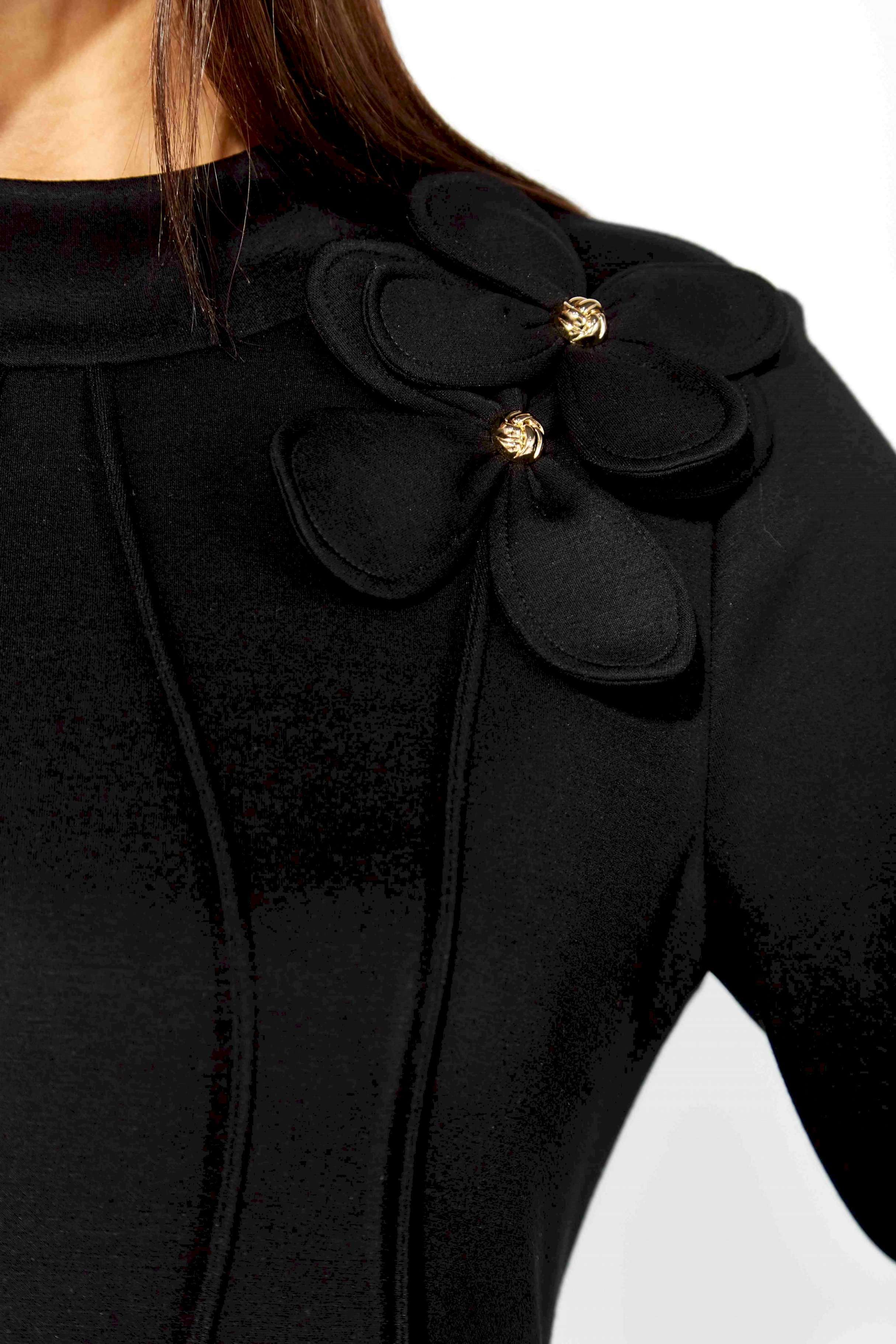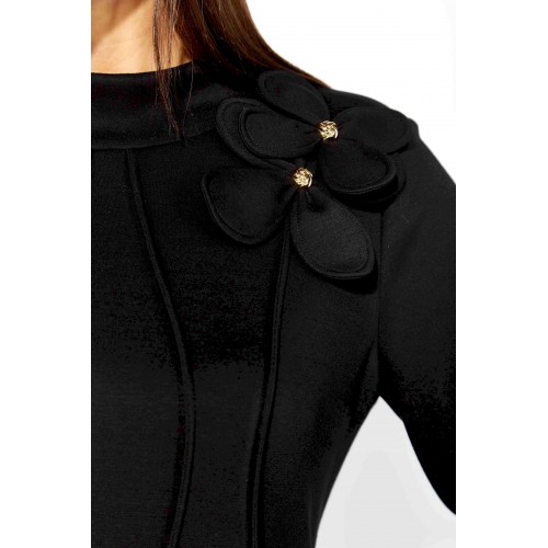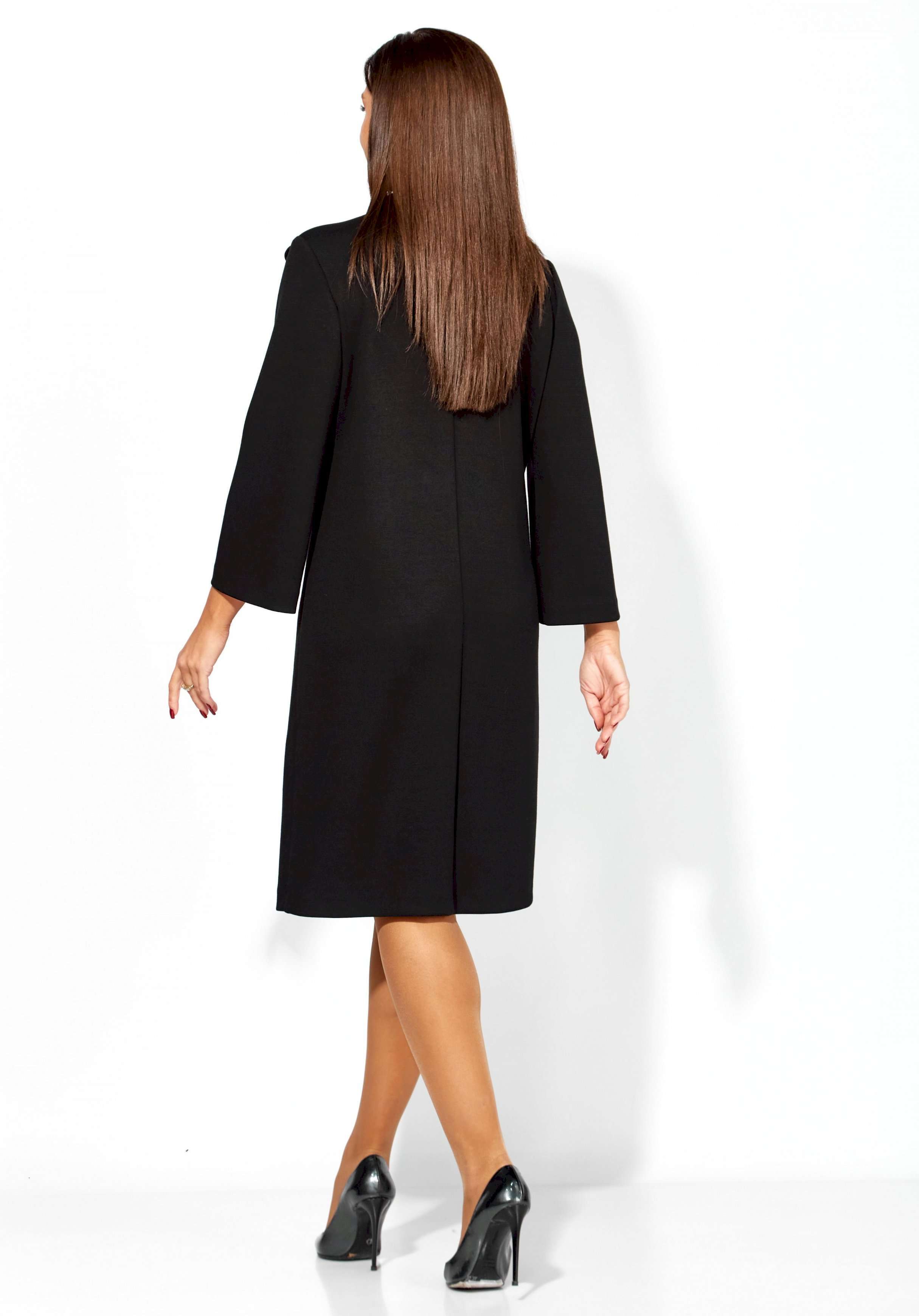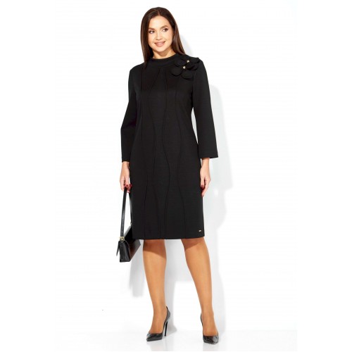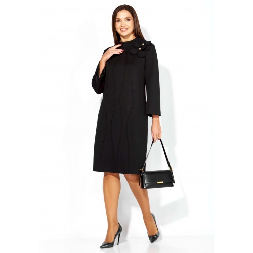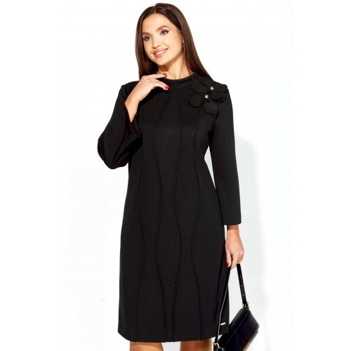 Платье женское, чуть А-силуэта, с втачным рукавом, длинной 7/8. По центу переда объемные , фигурные рельефы. Горловина оформлена небольшой мягкой стойкой. Декором служат съемные цветки-броши. По низу платья отделочная нашивка. Спинка со средним швом. Платье изготовлено из трикотажного полотна "тенсел".