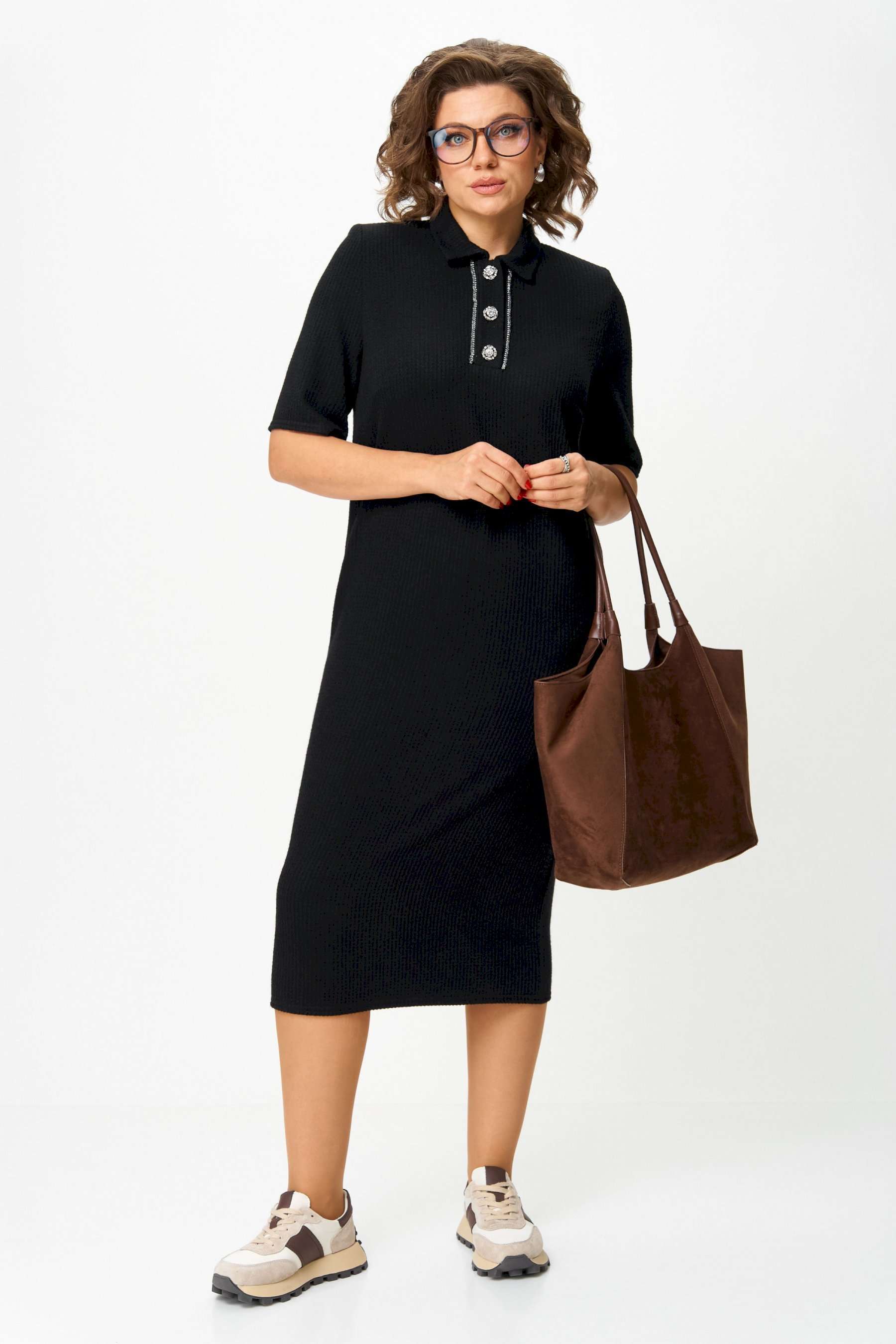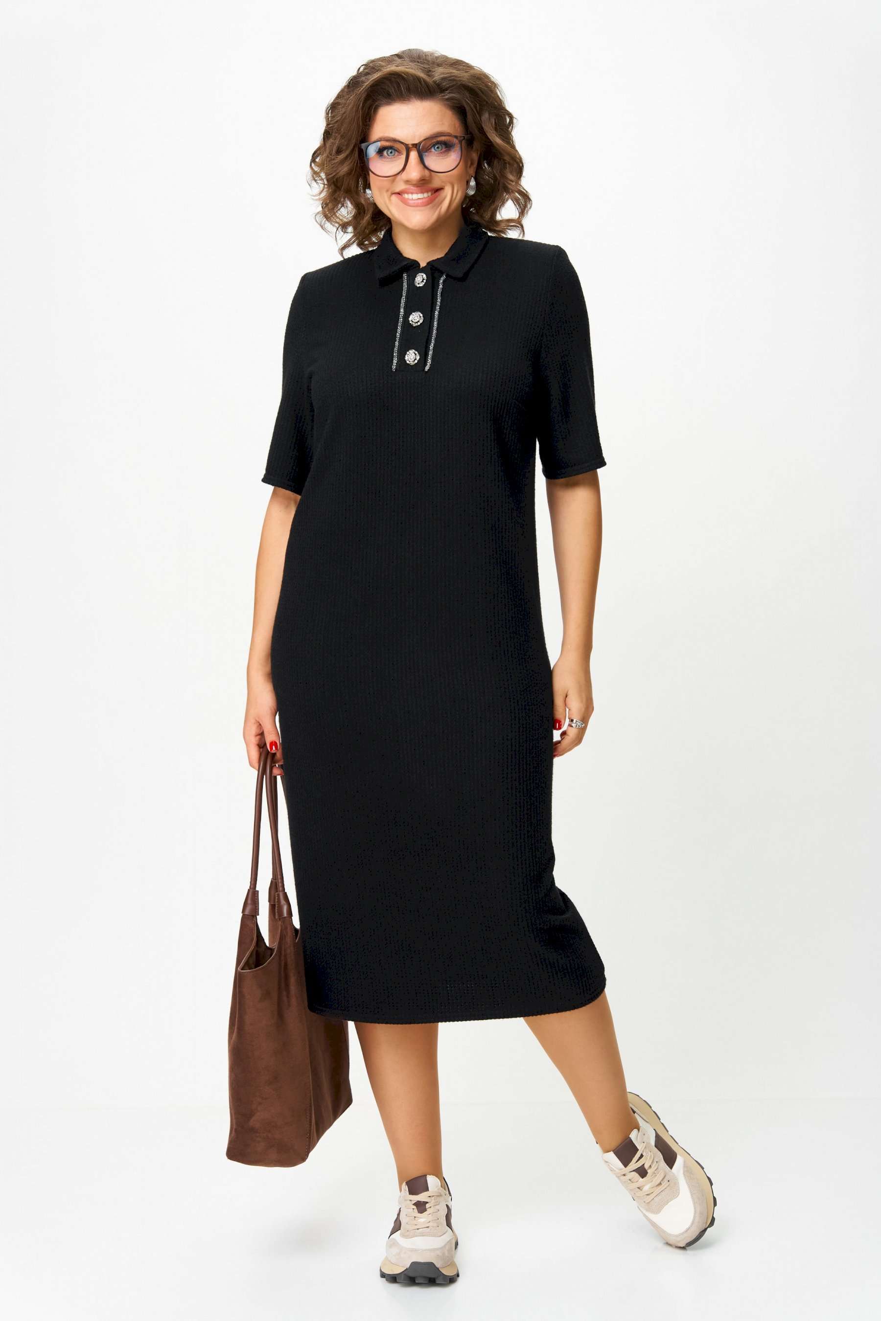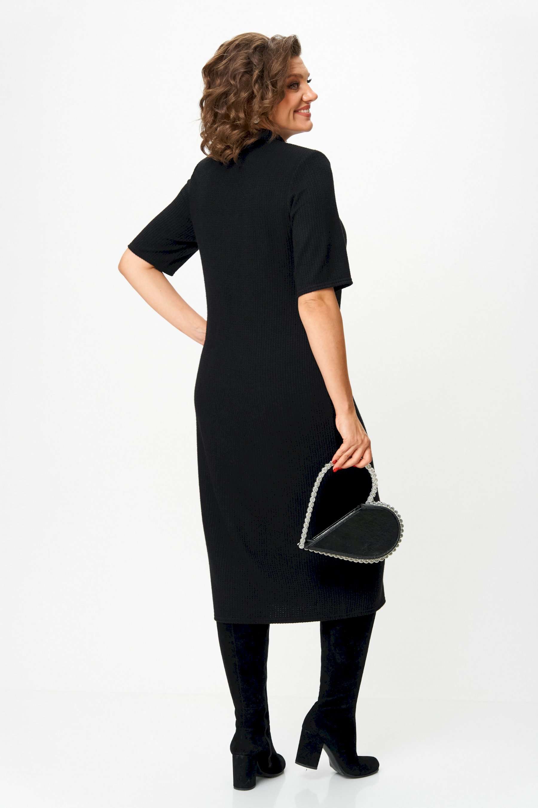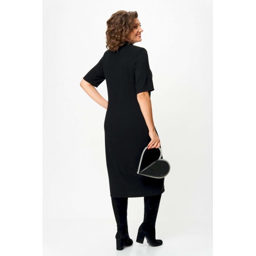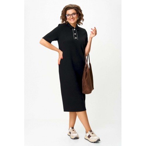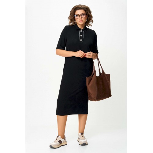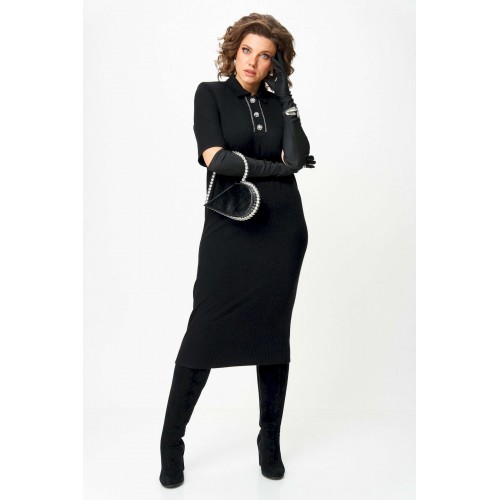 Платье женское полуприлегающего силуэта, зауженное к низу, длиной до середины голени. Перед с нагрудной вытачкой, выходящей из бокового шва, с планкой с отделочной лентой и кантом на 3 петли-пуговицы. Воротник отложной. Спинка цельная. Рукав втачной одношовный длиной до локтя.