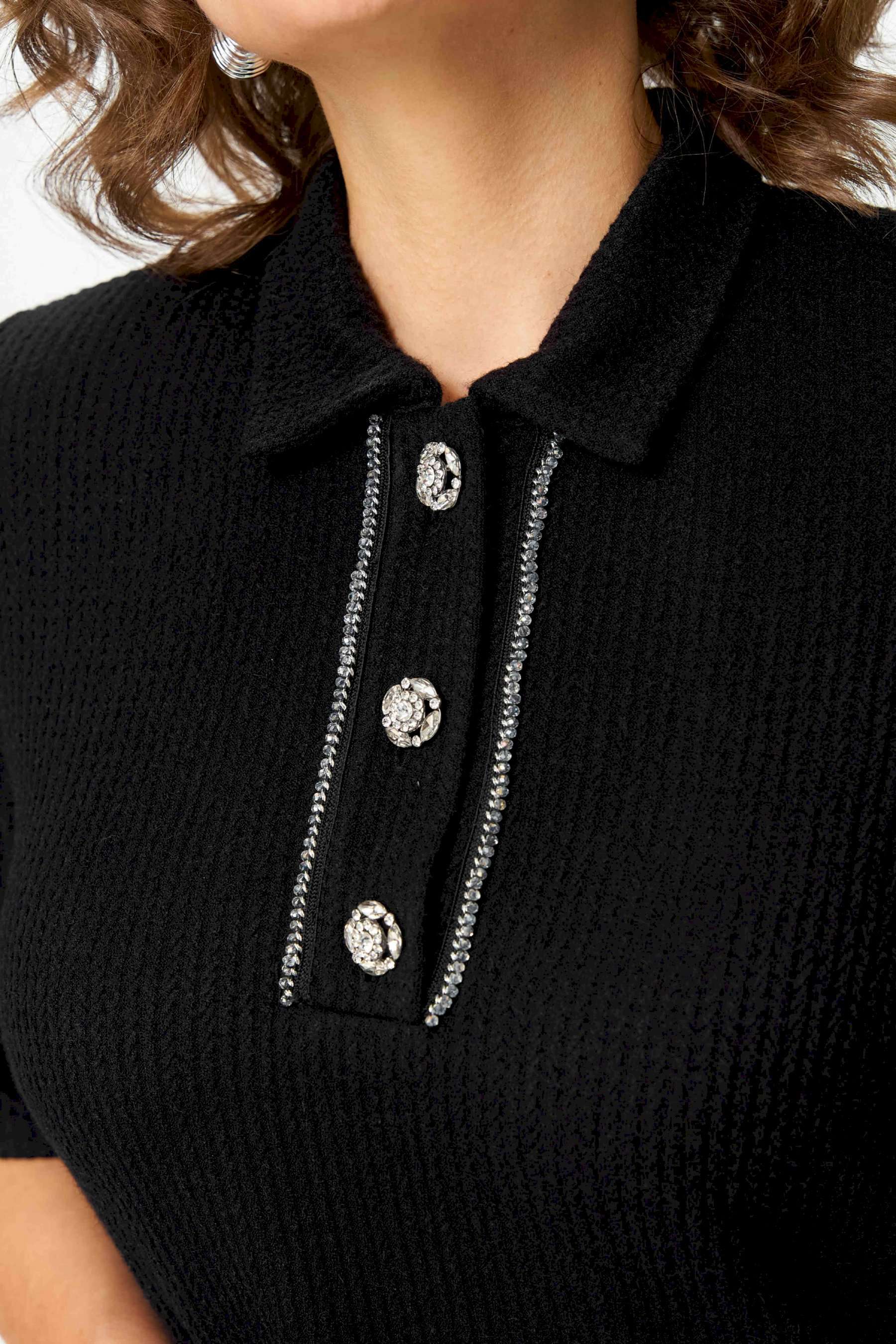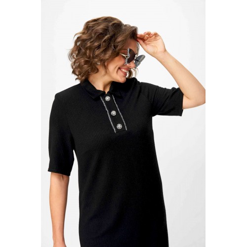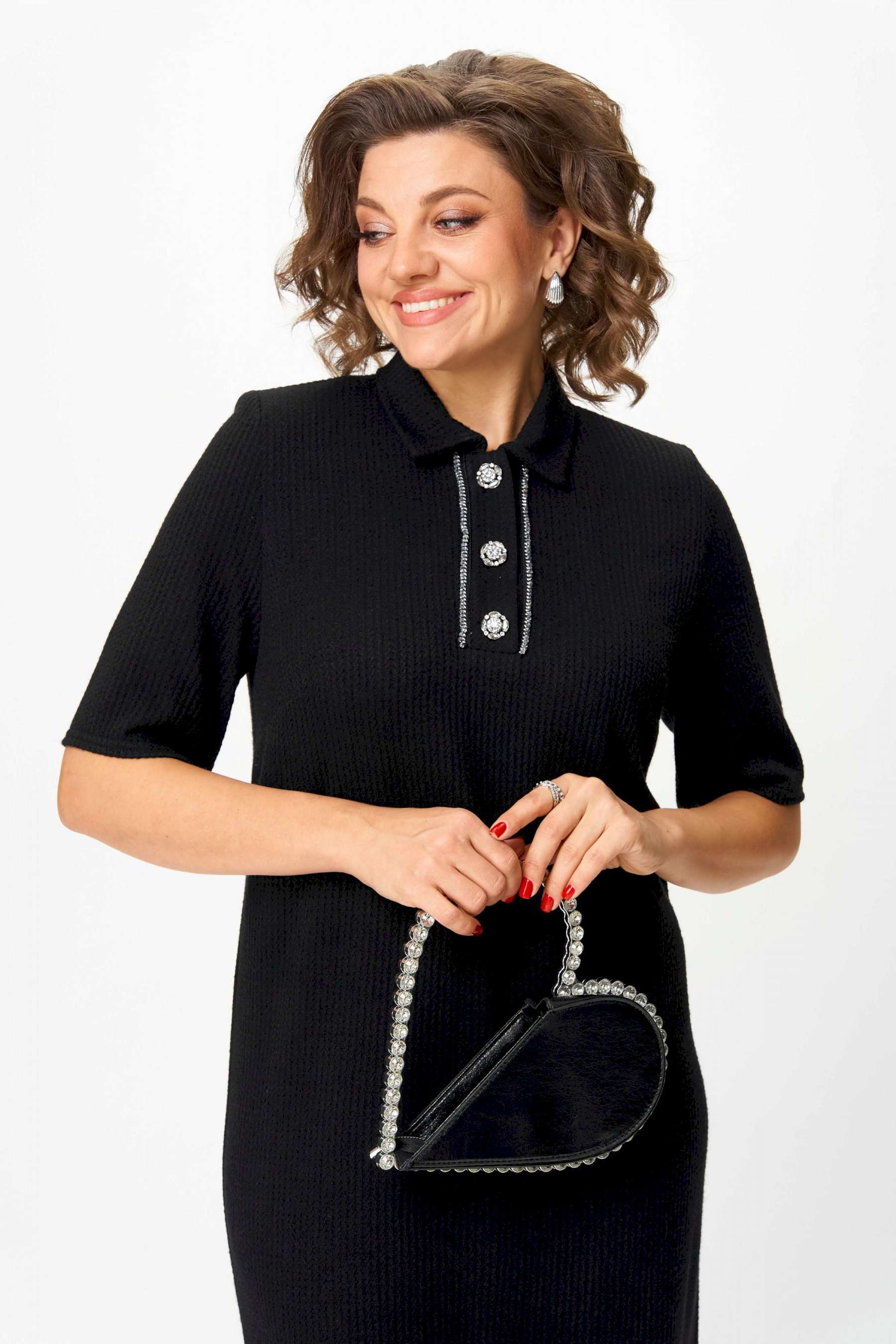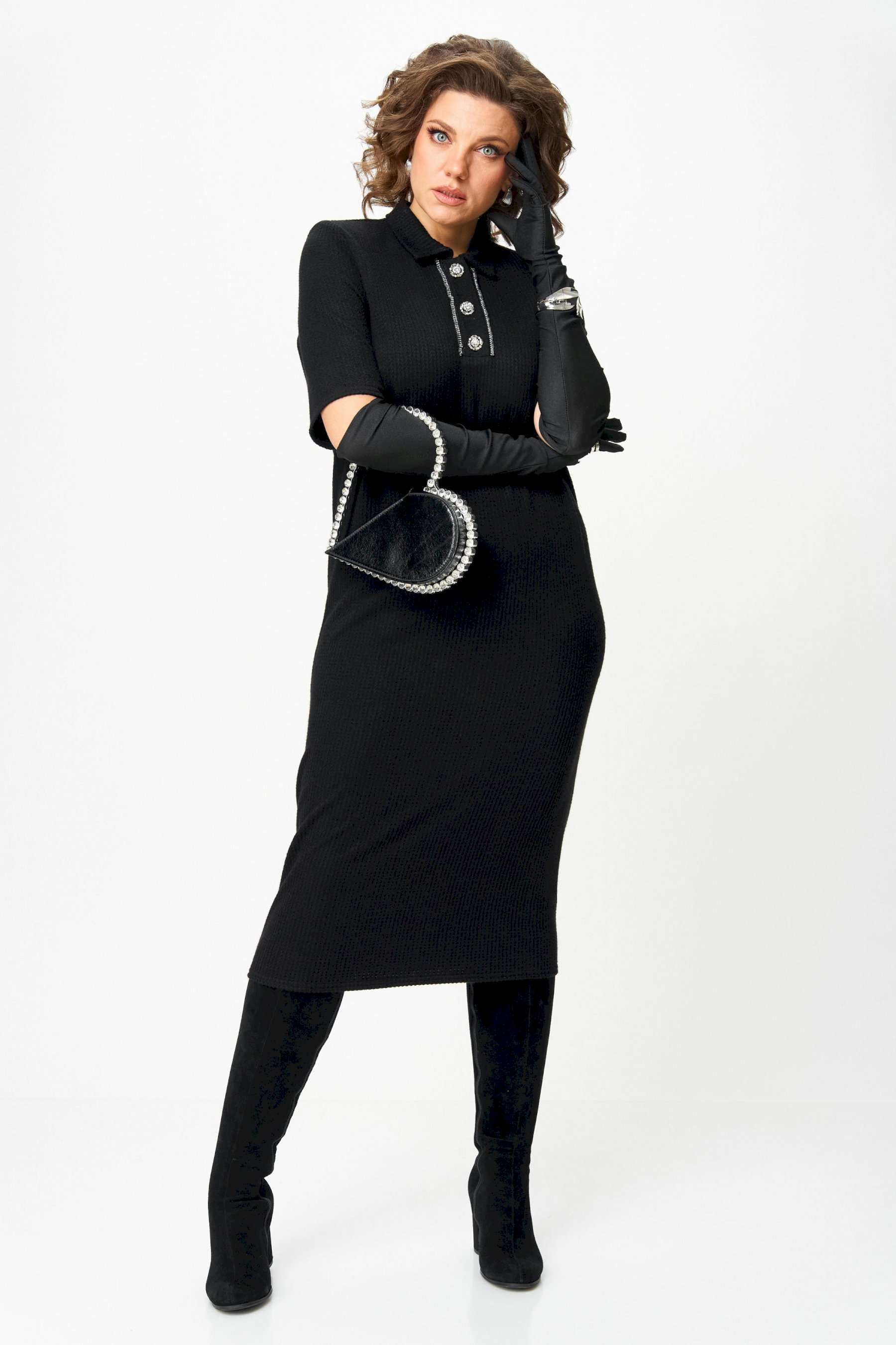 Платье женское полуприлегающего силуэта, зауженное к низу, длиной до середины голени. Перед с нагрудной вытачкой, выходящей из бокового шва, с планкой с отделочной лентой и кантом на 3 петли-пуговицы. Воротник отложной. Спинка цельная. Рукав втачной одношовный длиной до локтя.
