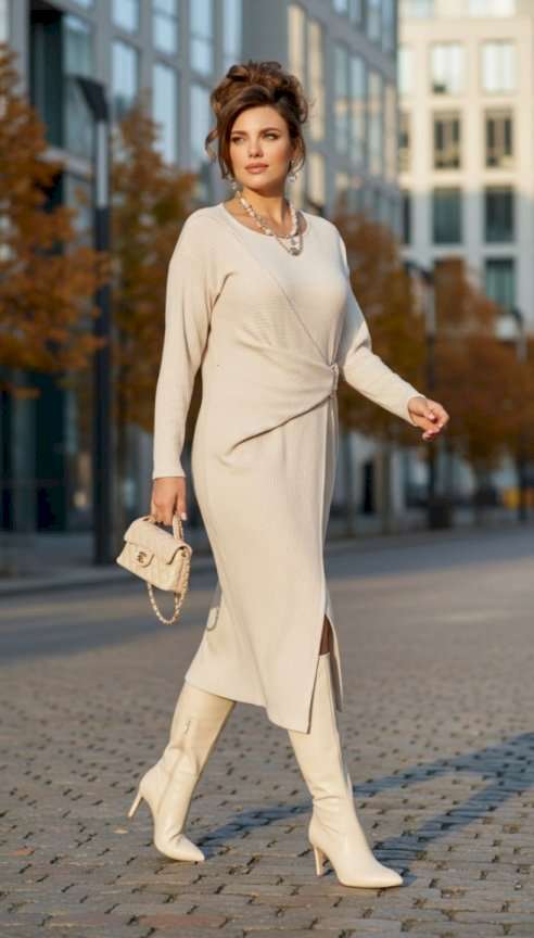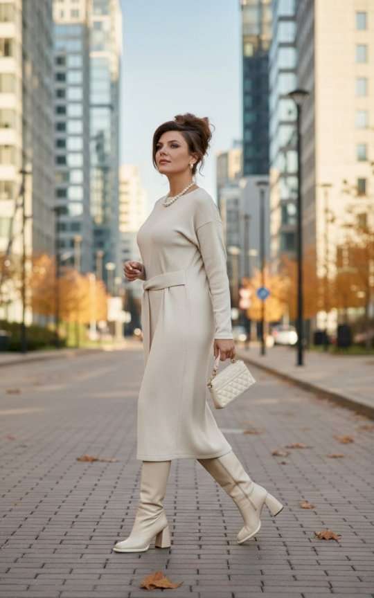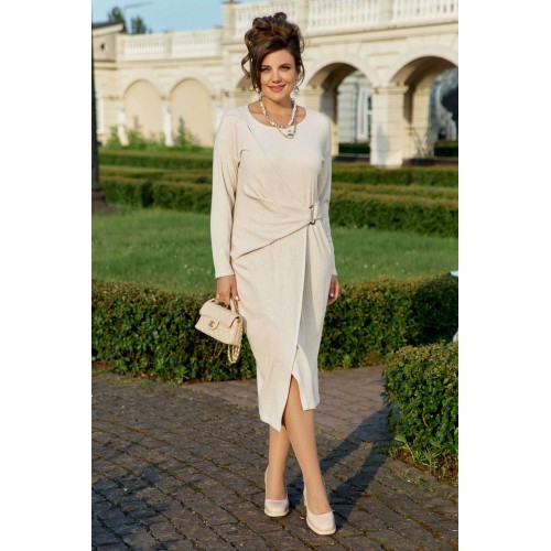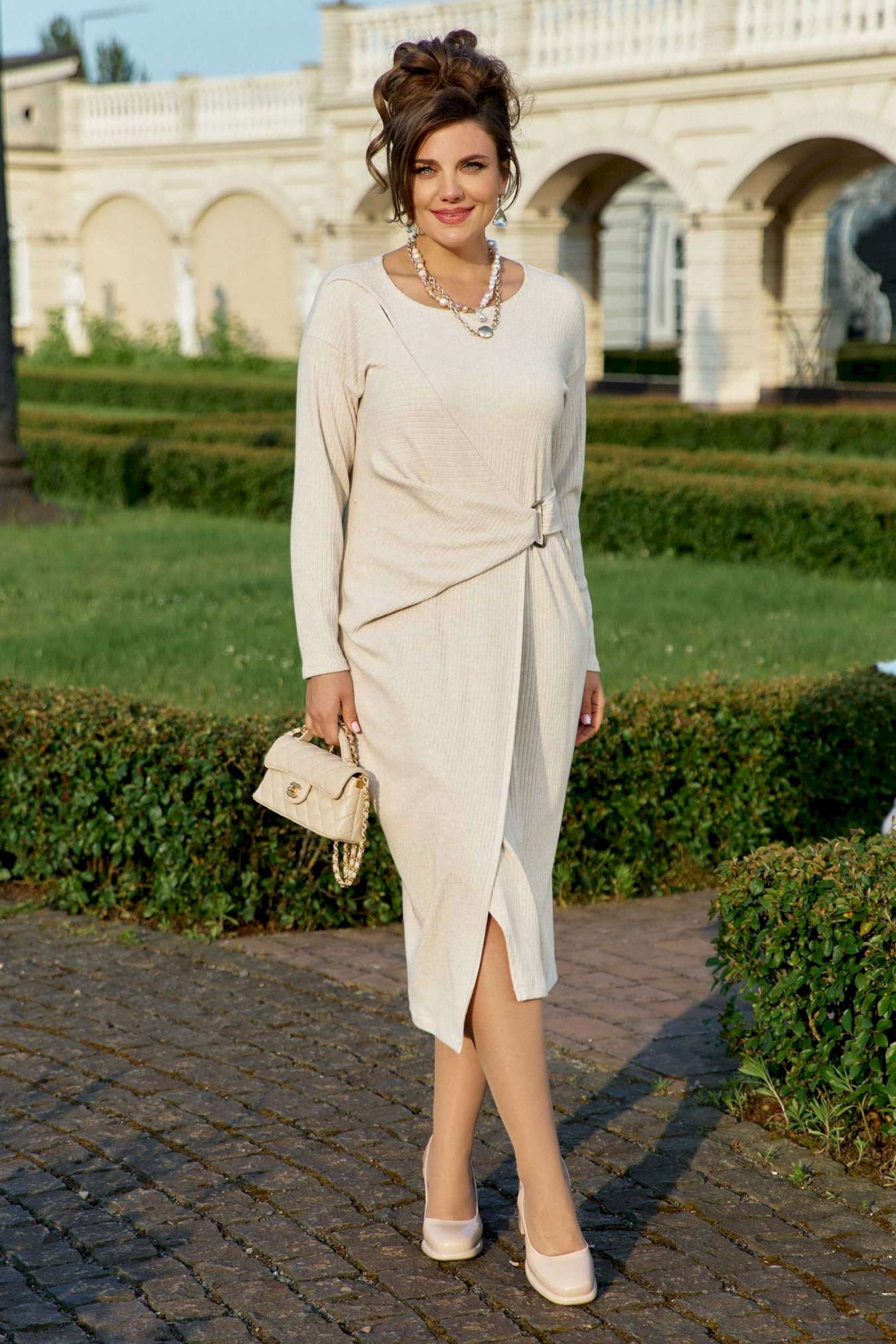 Платье выполнено из плотного трикотажа в рубчик, или так называемой \"лапши\", это платье обеспечивает идеальную посадку по фигуре, деликатно подчеркивая ее изгибы. Платье полуприлегающего силуэта с округлой формой горловины. Особенностью платья является имитация запаха спереди с неглубоким фигурным вырезом у плеча, создающая асимметричную линию подола и добавляющая динамичности образу. Линия плеча в платье спущенная, рукав втачной, длинный. Спинка в платье без особенностей. Длинные рукава и миди-длина обеспечивают тепло и уют, сохраняя при этом изящность силуэта. Длина платья 116 см, длина рукава 51 см (р.50-54), 48,5 см (р.56-60).