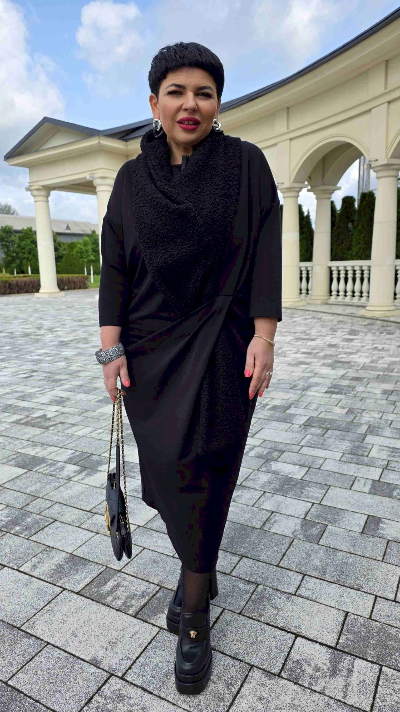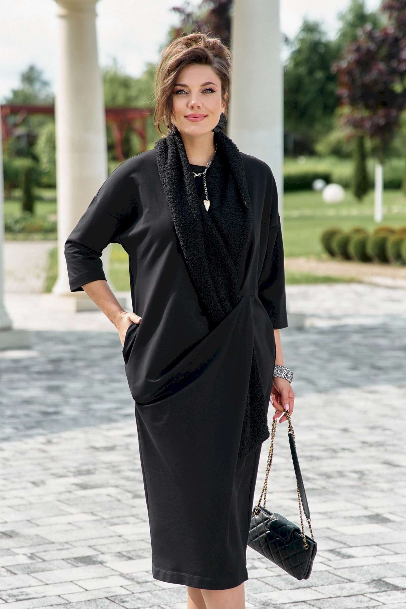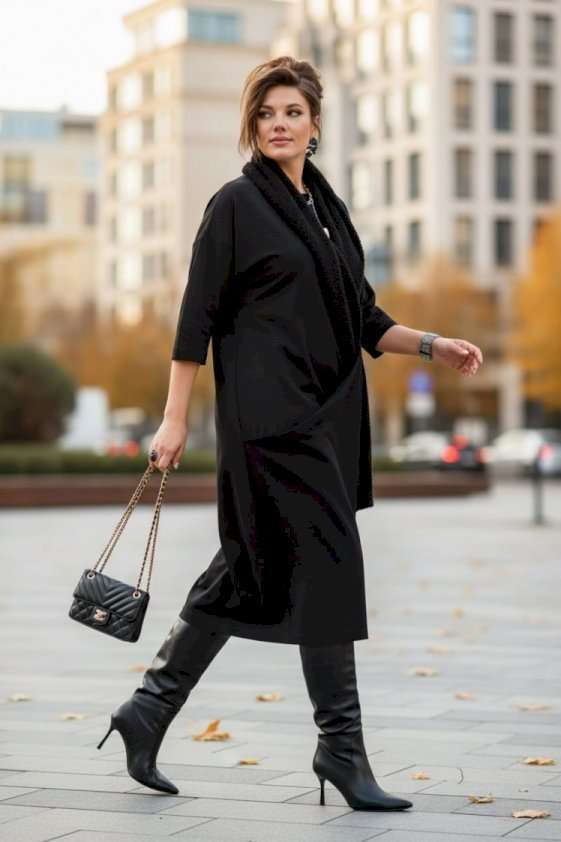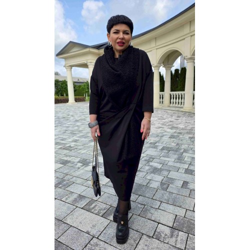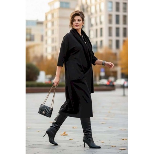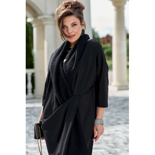 Если Вы ищете идеальное сочетание стиля и комфорта, вот идеальный выбор. Мы специально подобрали качественную и тактильно приятную ткань, которая хорошо держит свою форму, создавая ощущение легкости и свободы движения. Платье свободного силуэта, слегка заужается к низу, с округлой формой горловины, линия плеча спущенная. Главная интрига кроется в декоративной складке в подрезе по переду. Это тщательно продуманный декоративный элемент. Эта складка — свидетельство высокого искусства кройки; она добавляет глубину и динамику лаконичному фасону, создавая иллюзию движения даже в неподвижности. Спинка в платье со средним швом. Рукав в платье втачной, длиной 7/8. Но кульминацией образа становится отдельный декоративный элемент. Шарф, идущий в комплекте, драпируется на шее, являясь частью наряда. Он создаёт завершающий образ.Вместе с платьем они создают диалог текстуры и формы, тем самым завершая образ. Гладкое, платье служит идеальным холстом для струящейся драпировки шарфа. Длина платья 116 см (р.52-56), 117 см (р.58-62), длина рукава 31 см (р.52-56), 30 см (р.58-62).