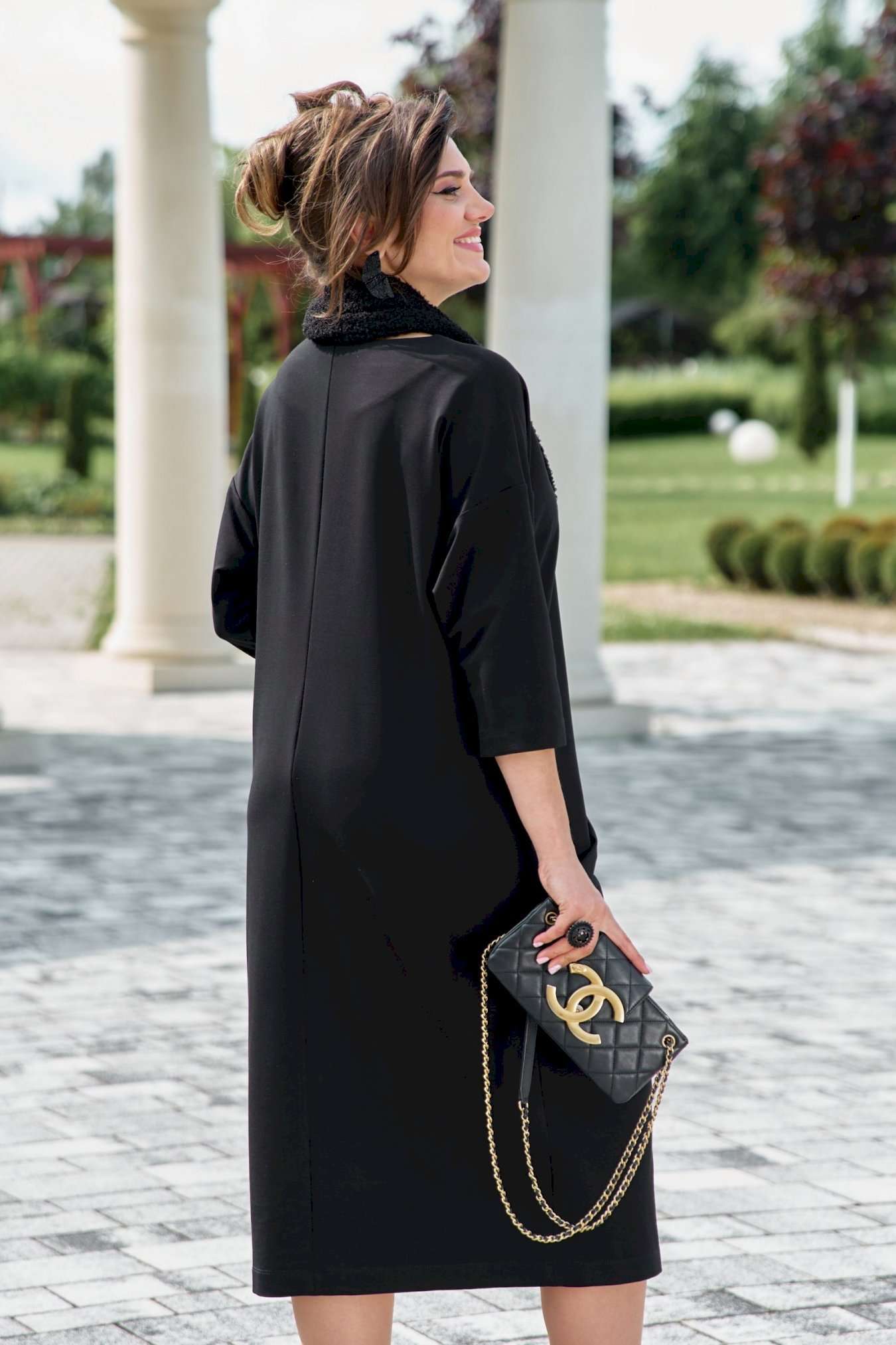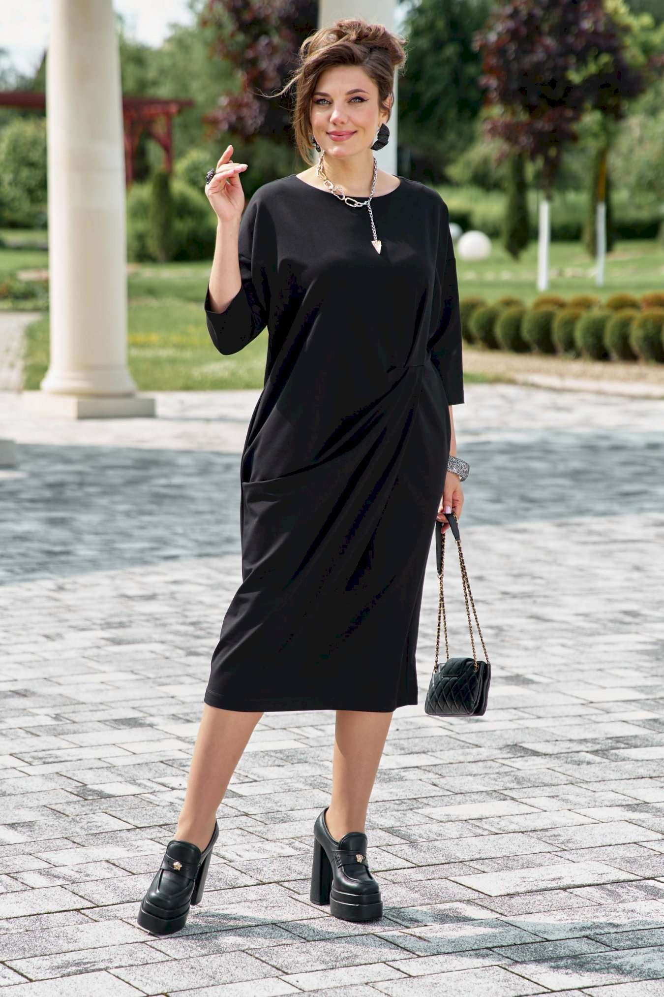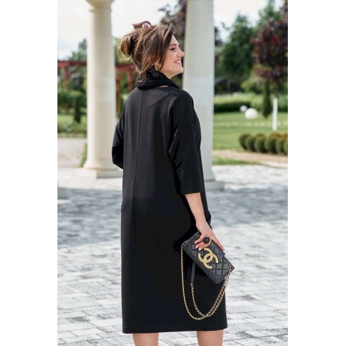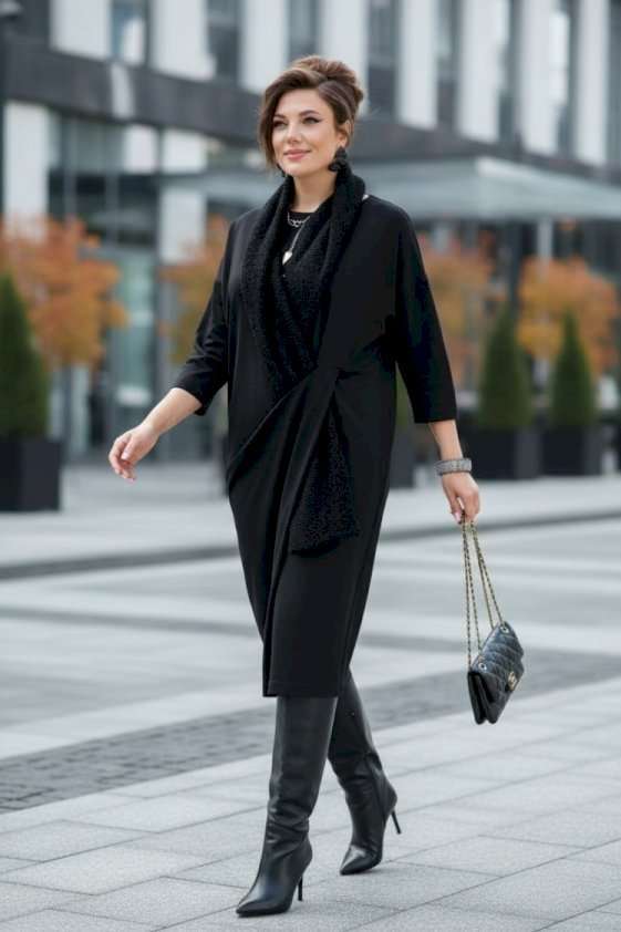 Если Вы ищете идеальное сочетание стиля и комфорта, вот идеальный выбор. Мы специально подобрали качественную и тактильно приятную ткань, которая хорошо держит свою форму, создавая ощущение легкости и свободы движения. Платье свободного силуэта, слегка заужается к низу, с округлой формой горловины, линия плеча спущенная. Главная интрига кроется в декоративной складке в подрезе по переду. Это тщательно продуманный декоративный элемент. Эта складка — свидетельство высокого искусства кройки; она добавляет глубину и динамику лаконичному фасону, создавая иллюзию движения даже в неподвижности. Спинка в платье со средним швом. Рукав в платье втачной, длиной 7/8. Но кульминацией образа становится отдельный декоративный элемент. Шарф, идущий в комплекте, драпируется на шее, являясь частью наряда. Он создаёт завершающий образ.Вместе с платьем они создают диалог текстуры и формы, тем самым завершая образ. Гладкое, платье служит идеальным холстом для струящейся драпировки шарфа. Длина платья 116 см (р.52-56), 117 см (р.58-62), длина рукава 31 см (р.52-56), 30 см (р.58-62).