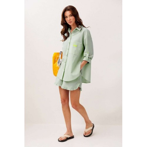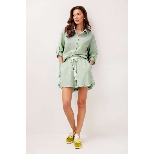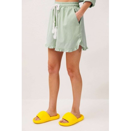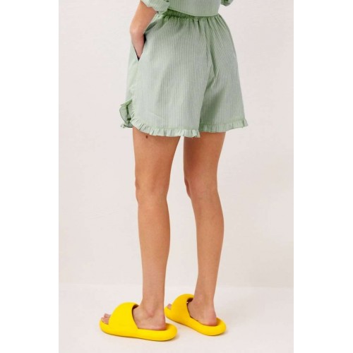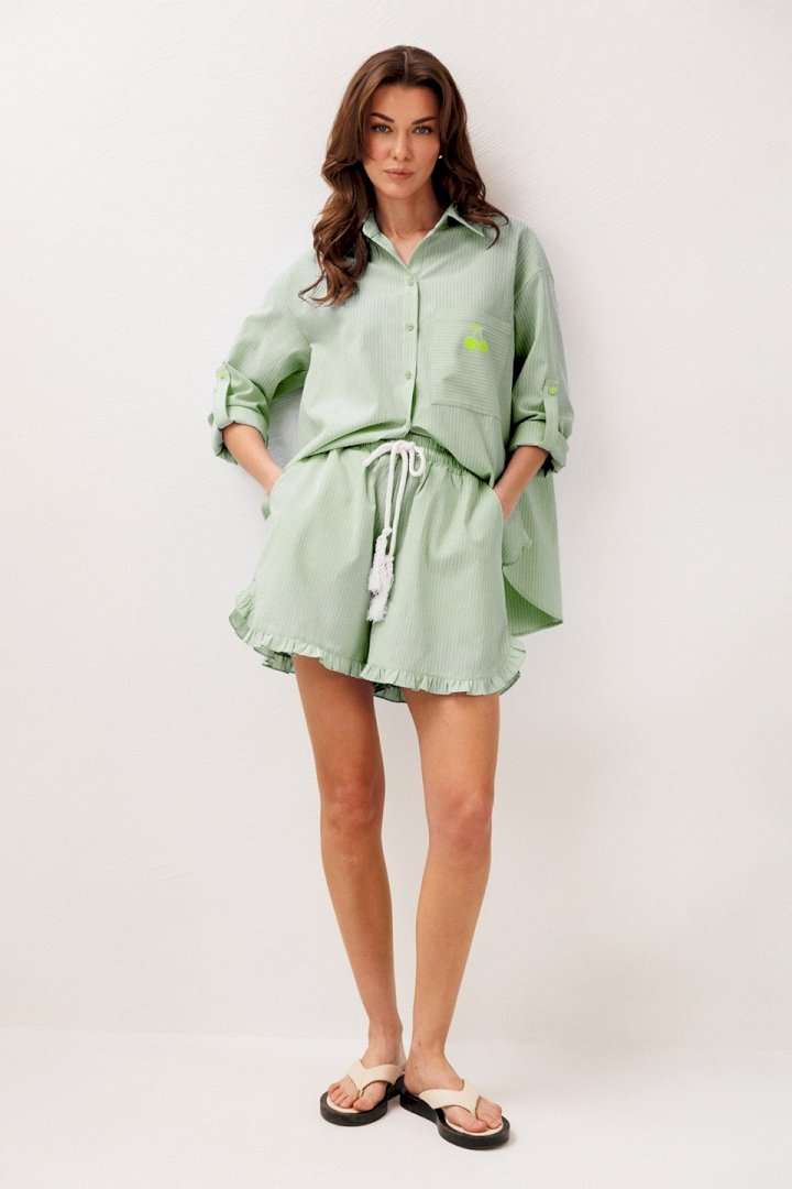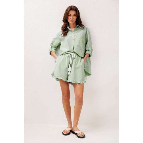 Шорты хлопковые на притачном отстроченном поясе со втянутым в него декоративным шнурком. По переду карманы в боковых швах с наклонным входом. Низ шорт фигурный и по низу притачена рюша.