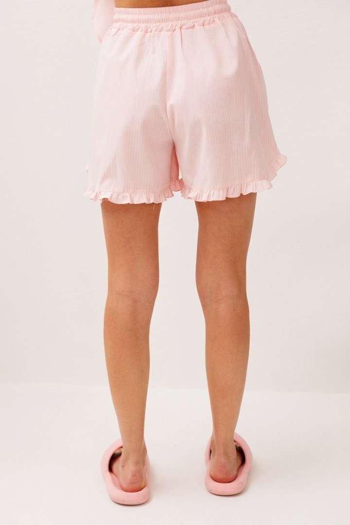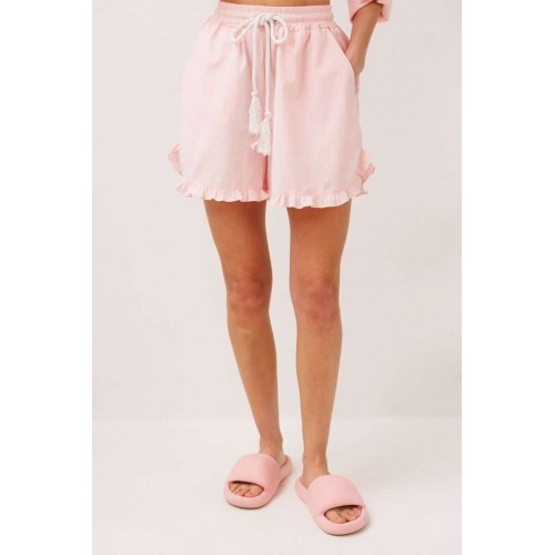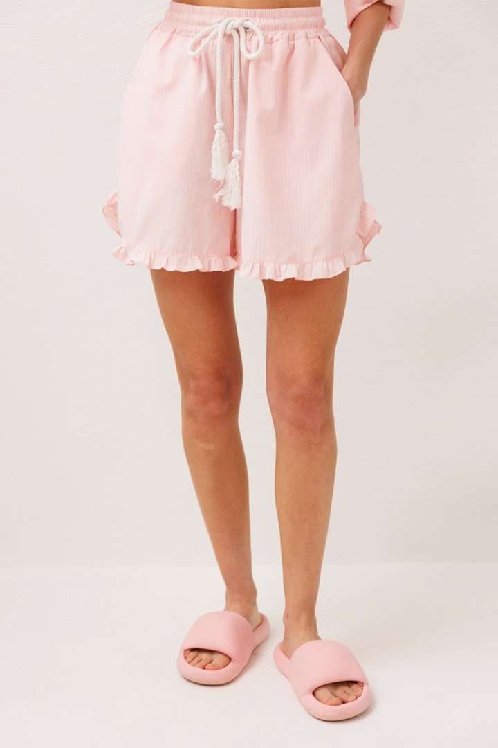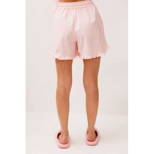 Шорты хлопковые на притачном отстроченном поясе со втянутым в него декоративным шнурком. По переду карманы в боковых швах с наклонным входом. Низ шорт фигурный и по низу притачена рюша.