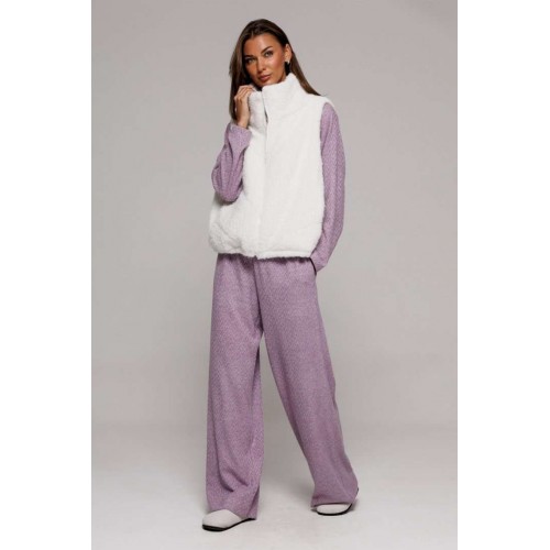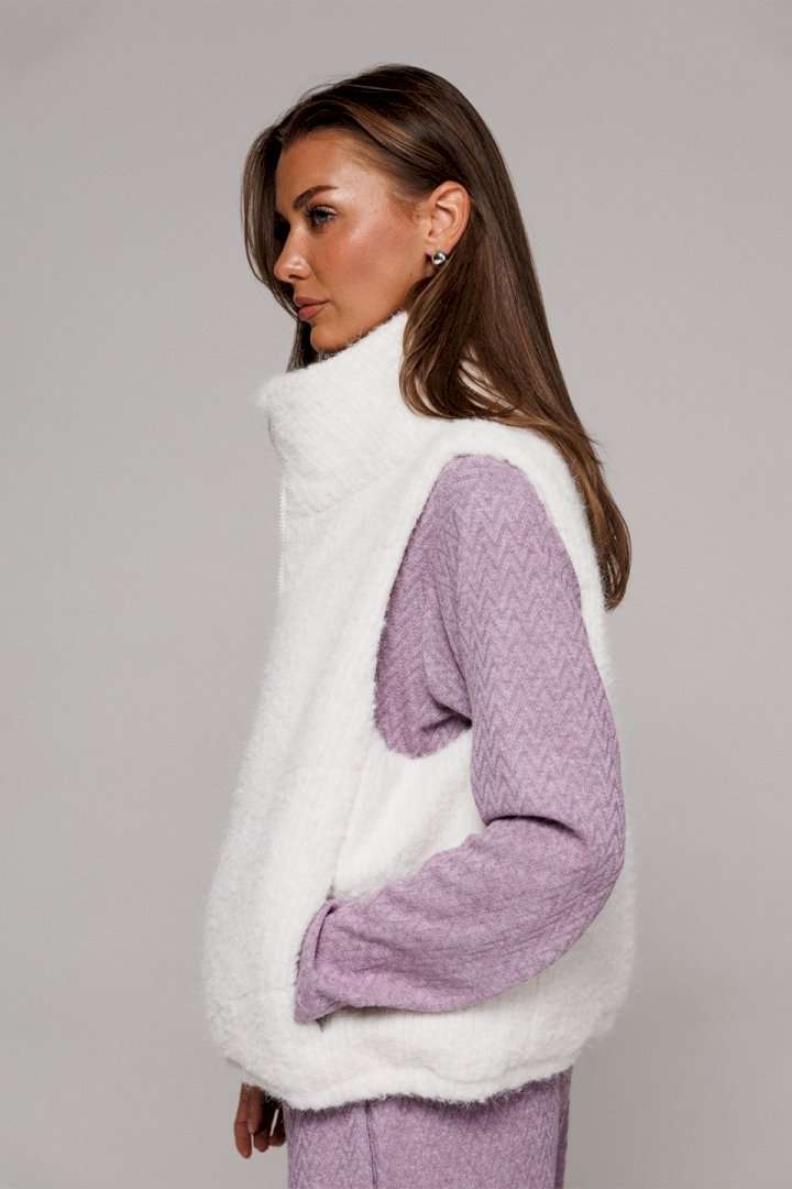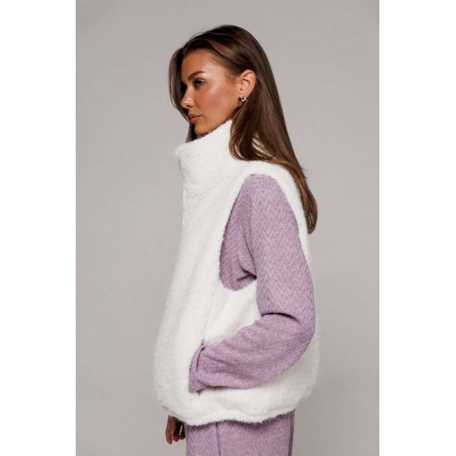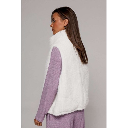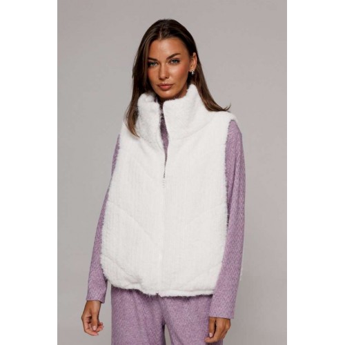 Жилет короткий свободного силуэта, слегка заужен к низу. Полочка с центральной застежкой на тесьму-молнию, с отрезным бочком и карманом в шве притачивания бочка. По низу жилета вставлена эластичная тесьма с фиксатором на спинке. Воротник - стойка. Жилет из трикотажного полотна с фигурной стежкой на синтепоне (isosoft 150г/м²) и подкладке.
